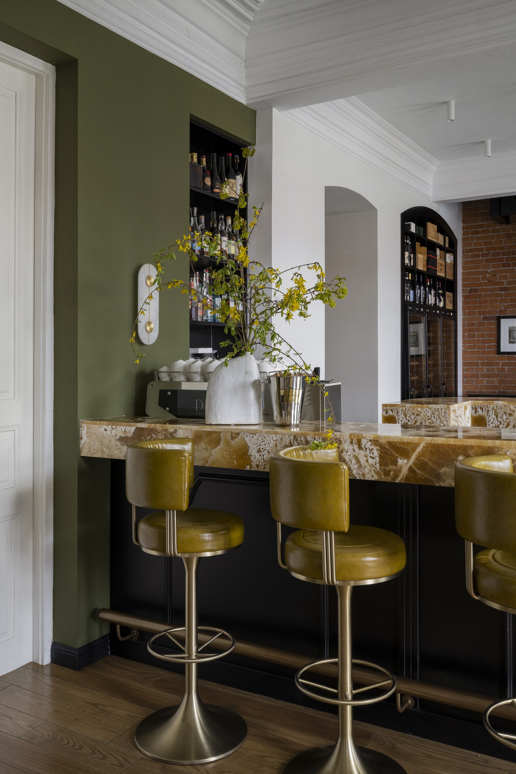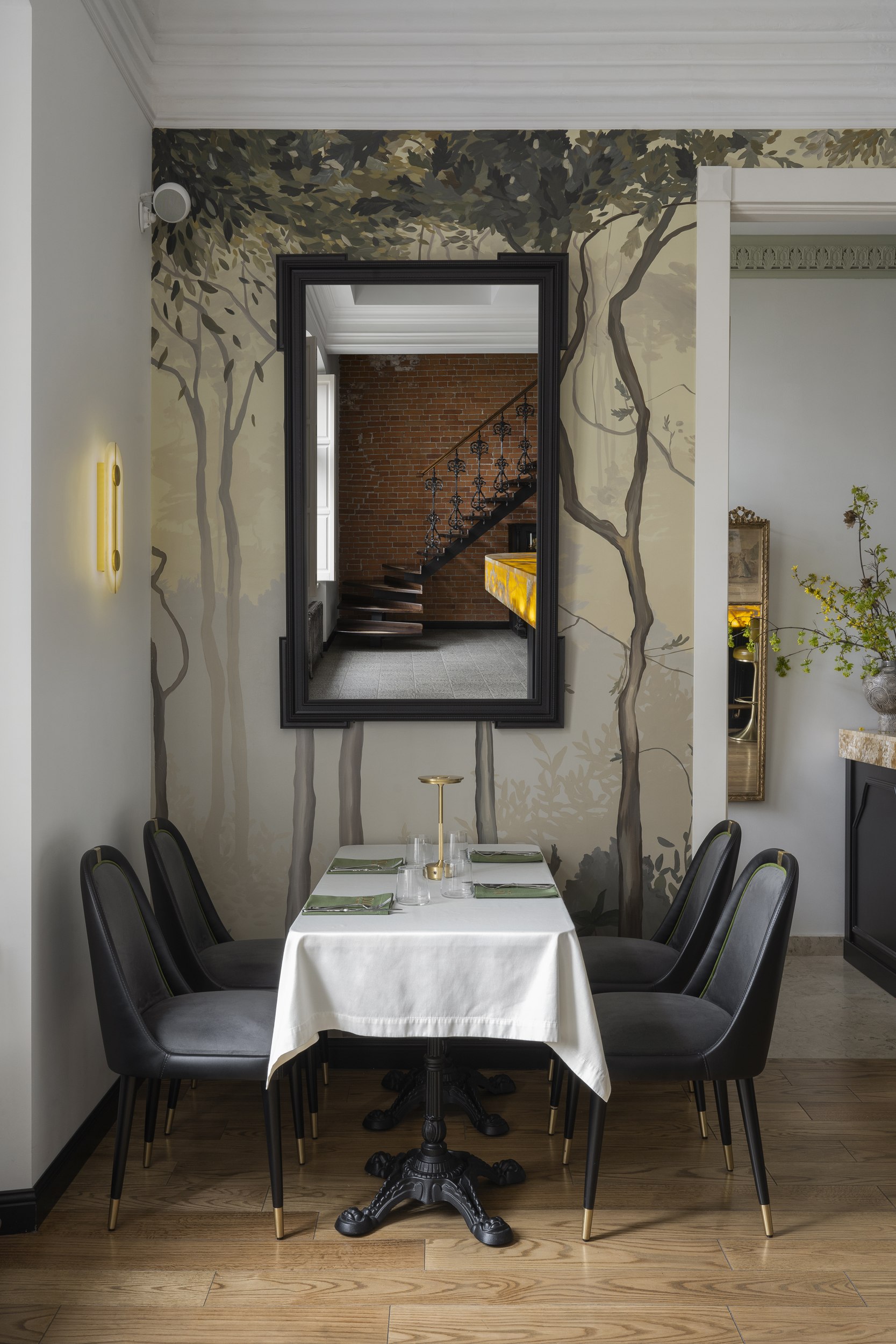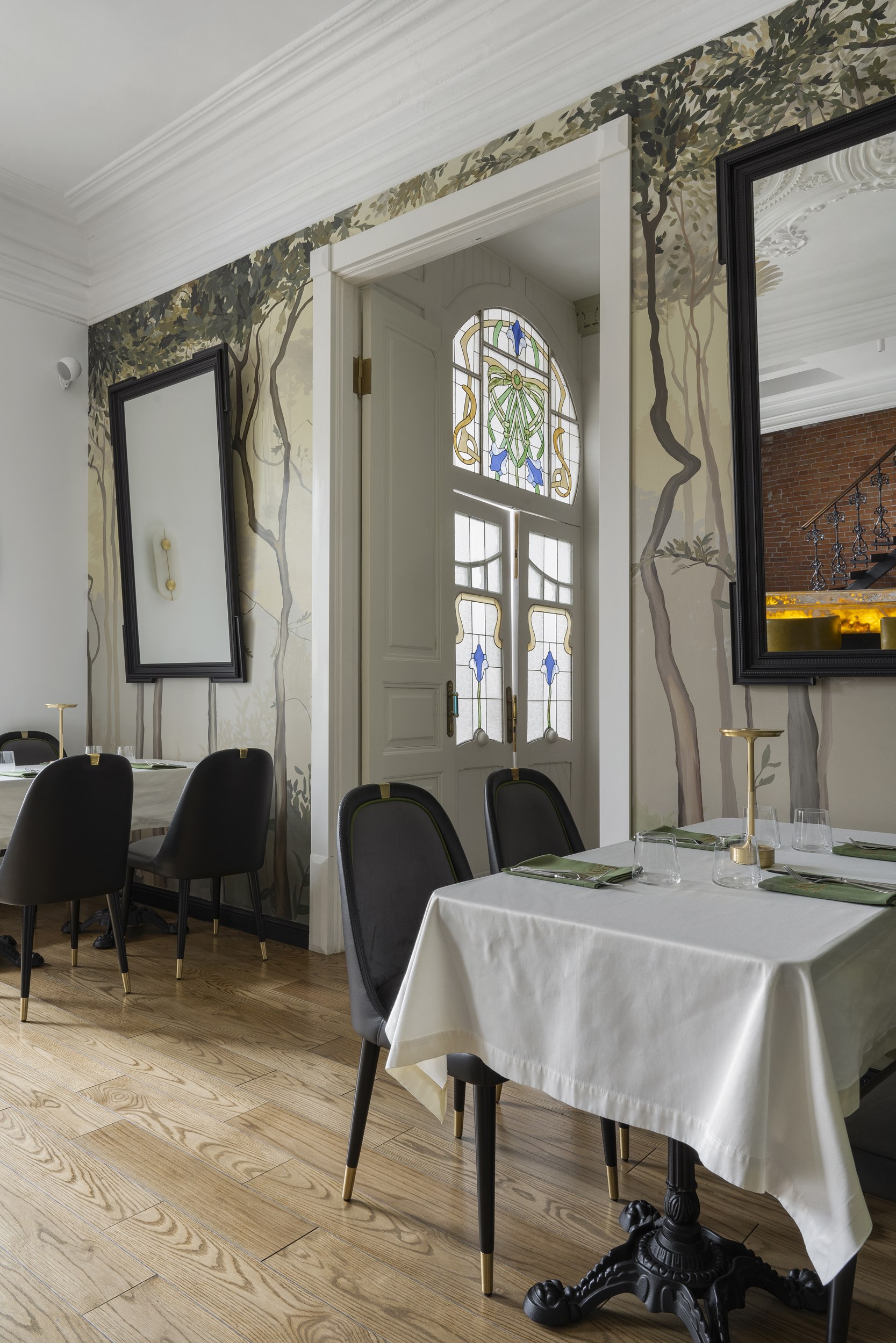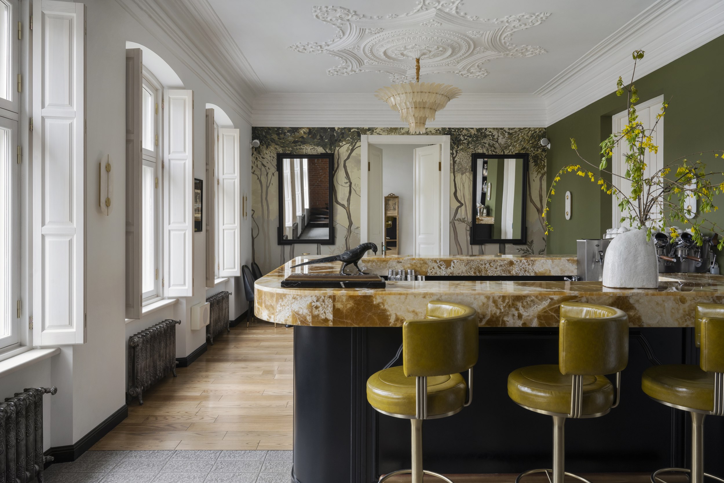Для второго этажа была выбрана гамма, объединяющая историческую кладку с современными элементами. Основой стал сложный зеленый оттенок, уходящий в оливковый при теплом освещении. Он создал базу для декоративного приема – настенной росписи, условного «сада». Эскиз разрабатывался совместно с художниками и включал тонкие переходы зеленого, голубоватого и коричневого, тщательно выверенные по балансу и насыщенности. Отдельные оттенки перекочевали на элементы лепнины и карнизы, формируя единую композиционную систему.