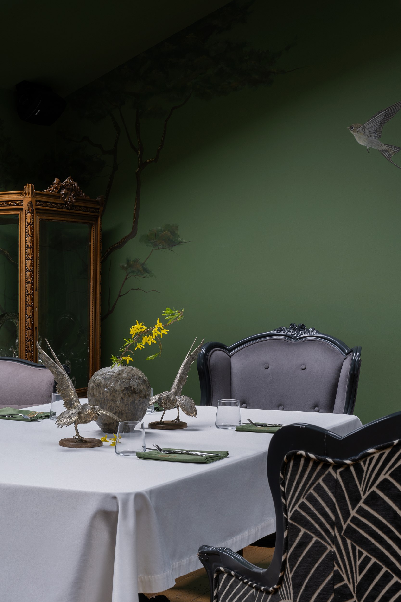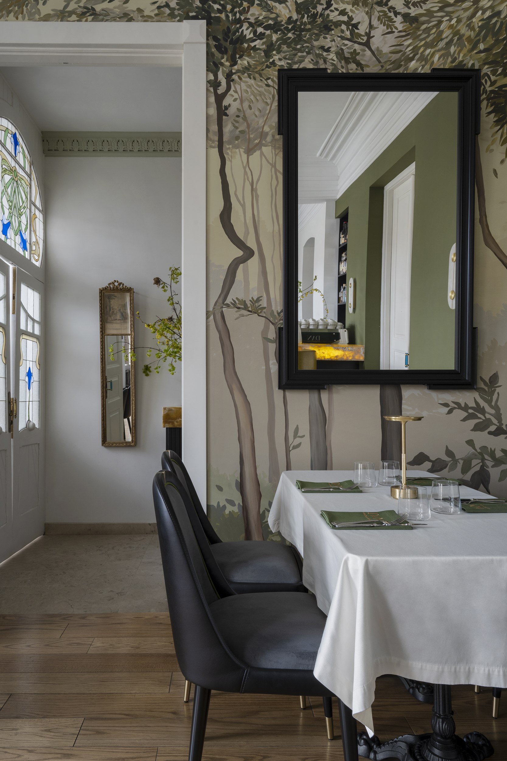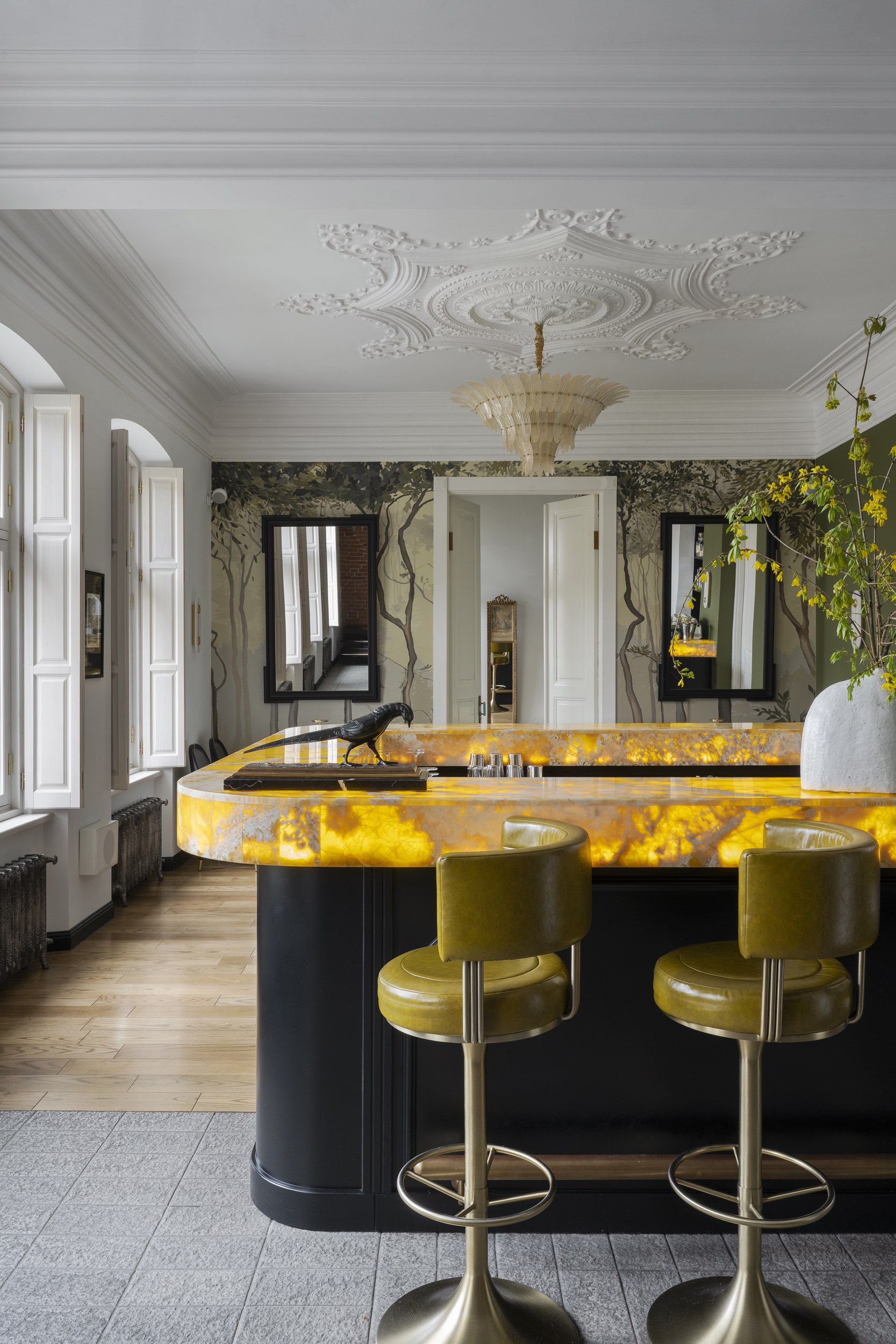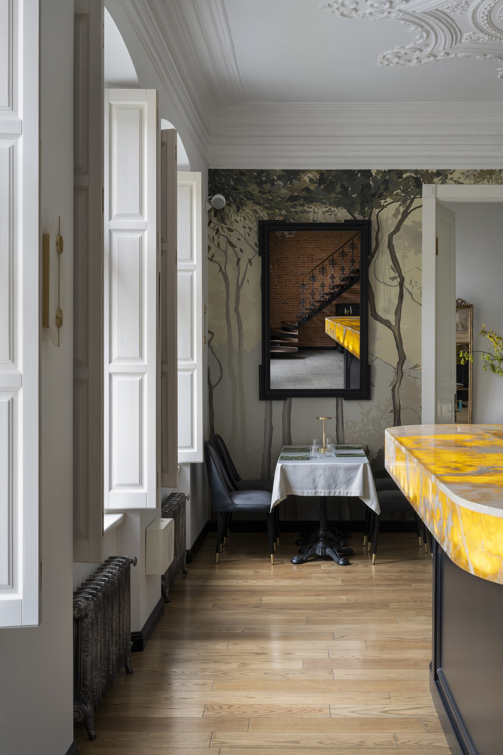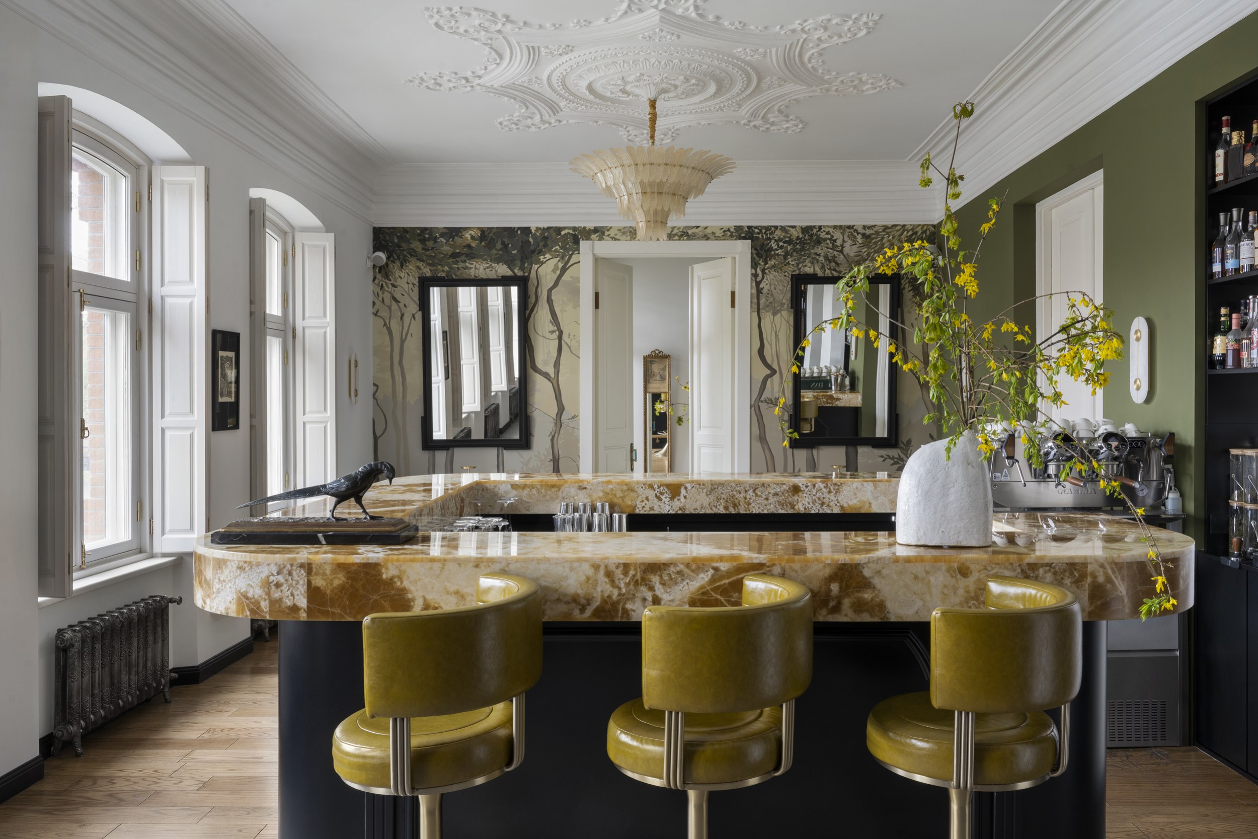 Для второго этажа была выбрана гамма, объединяющая историческую кладку с современными элементами. Основой стал сложный зеленый оттенок, уходящий в оливковый при теплом освещении. Он создал базу для декоративного приема – настенной росписи, условного «сада». Эскиз разрабатывался совместно с художниками и включал тонкие переходы зеленого, голубоватого и коричневого, тщательно выверенные по балансу и насыщенности. Отдельные оттенки перекочевали на элементы лепнины и карнизы, формируя единую композиционную систему.