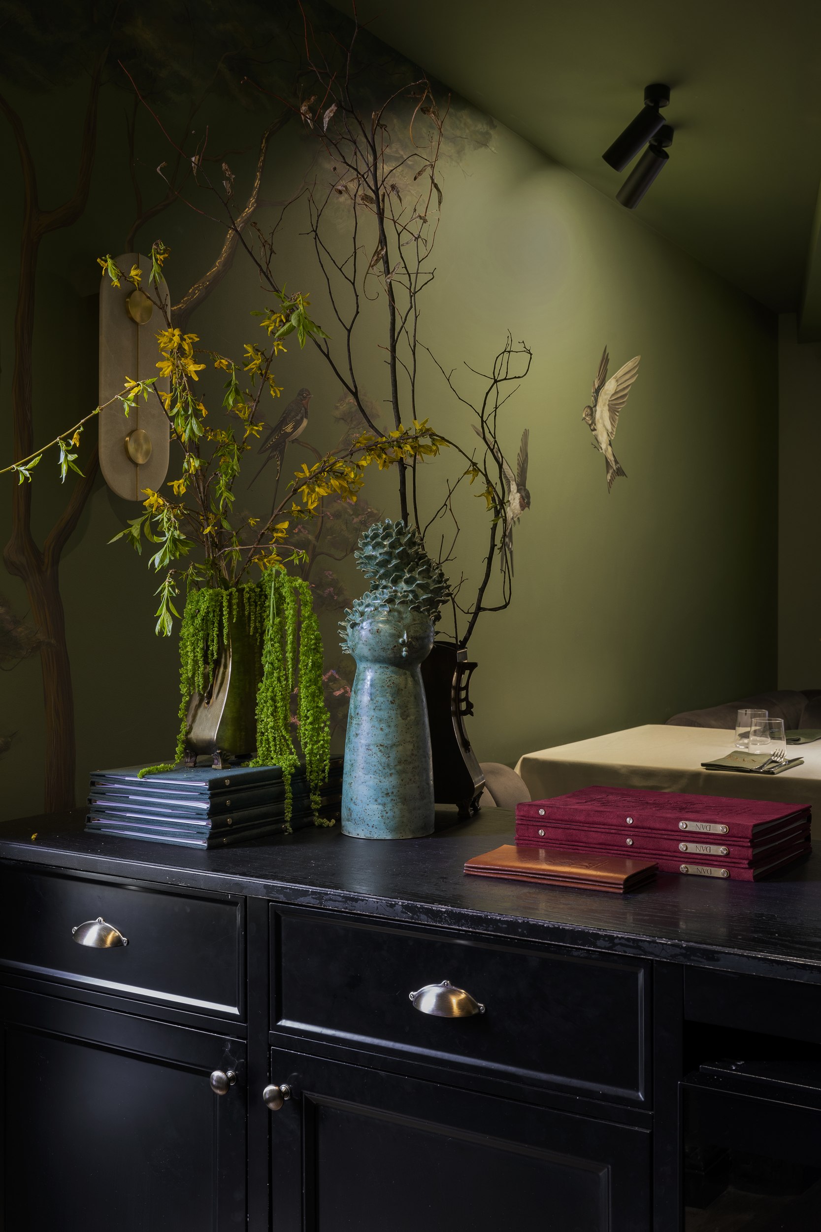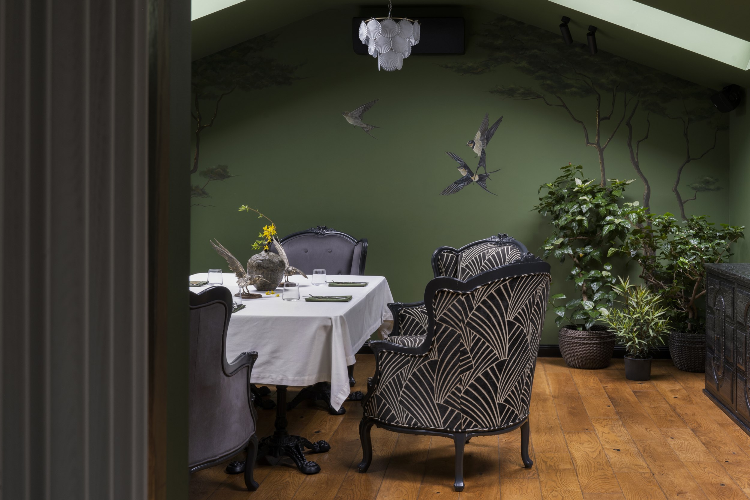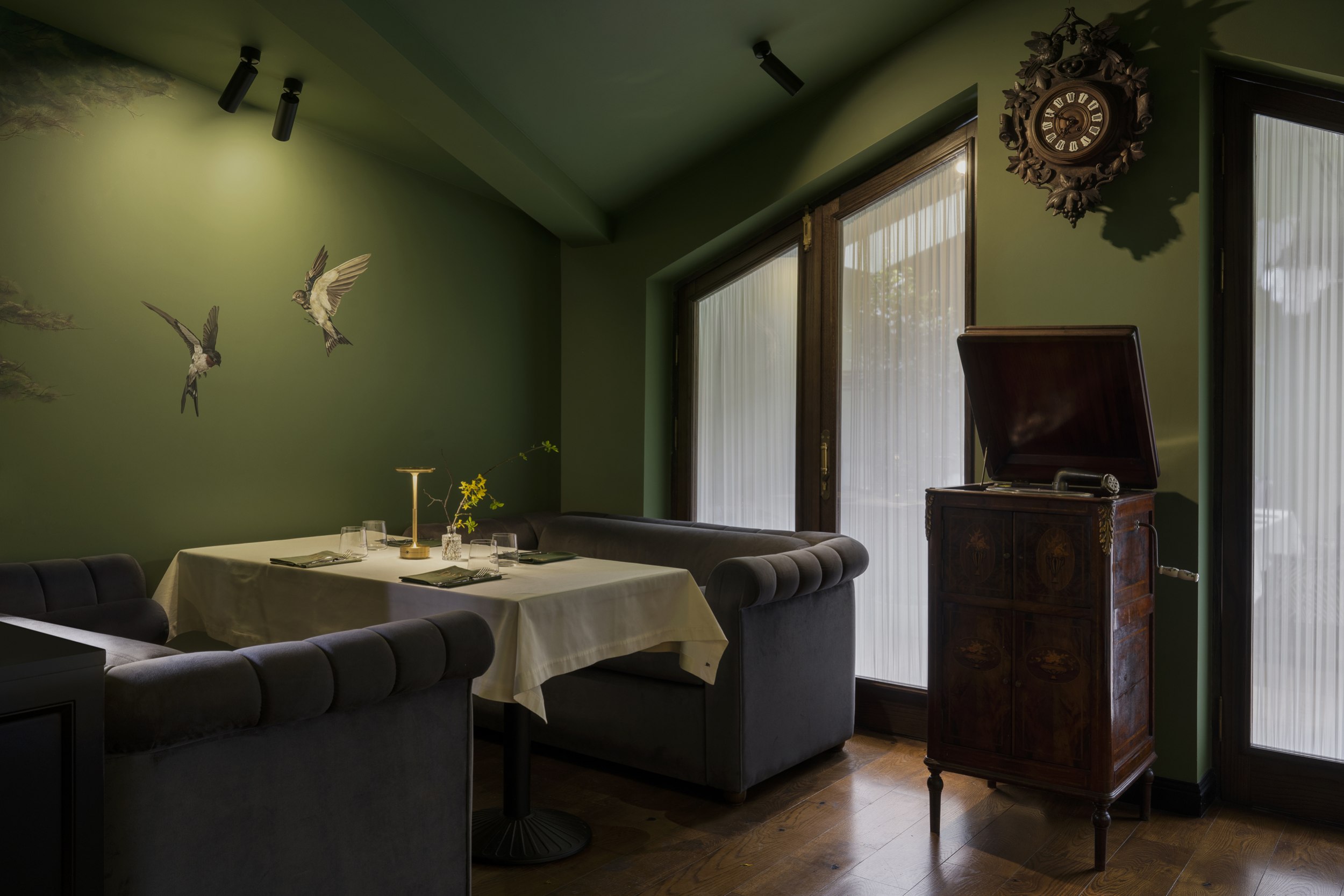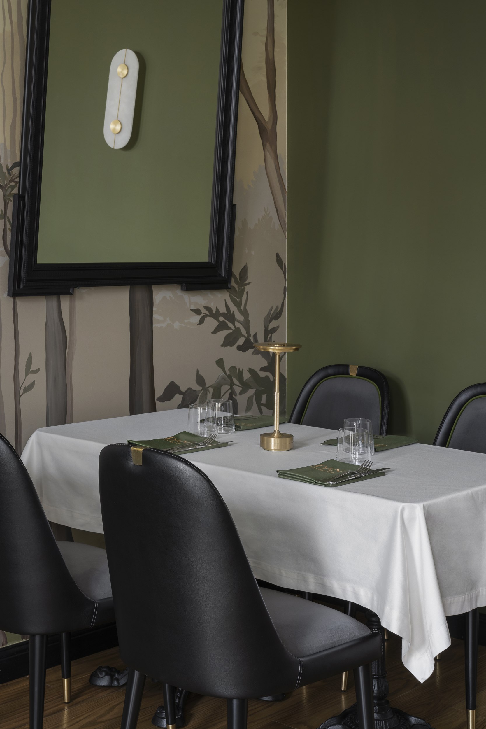 Для второго этажа была выбрана гамма, объединяющая историческую кладку с современными элементами. Основой стал сложный зеленый оттенок, уходящий в оливковый при теплом освещении. Он создал базу для декоративного приема – настенной росписи, условного «сада». Эскиз разрабатывался совместно с художниками и включал тонкие переходы зеленого, голубоватого и коричневого, тщательно выверенные по балансу и насыщенности. Отдельные оттенки перекочевали на элементы лепнины и карнизы, формируя единую композиционную систему.