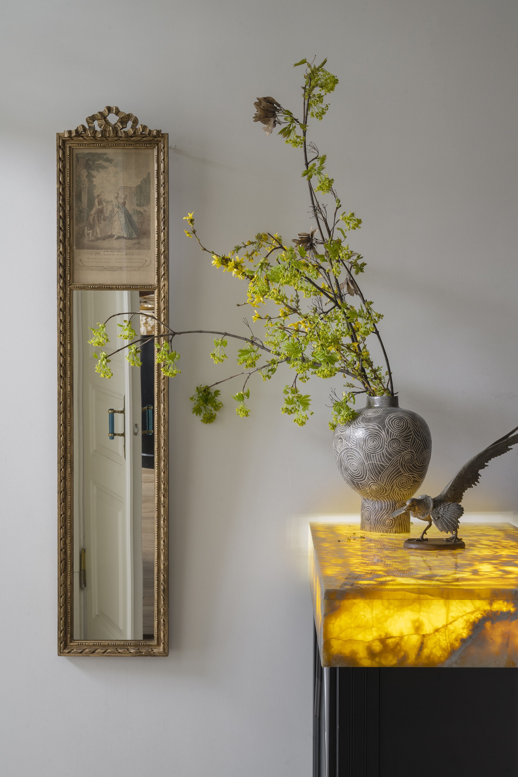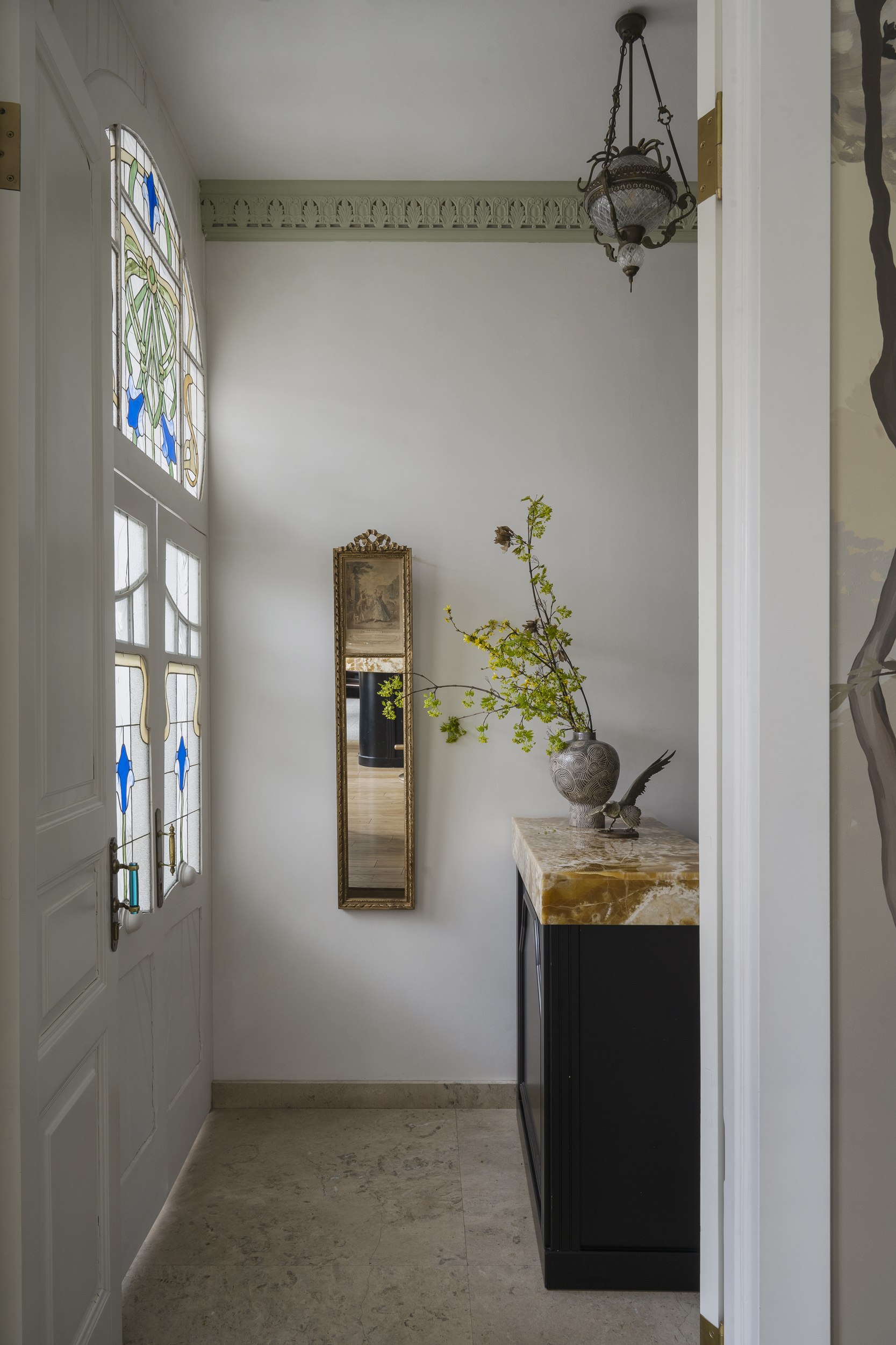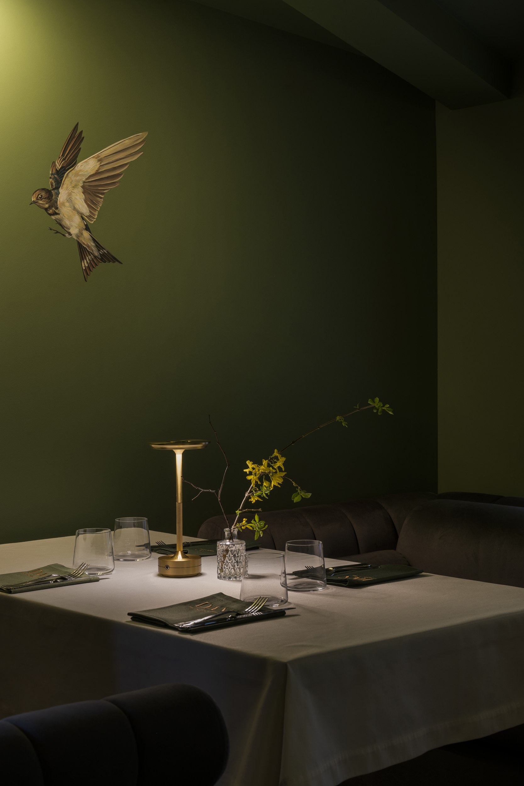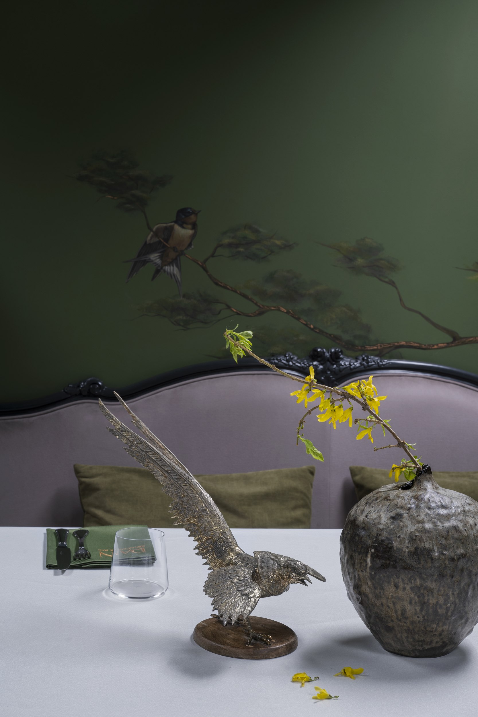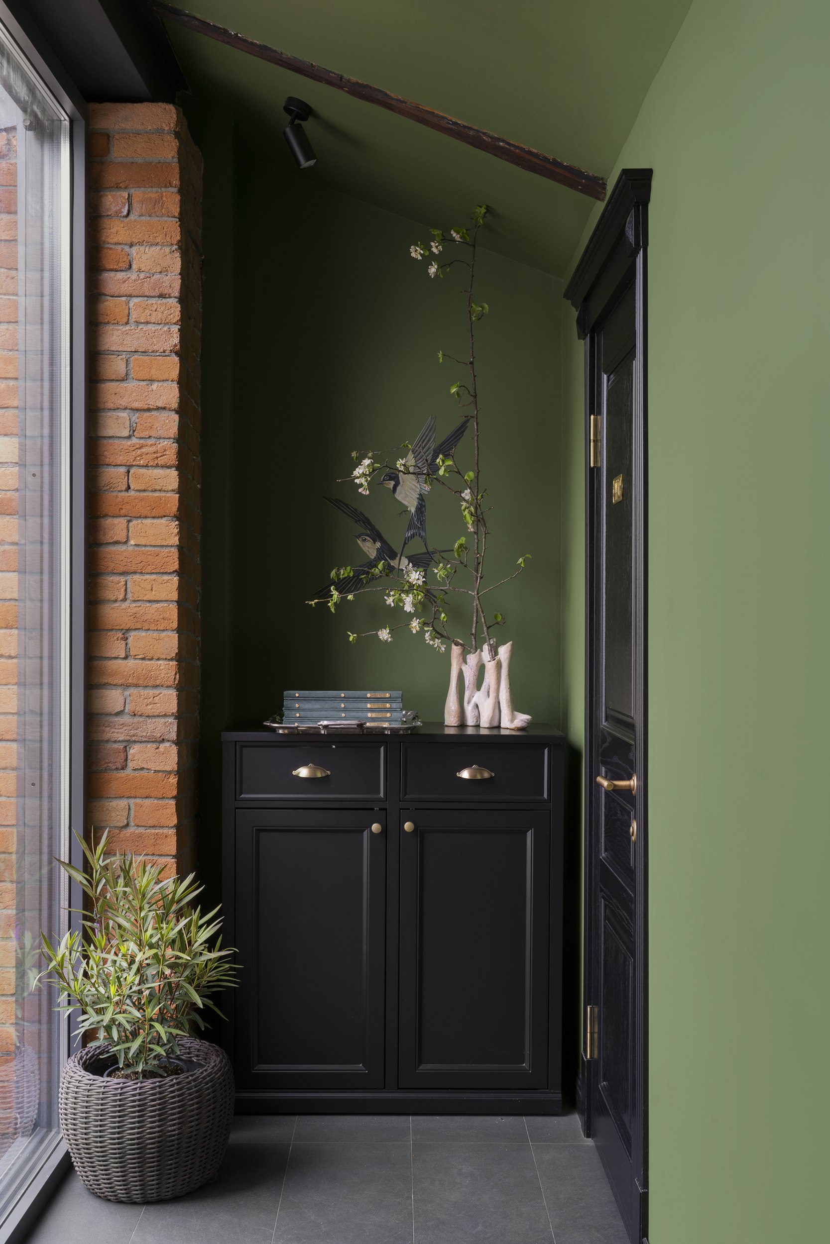 Для второго этажа была выбрана гамма, объединяющая историческую кладку с современными элементами. Основой стал сложный зеленый оттенок, уходящий в оливковый при теплом освещении. Он создал базу для декоративного приема – настенной росписи, условного «сада». Эскиз разрабатывался совместно с художниками и включал тонкие переходы зеленого, голубоватого и коричневого, тщательно выверенные по балансу и насыщенности. Отдельные оттенки перекочевали на элементы лепнины и карнизы, формируя единую композиционную систему.