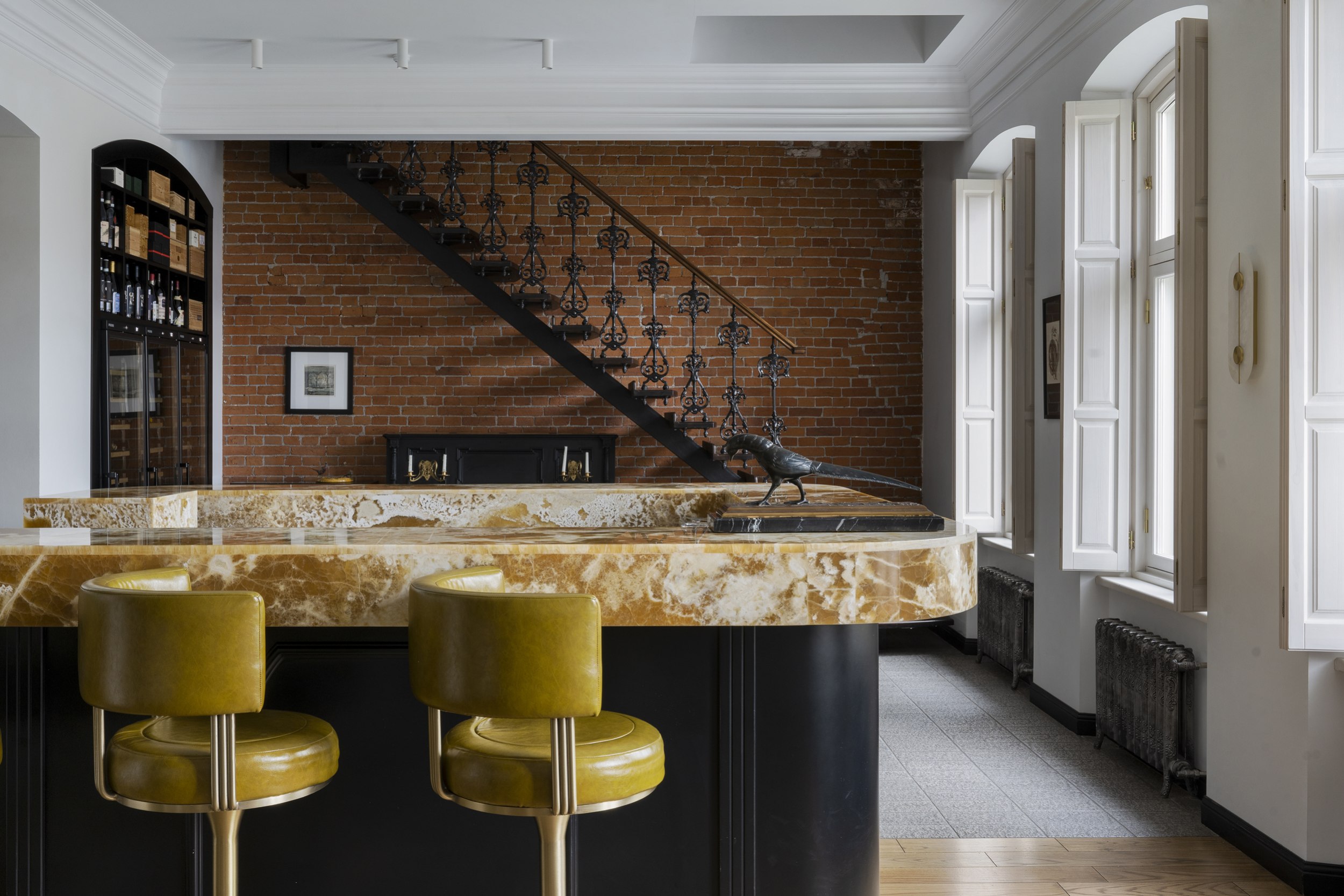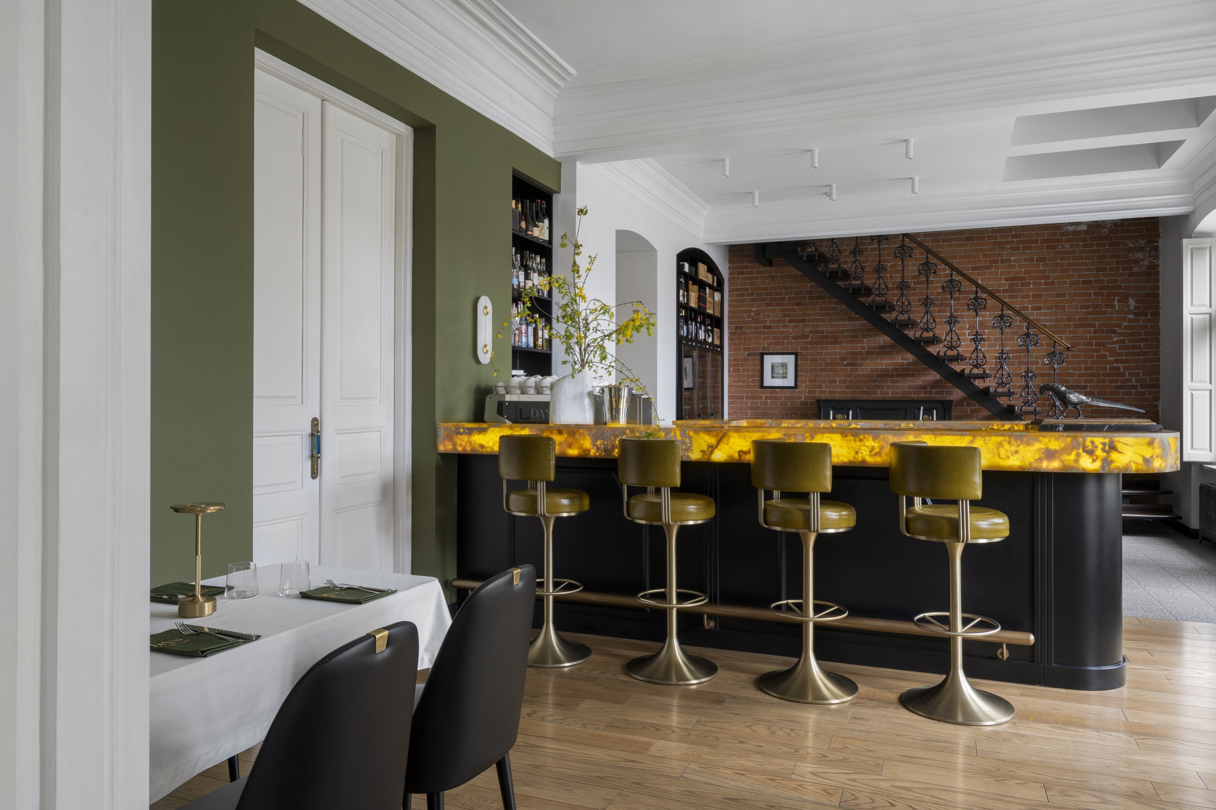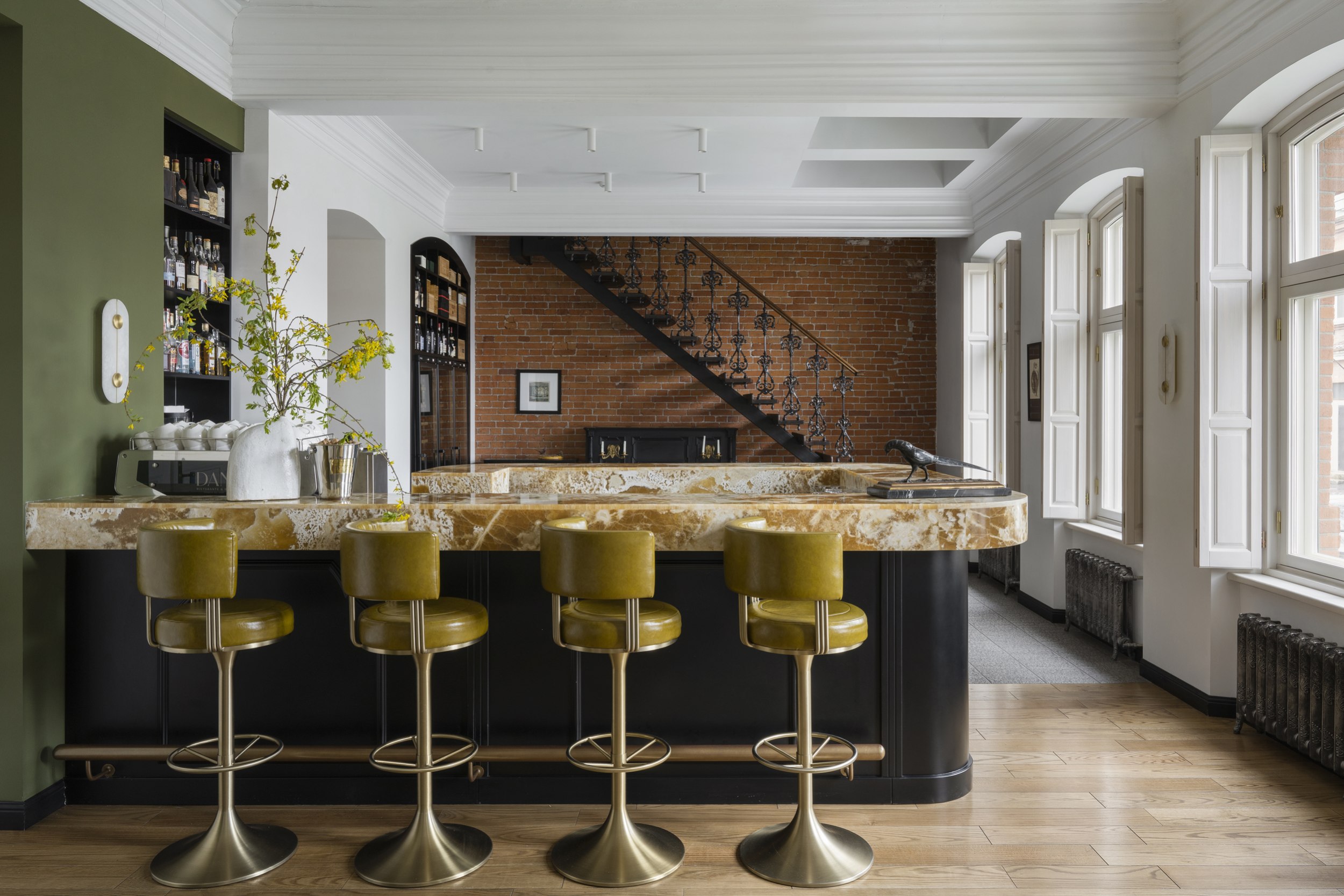 Цветовое и композиционное решение интерьера было продиктовано самим пространством. Сохраненная кирпичная кладка за лестницей стала отправной точкой в формировании палитры. Ее натуральный оттенок требовал мягкого визуального контраста, поэтому основное пространство первого этажа решено в светлых тонах: белые потолки и стены обеспечили ощущение легкости и воздуха, визуально увеличив объем помещения. Белый фон подчеркнул текстуру кирпича, сохранил исторический характер и позволил выделить современный акцентный бар в центре зала, выполняющий как функциональную, так и эстетическую роль.