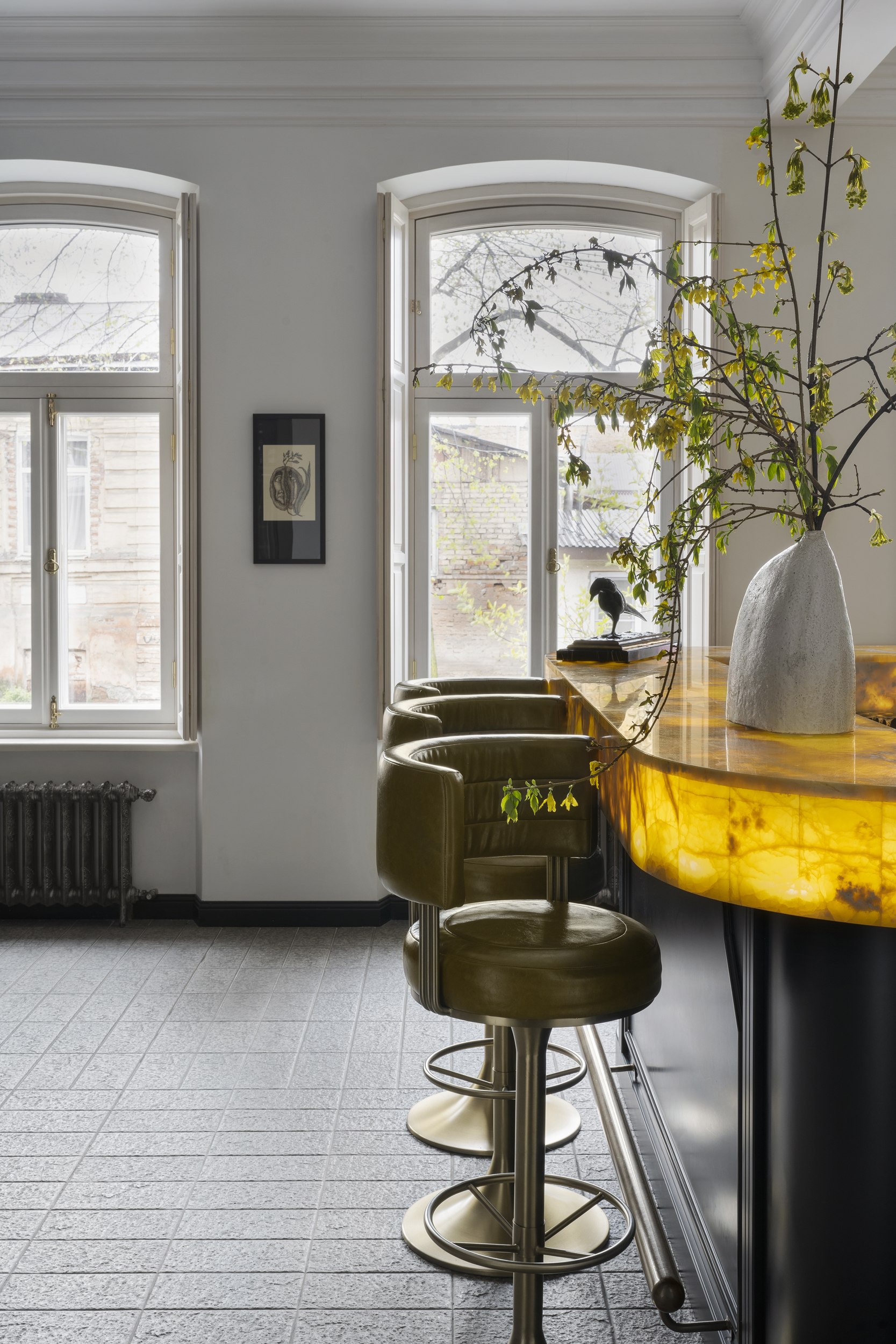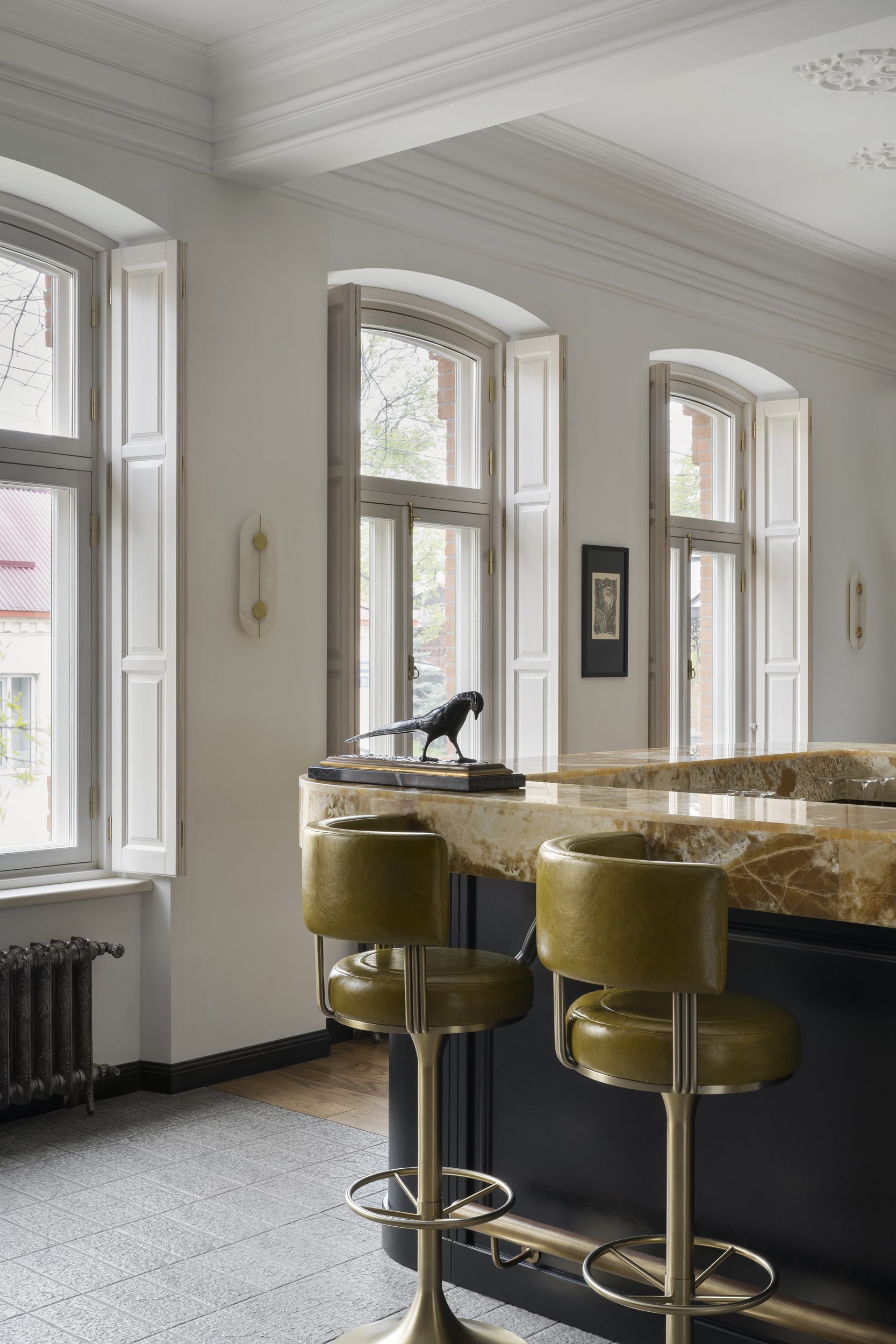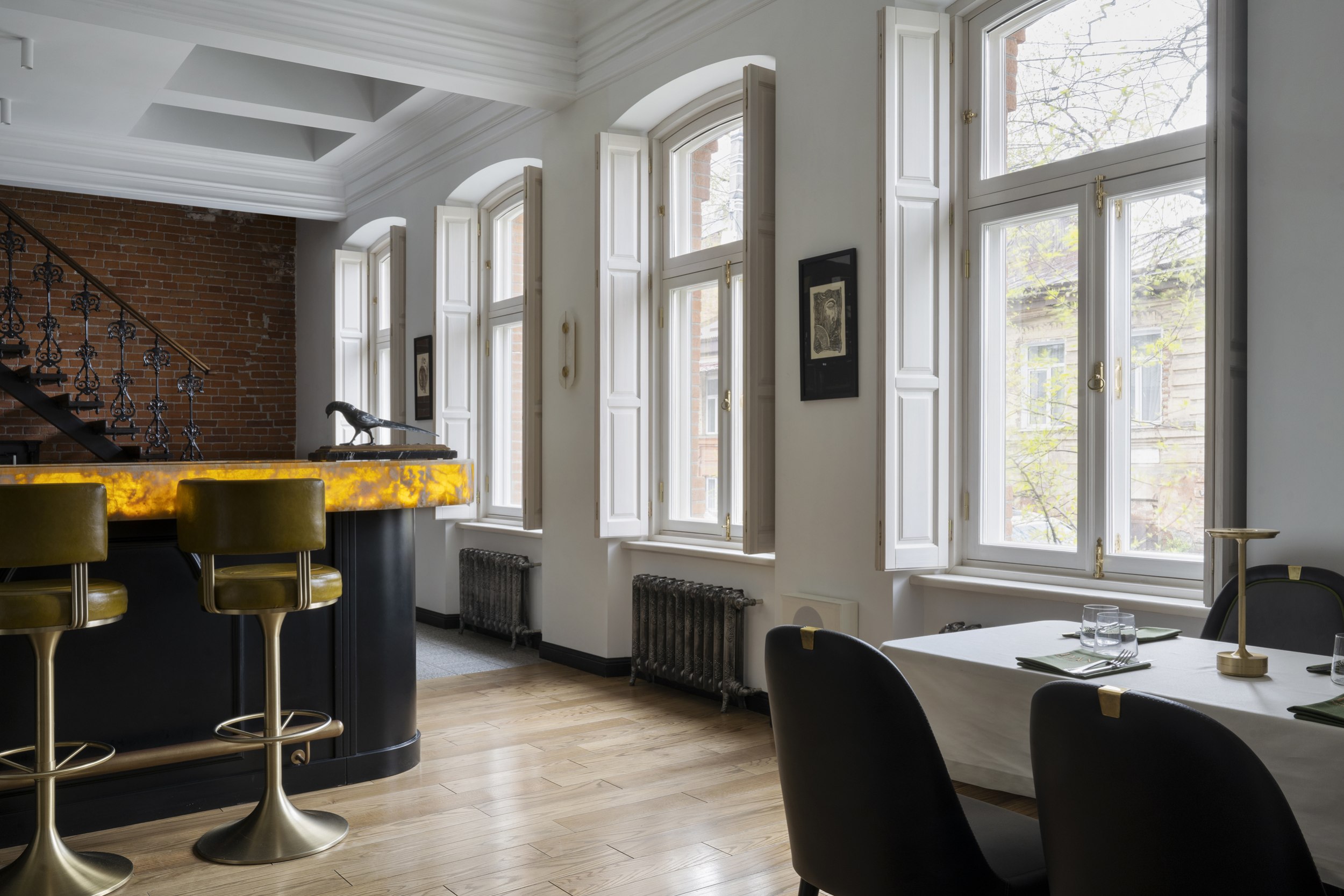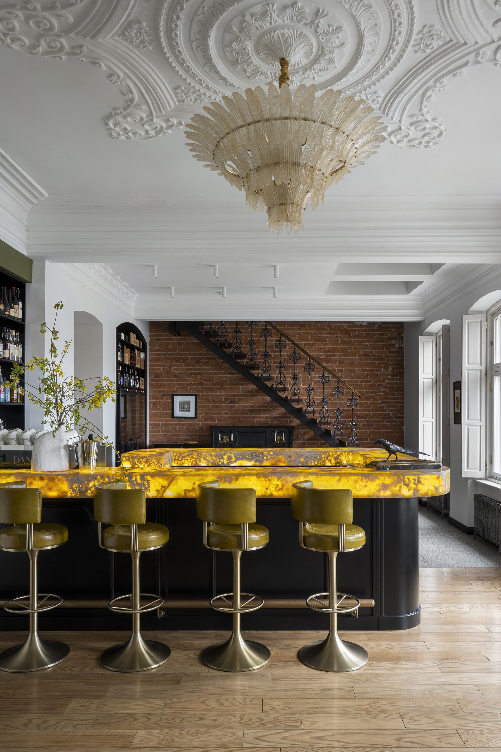 Цветовое и композиционное решение интерьера было продиктовано самим пространством. Сохраненная кирпичная кладка за лестницей стала отправной точкой в формировании палитры. Ее натуральный оттенок требовал мягкого визуального контраста, поэтому основное пространство первого этажа решено в светлых тонах: белые потолки и стены обеспечили ощущение легкости и воздуха, визуально увеличив объем помещения. Белый фон подчеркнул текстуру кирпича, сохранил исторический характер и позволил выделить современный акцентный бар в центре зала, выполняющий как функциональную, так и эстетическую роль.