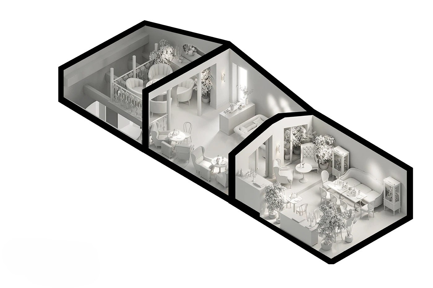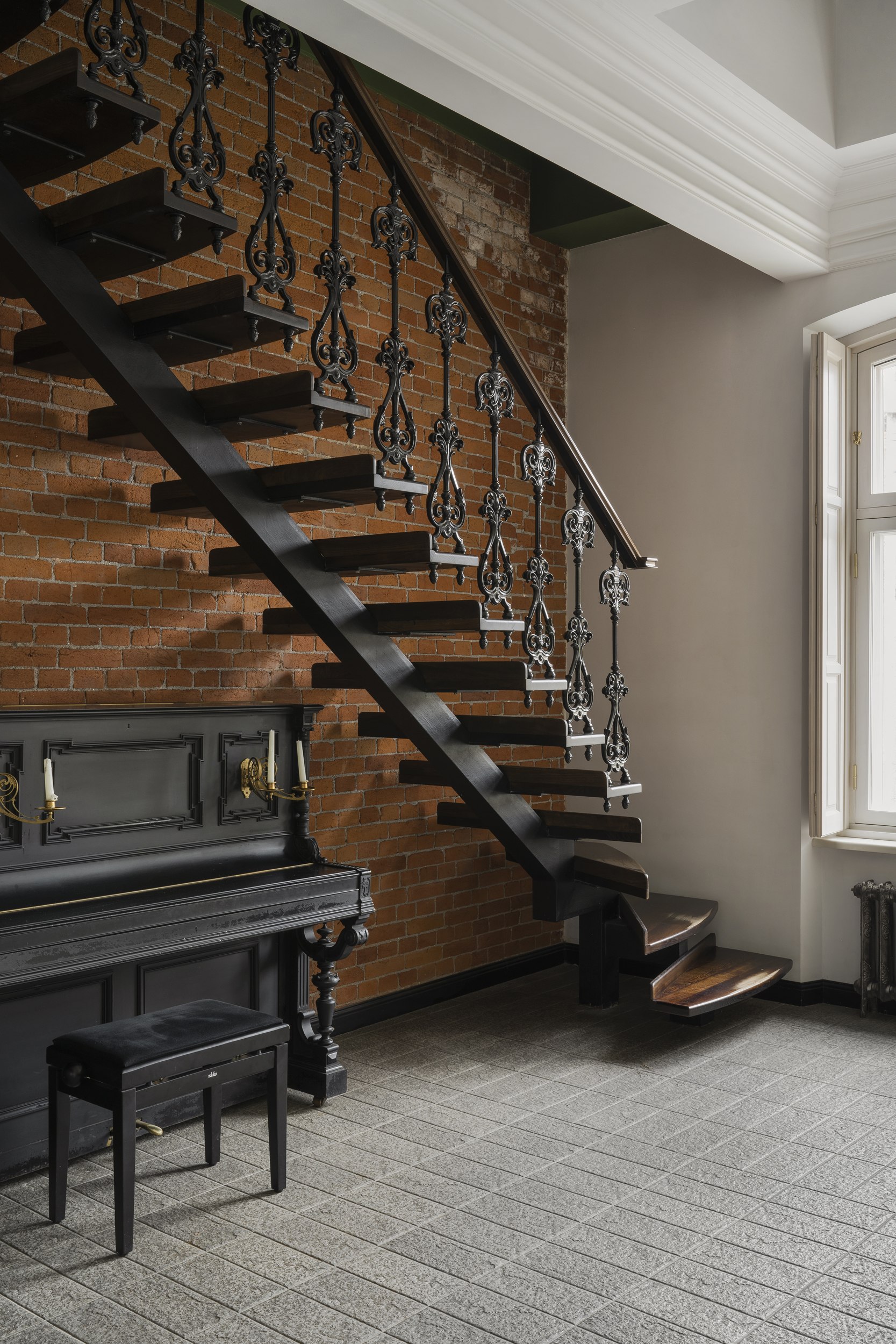 Проект представлял собой многослойную работу с историческим зданием, требовавшую точных инженерных и архитектурных решений. Первым этапом стал демонтаж несущей стены на первом этаже, что потребовало детальной проработки конструктивных узлов. Для обеспечения надежности перекрытия между первым и вторым этажом была установлена массивная несущая балка. Сложность усиливалась тем, что перекрытия деревянные, а сам объект имеет историческую ценность. Благодаря слаженной работе конструкторов и инженеров задача была решена, что позволило перейти к разработке архитектурных и декоративных элементов.