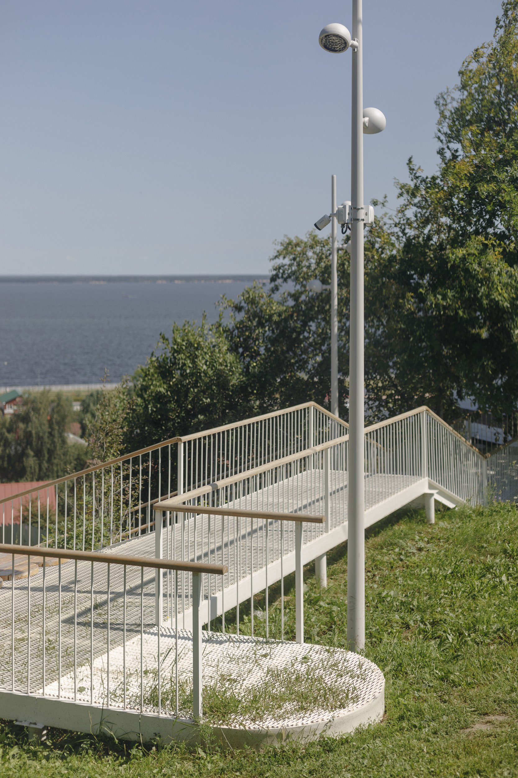 Пролёты разделены небольшими площадками, каждая из которых работает как точка обзора. Вместо одной обзорной зоны здесь появилось несколько – с разными направлениями и ракурсами на город и реку. На верхнем ярусе лестницы обустроен небольшой амфитеатр, где позже установили бинокль для наблюдения за панорамой. Детали – скруглённые балконы смотровых площадок и деревянные поручни – добавляют тепла и тактильности конструктивной системе.