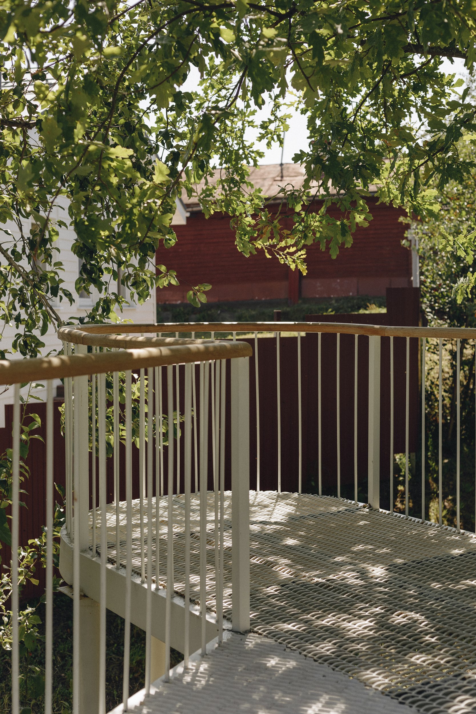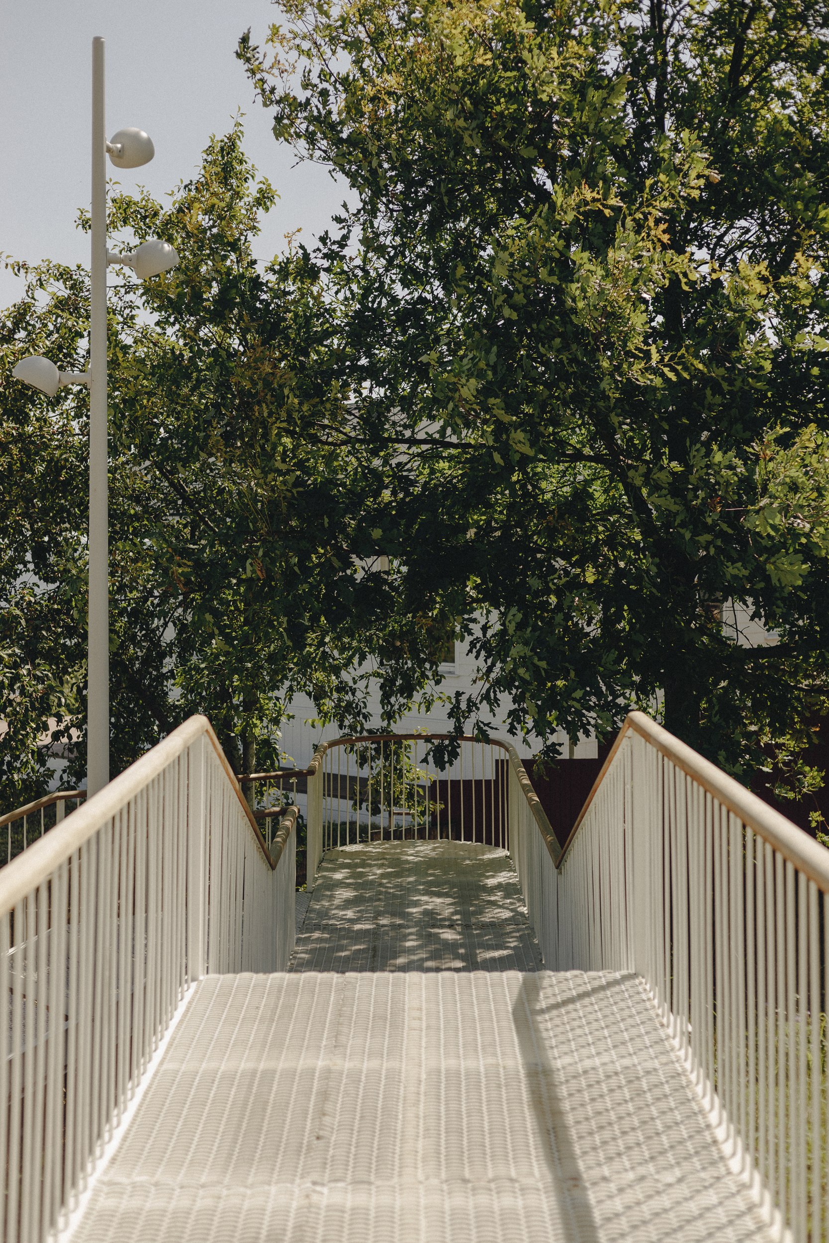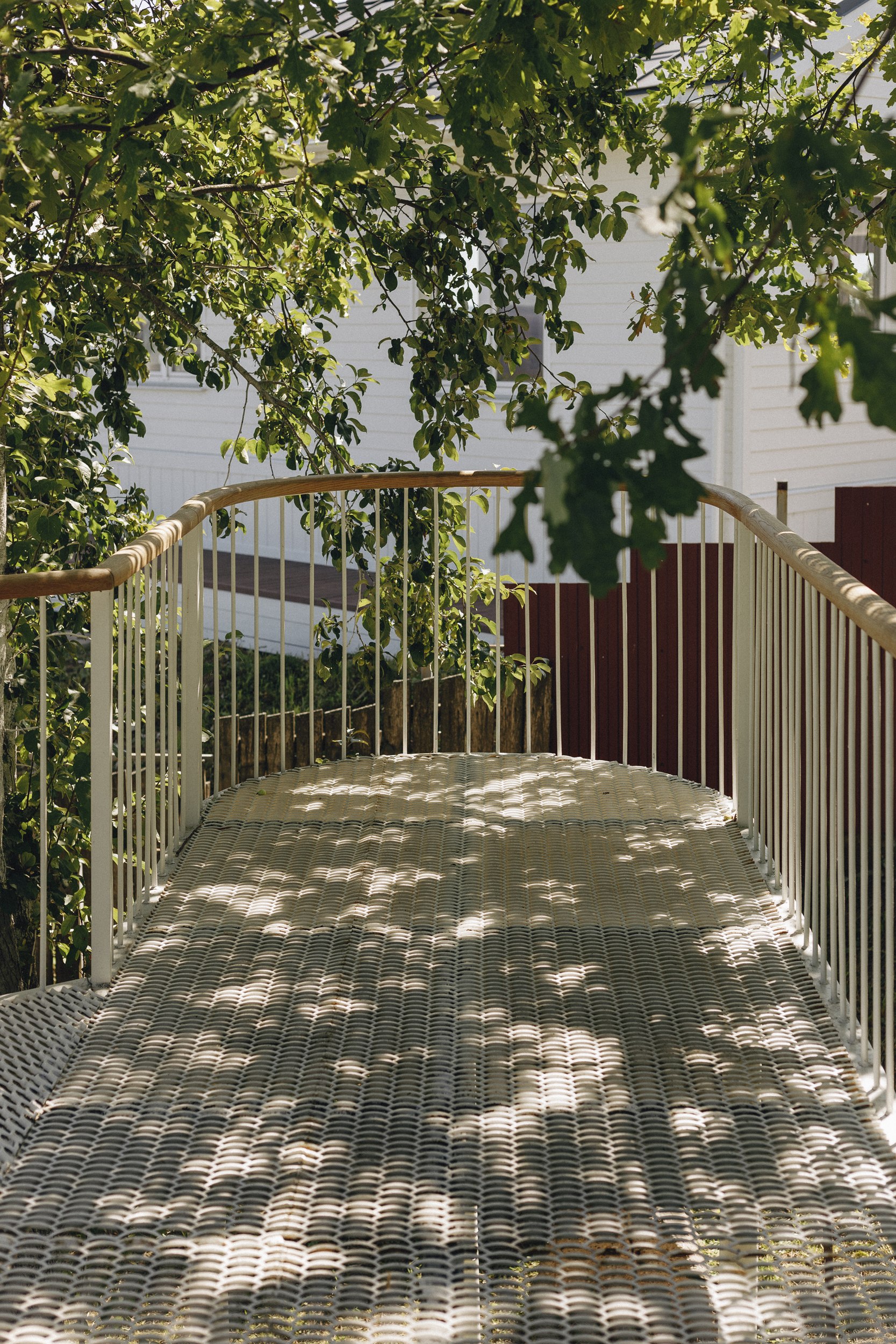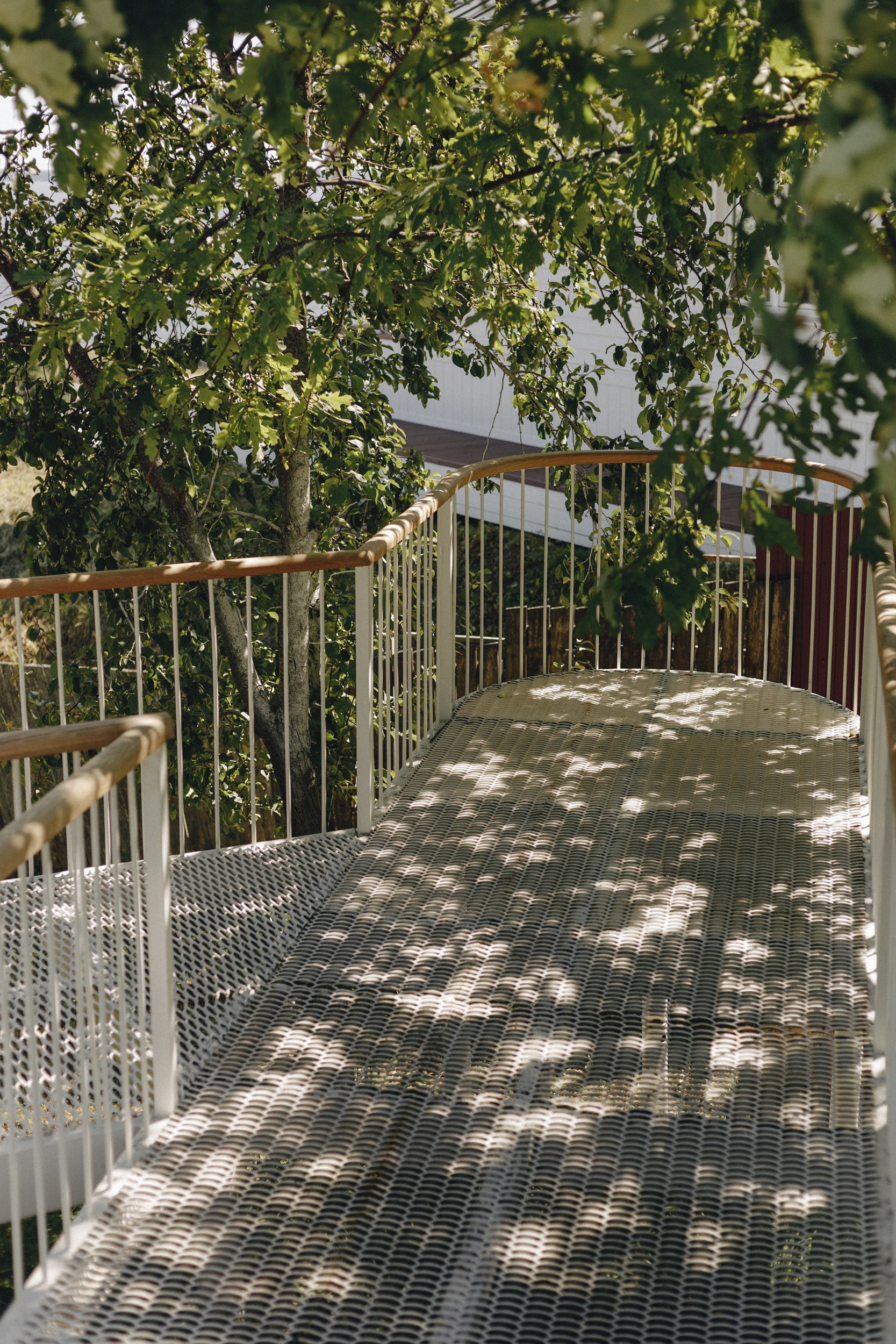 Конструкция выполнена из металла, окрашенного в белый цвет; ажурные ступени из металлической сетки создают ощущение невесомости. Пропорции – ширина маршей и высота ступеней – тщательно рассчитаны для удобного и естественного передвижения. Лестница органично вписана в рельеф: она мягко огибает зоны будущих посадок деревьев, а трава, прорастающая сквозь металлическую структуру, делает её частью ландшафта.