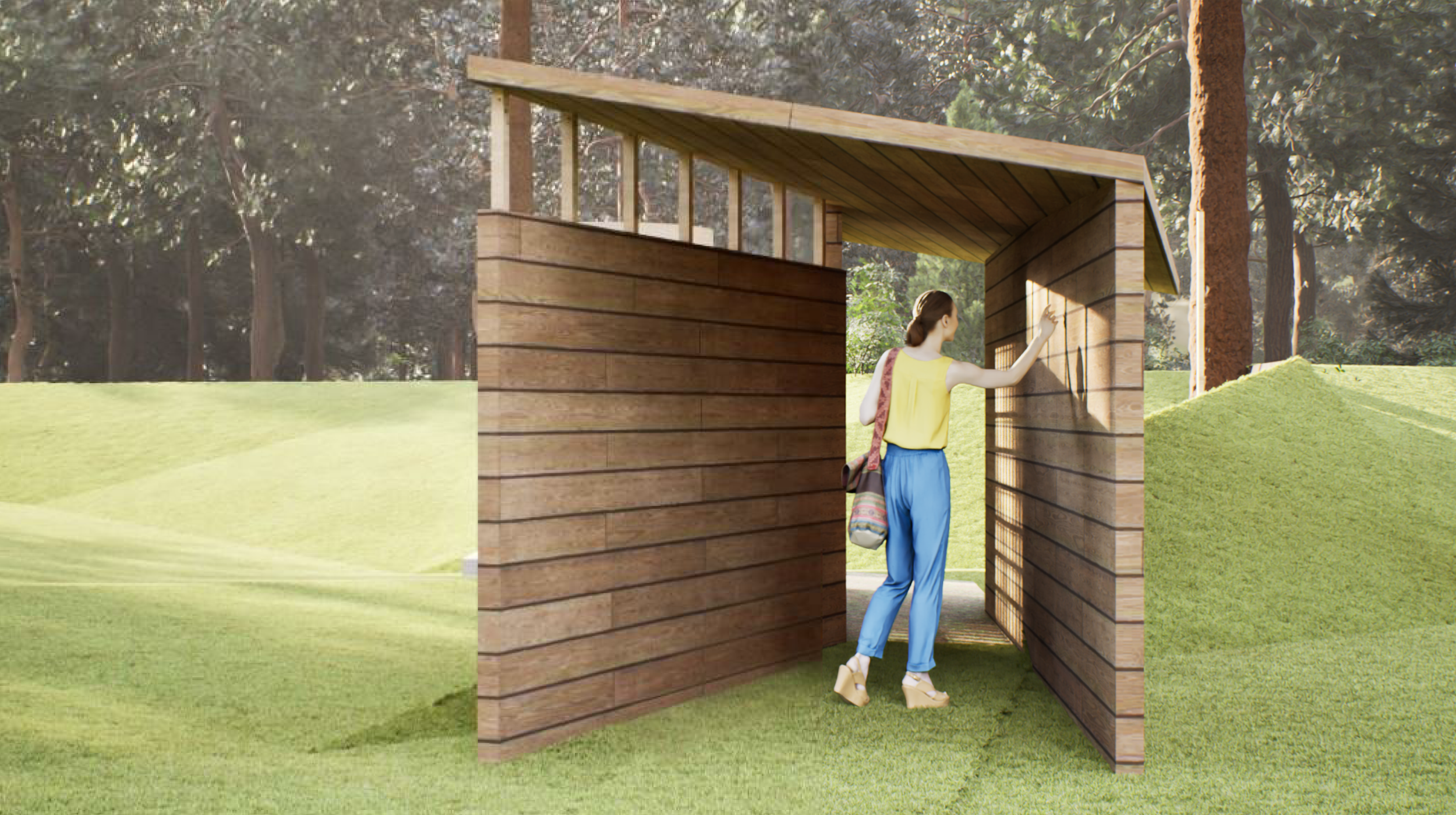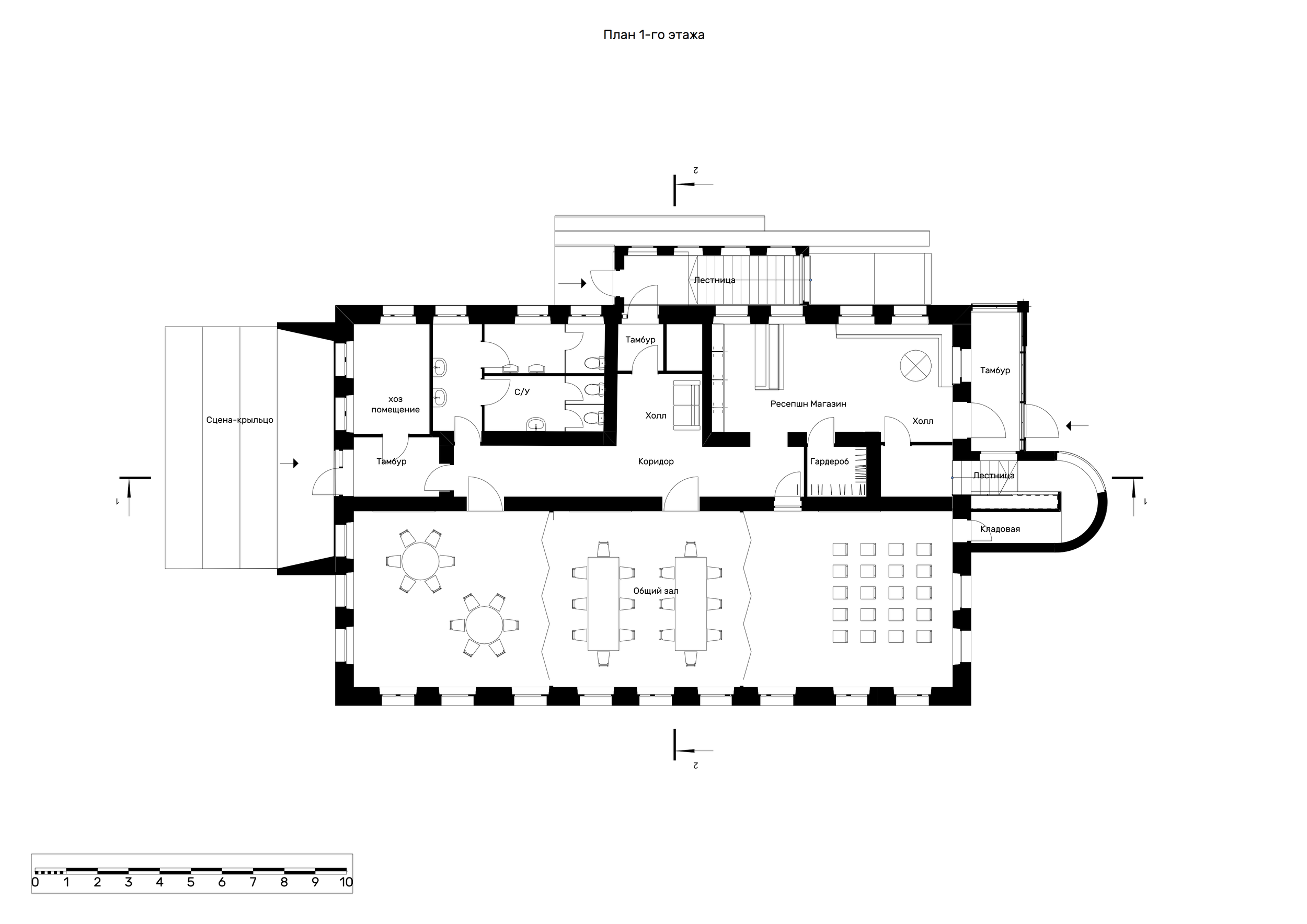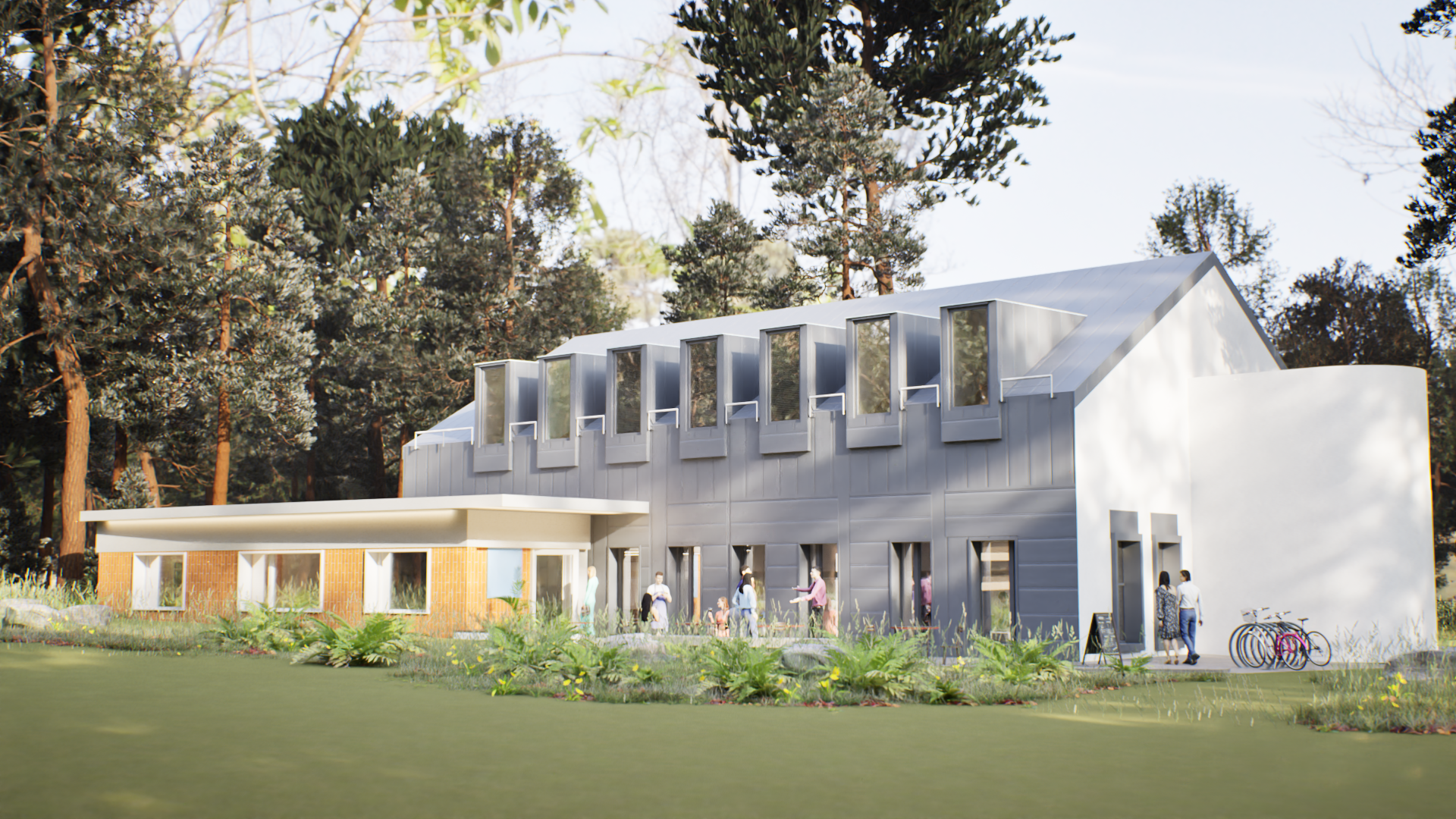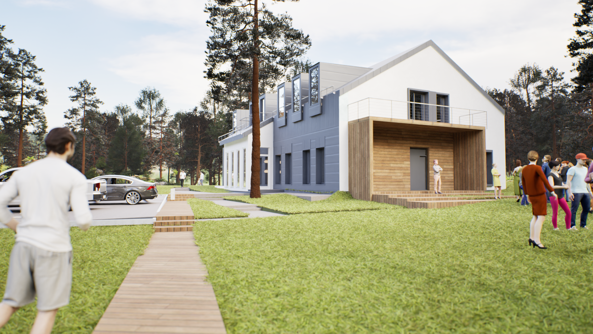 У западного фасада мы предлагаем устроить крыльцо-сцену, чтобы минимально занять пространство у окружающей территории и усилить функциональную связанность помещений.