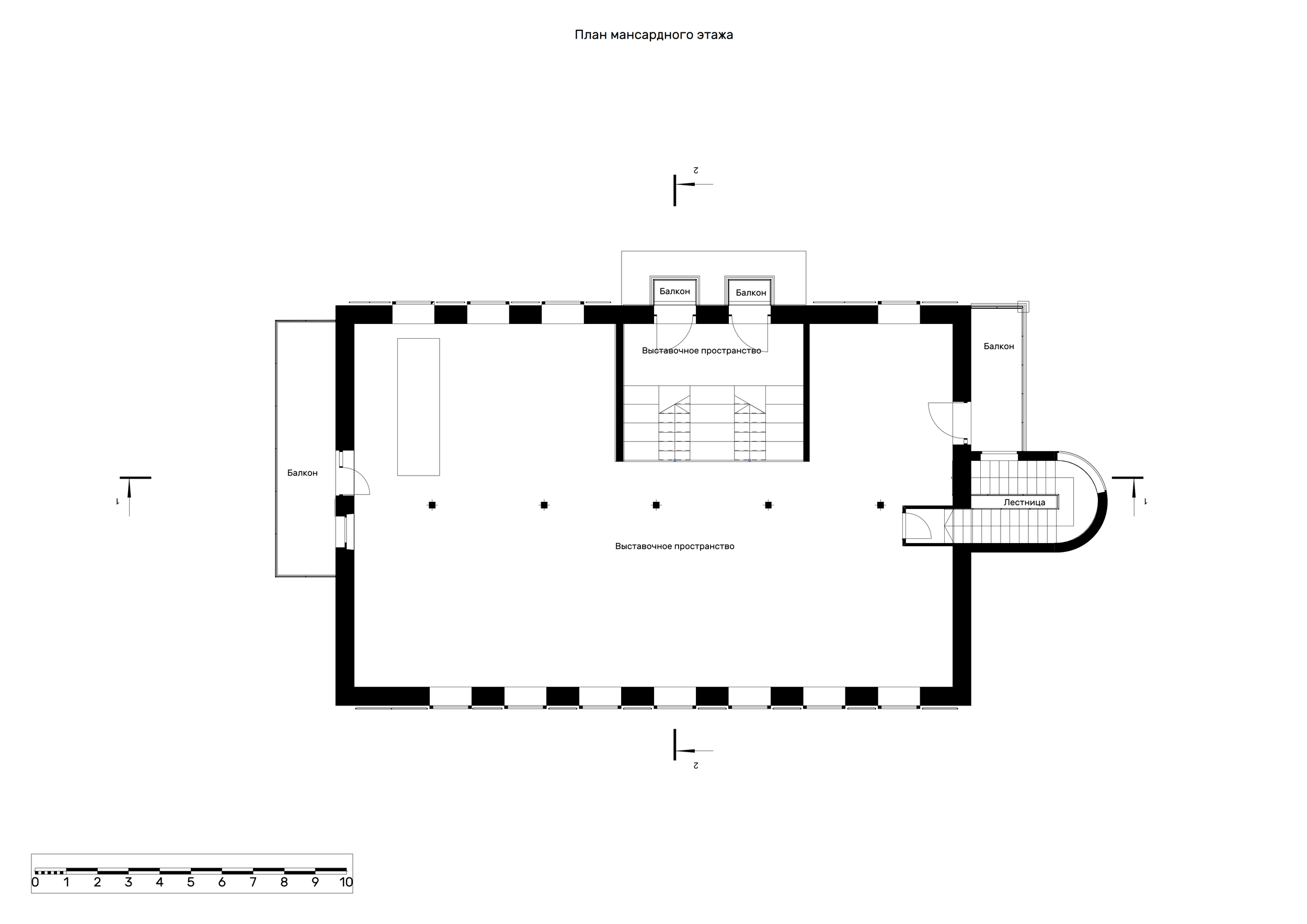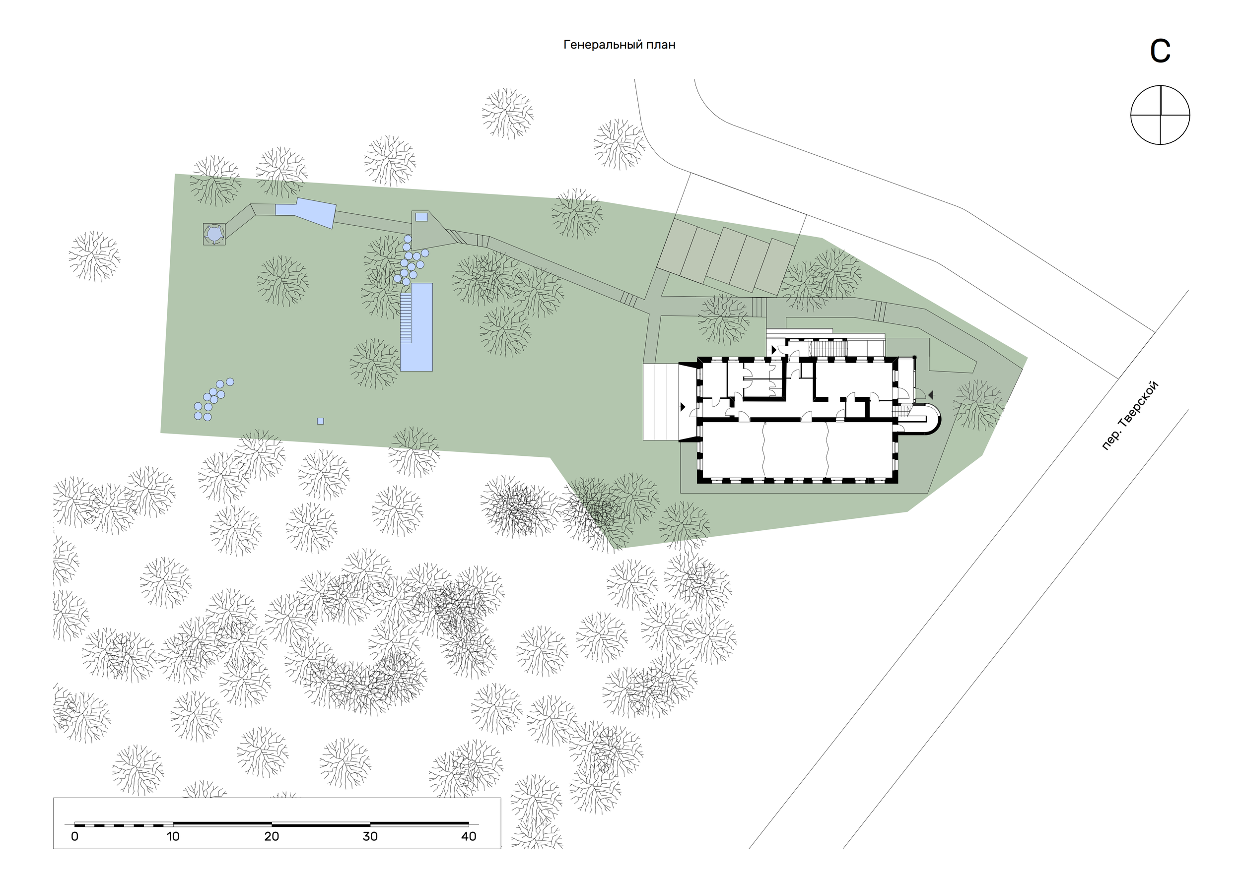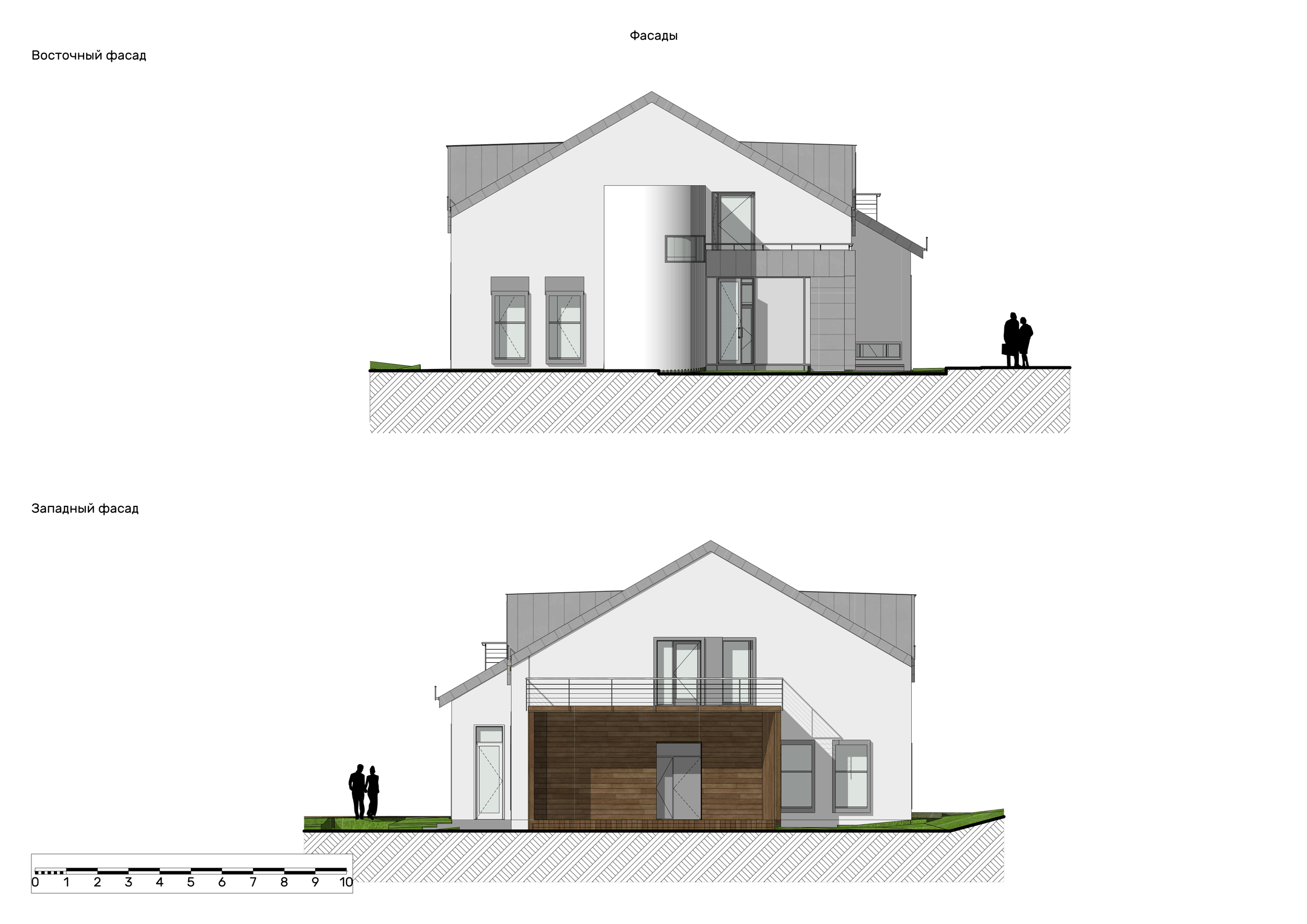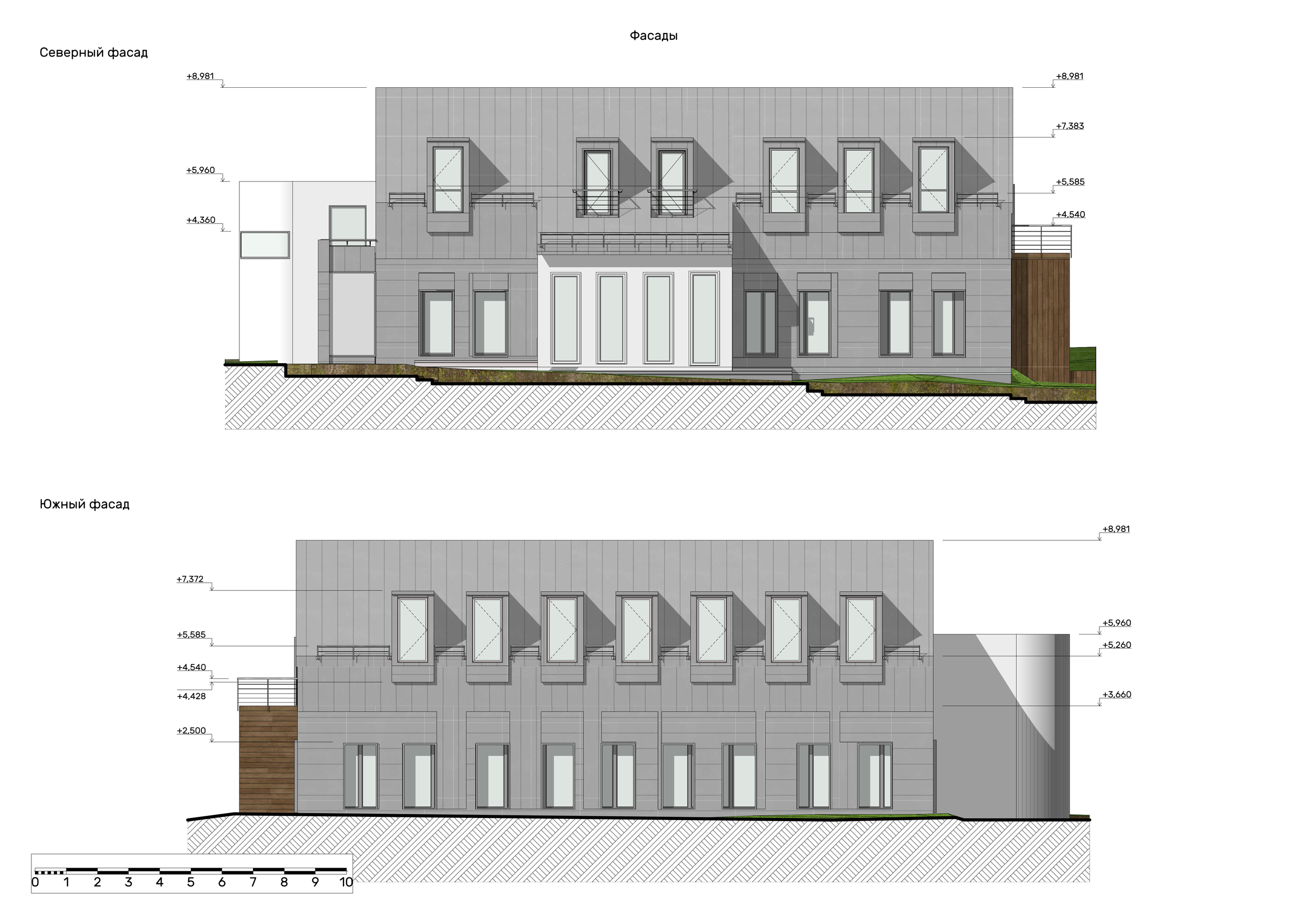 У северного фасада на месте старого главного входа, со смещением влево расположили освещённую лестницу в подземный этаж, где расположили компактную студию звукозаписи. Таким образом, выстраивается выразительная структура связи помещений. Мы предлагаем изменить, конструкцию кровли на двускатную, устроив её конёк выше существующей отметки высоты. Тем самым вытянув пропорции здания, и увеличив площадь мансардного этажа для свободной эксплуатации. Такое место отлично подойдёт для выставок и лекций. Конструкция кровли изрезана большими окнами и французскими балконами, создается связь с идеями Бурлакова о связи человека и природы.