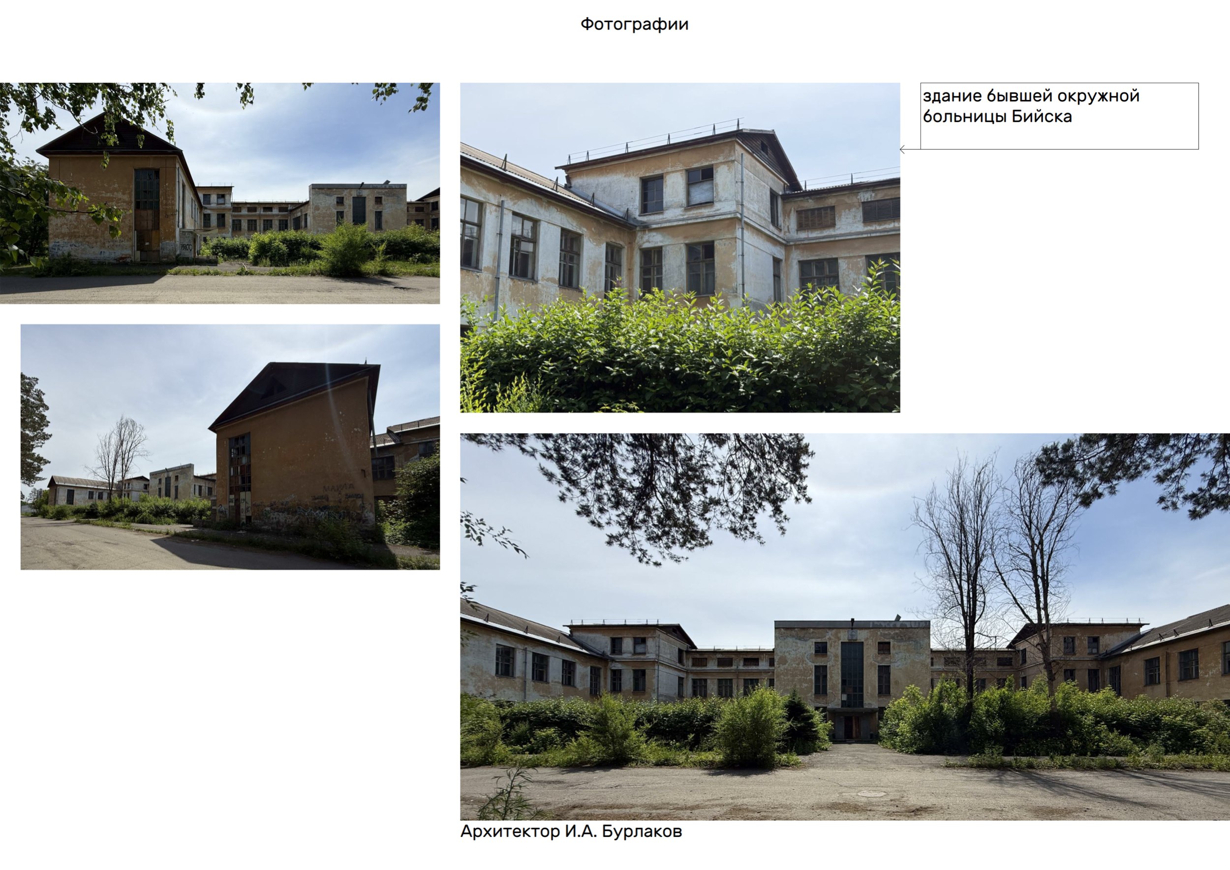 Здание бывшей детской поликлиники Бийска находится на левом берегу Бии, в живописном сосновом бору. Объект проектирования был частью оздоровительного комплекса со зданием бывшей окружной больницы – образцом советского ар-деко архитектора И.А. Бурлакова.