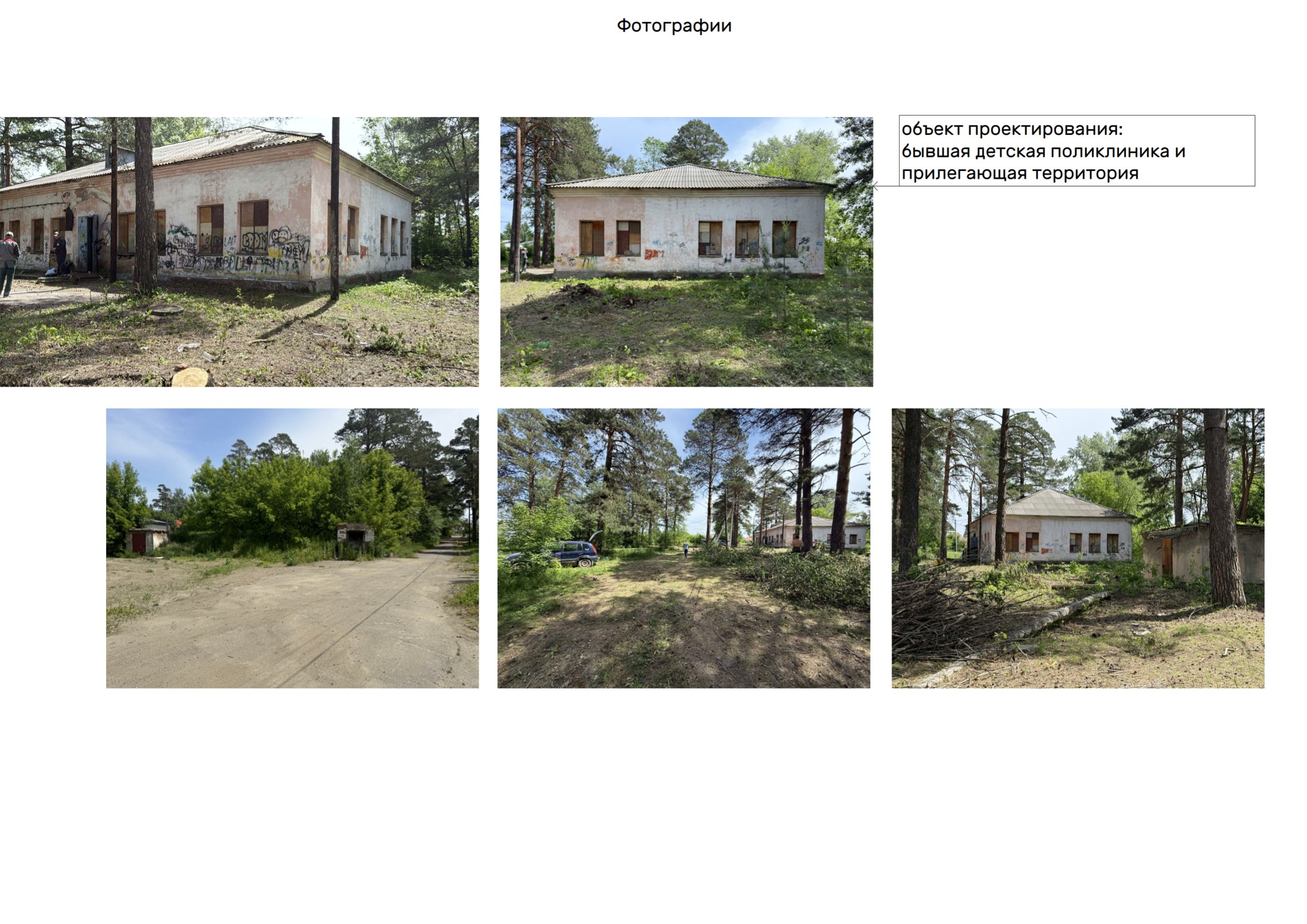 На фотографиях видно, что здания больницы и поликлиники спроектированы в единой концепции, суть которой – оздоровление через общение с природой. Несмотря на некоторые стилистические различия: здание детской поликлиники стремится скорее к советскому классицизму. Состояние здания удовлетворительное. На территории участка проектирования расположены старая водонапорная башня (не используется), хозяйственно-бытовая постройка (разрушена) и коммуникации (канализация, связь, горячее водоснабжение).
