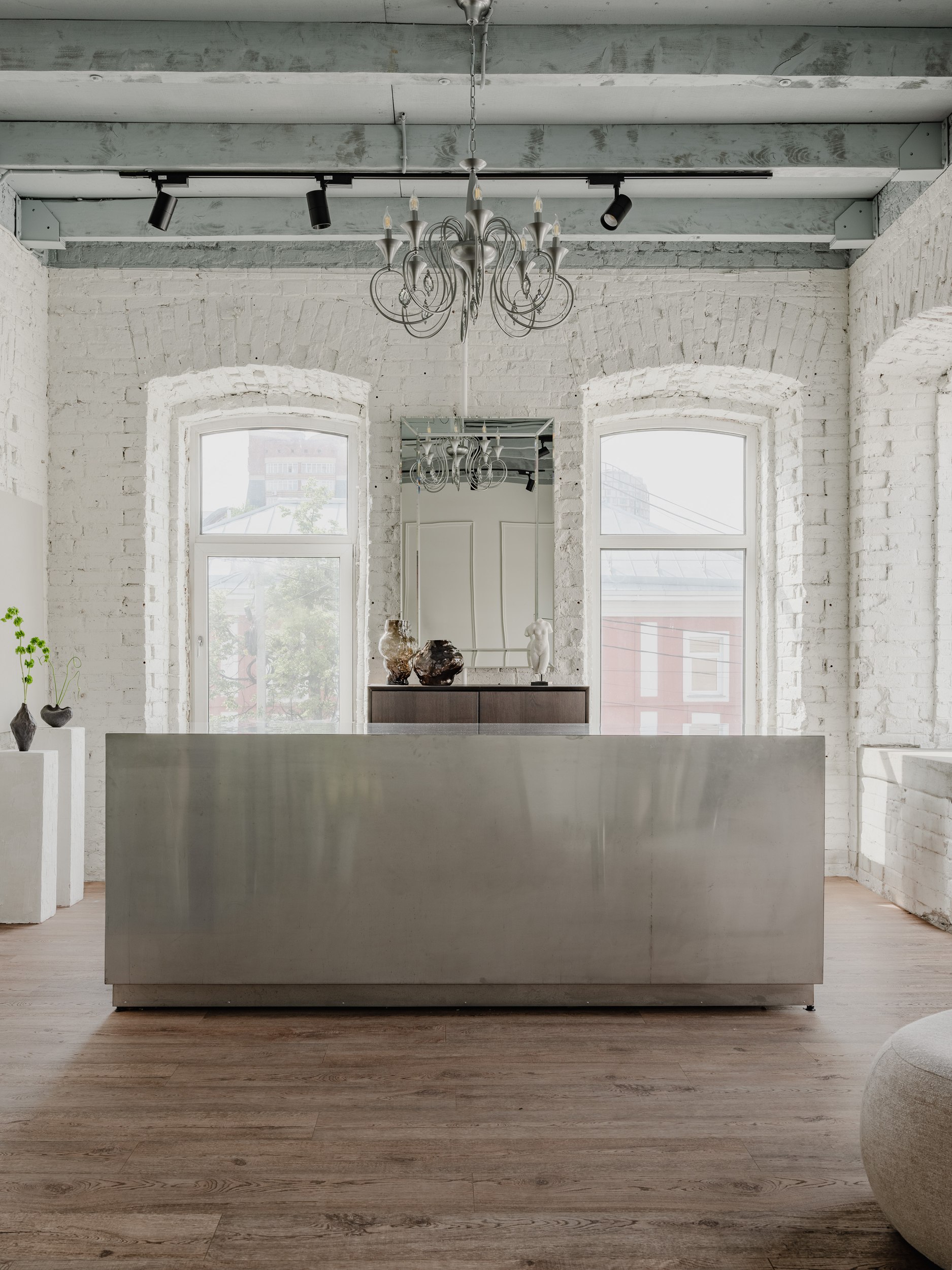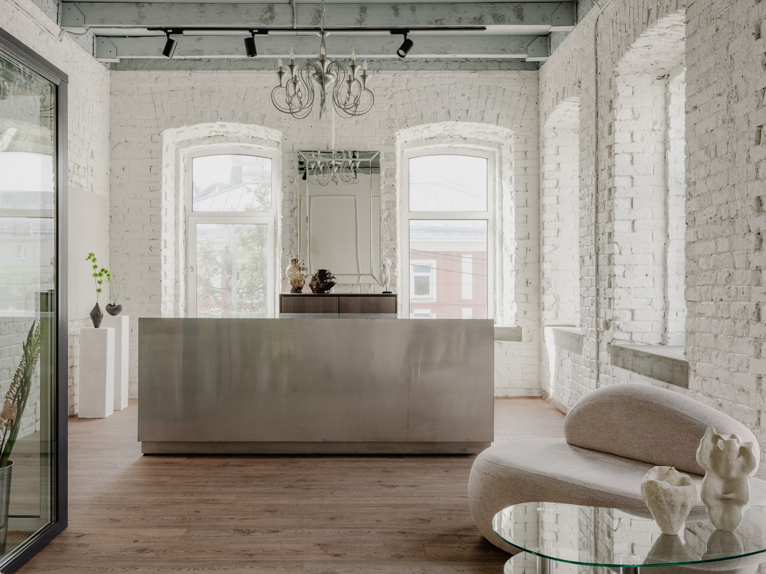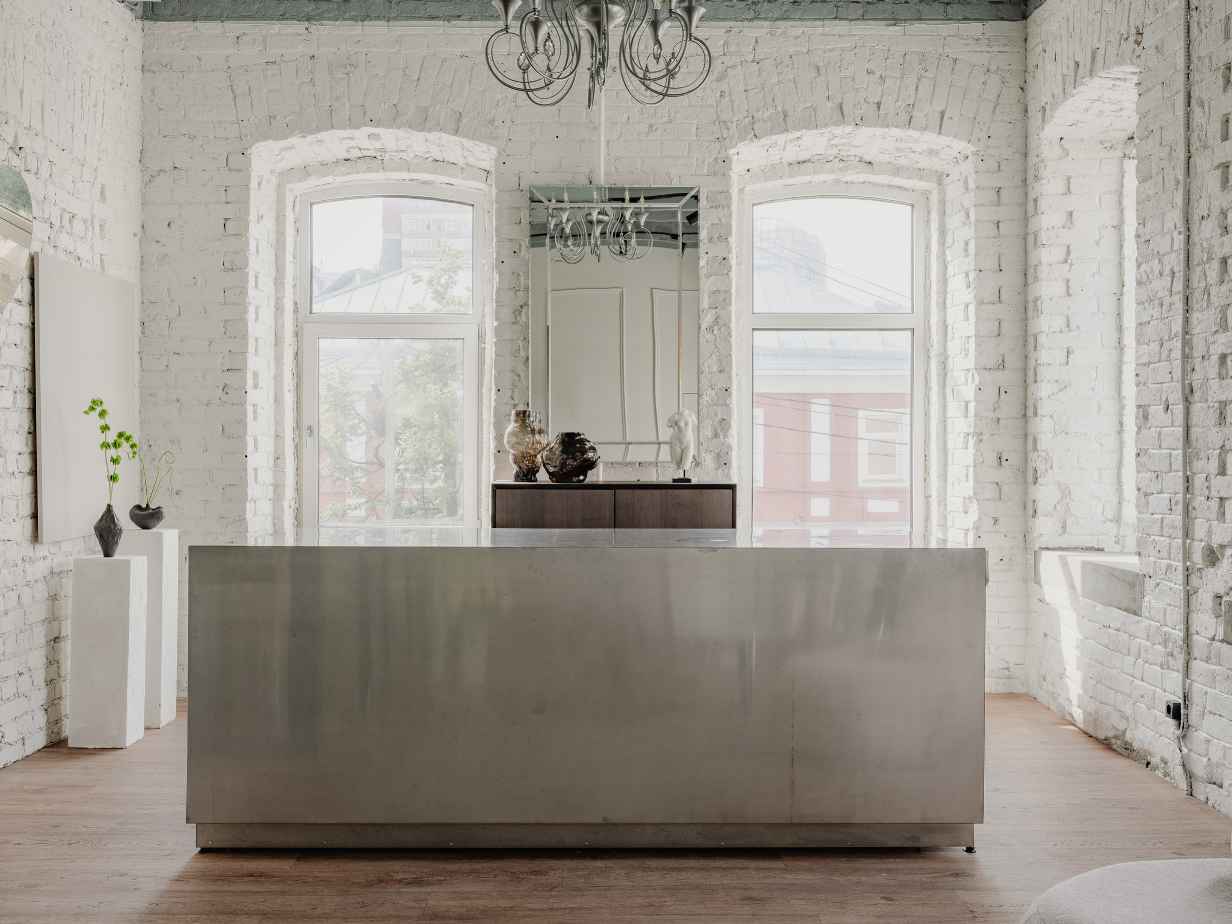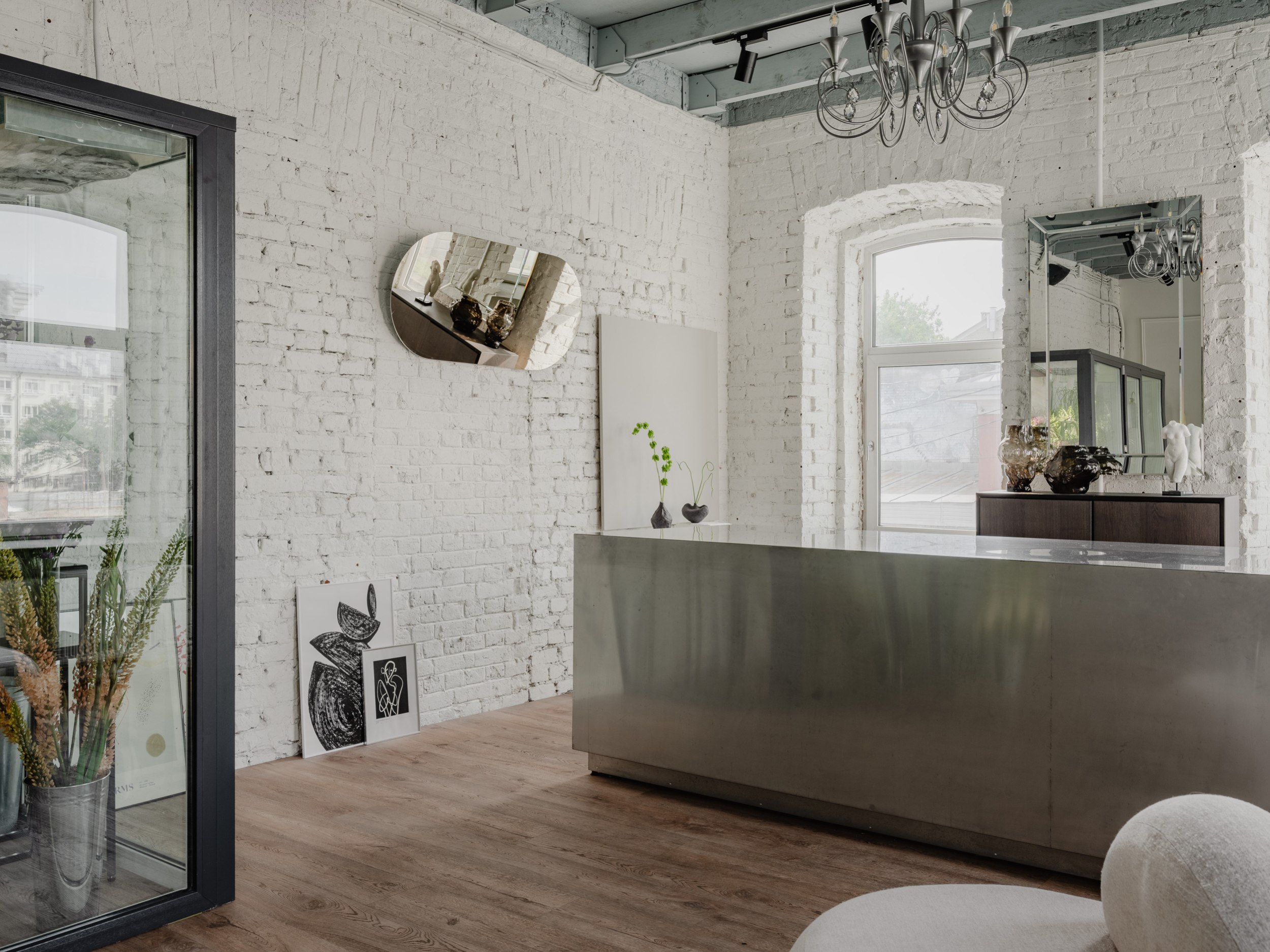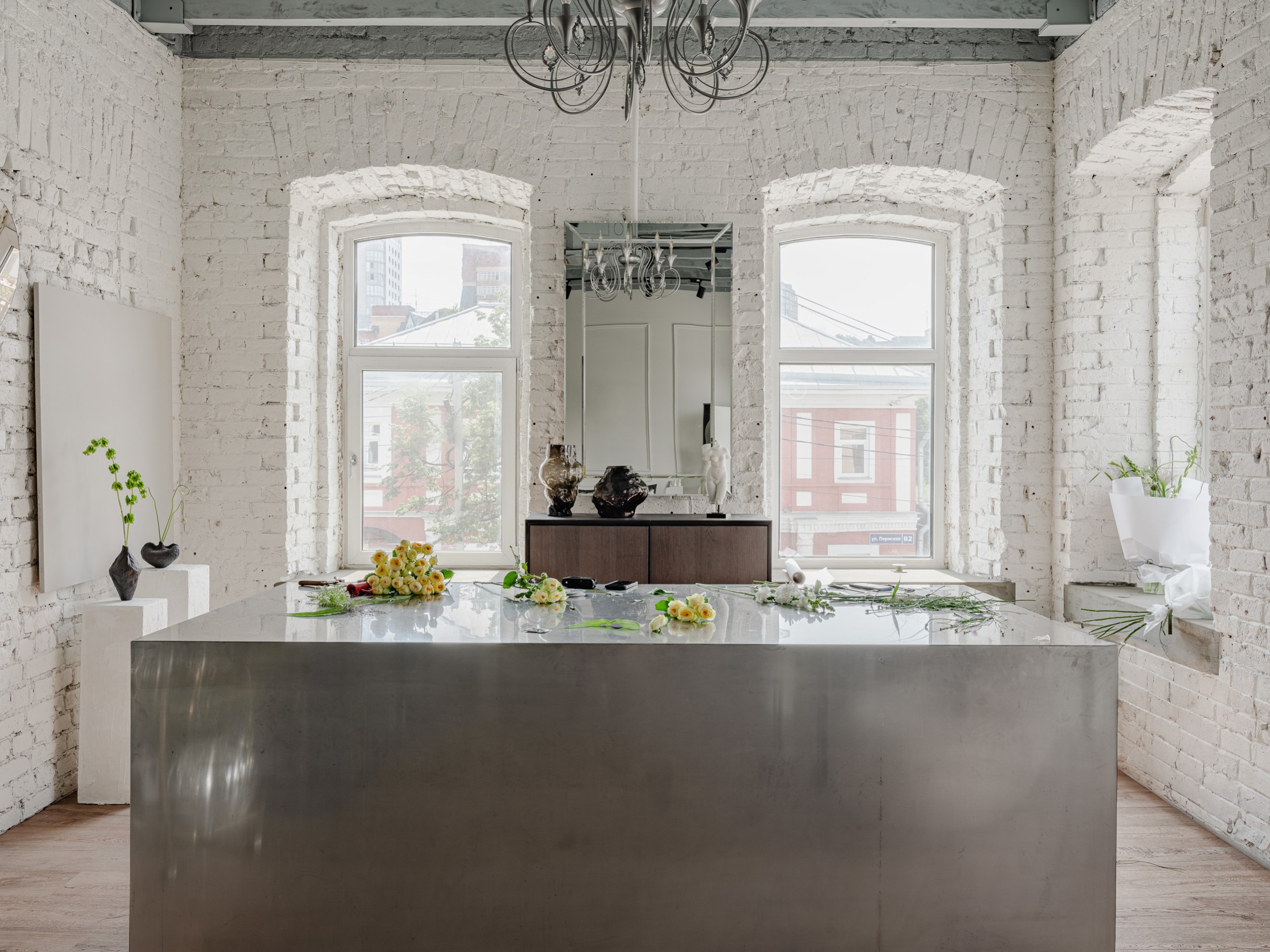 У одной из стен мы разместили большой холодильник с обзором на композиции, в самом освещённом месте – просторный рабочий остров, а кухню с мокрой зоной и гостевой санузел расположили у входа. Остальная мебель – мобильная: её можно переставлять, меняя экспозицию декора и ваз, или освобождая место для встреч и вечеринок.