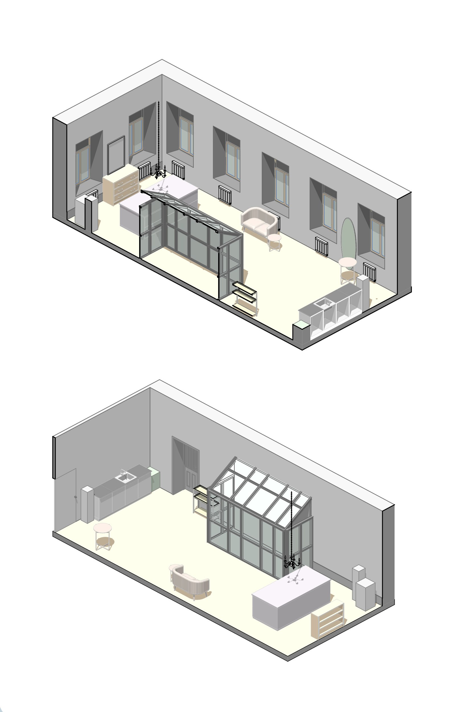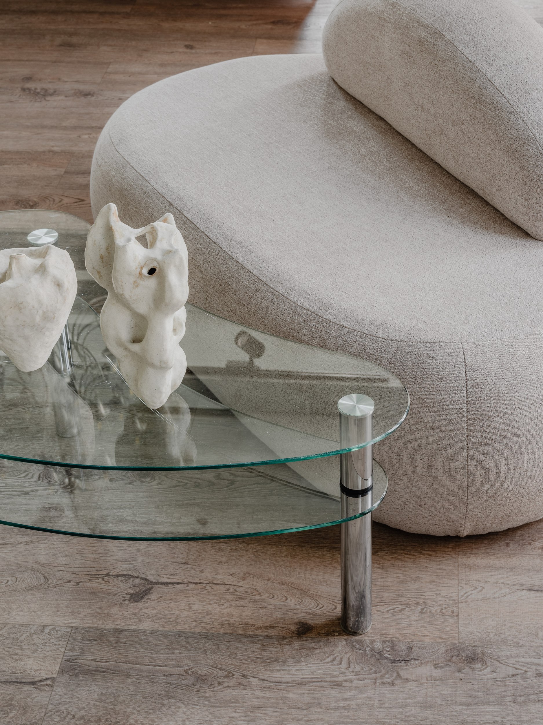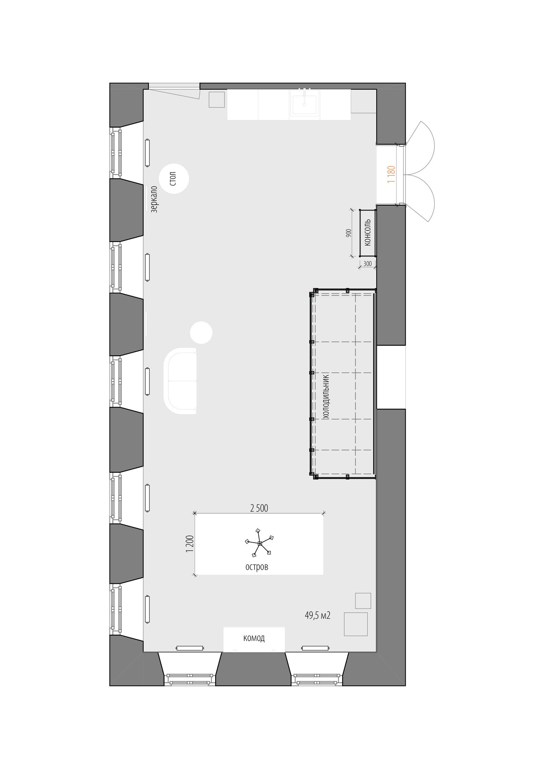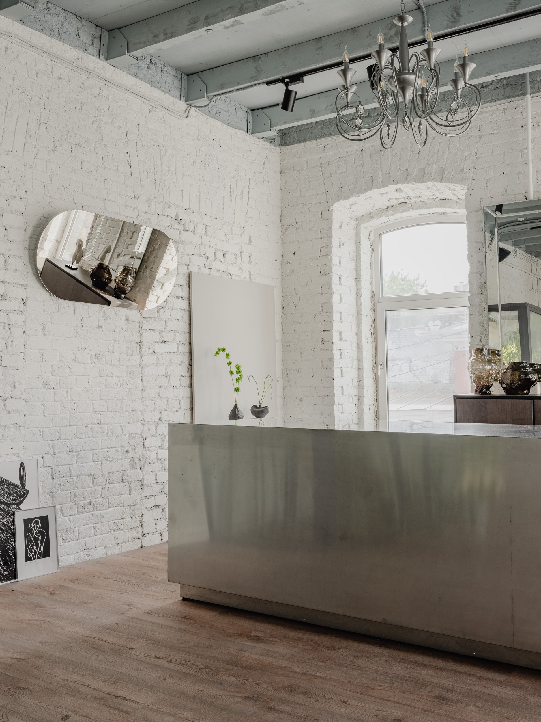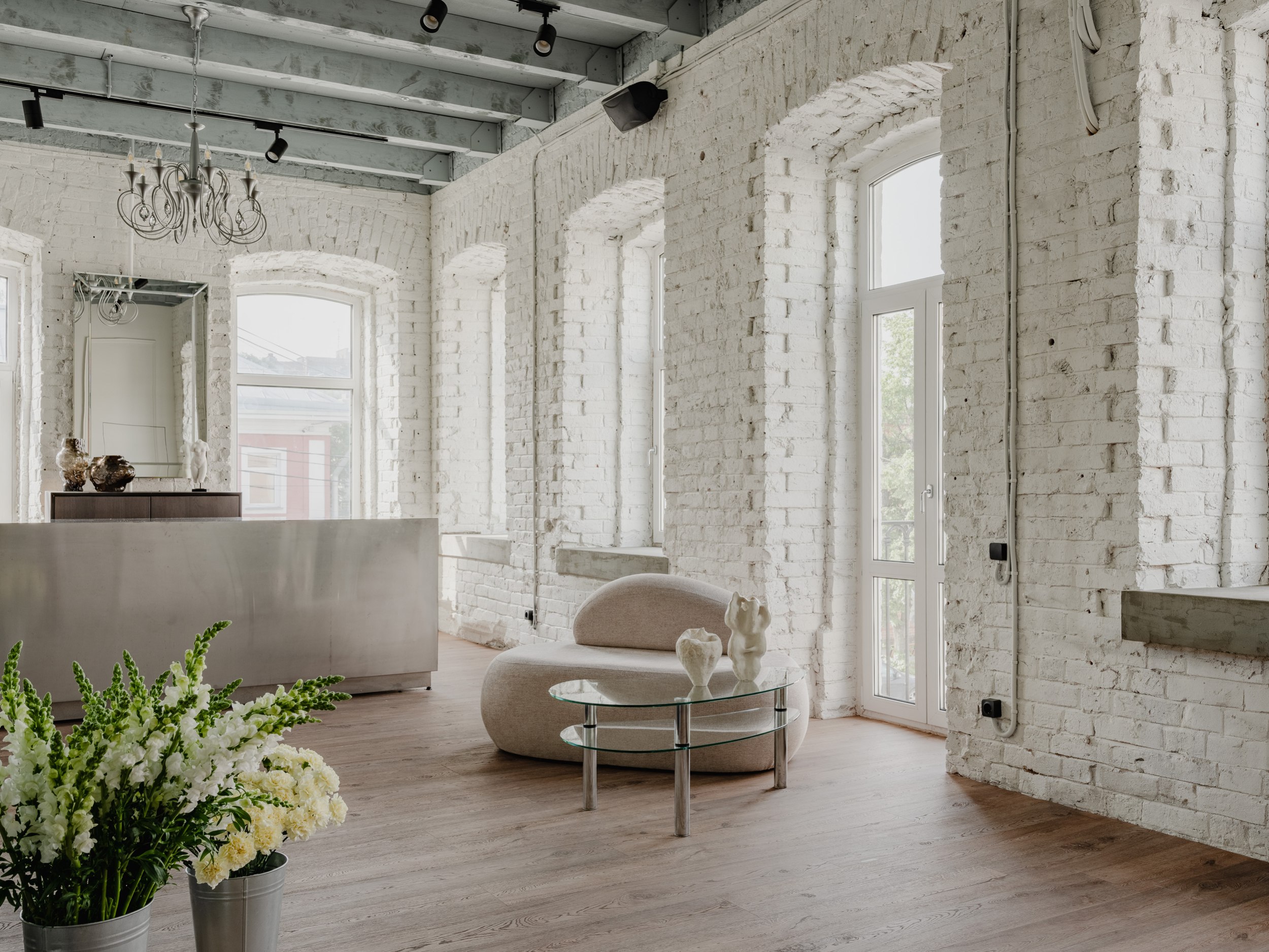 У одной из стен мы разместили большой холодильник с обзором на композиции, в самом освещённом месте – просторный рабочий остров, а кухню с мокрой зоной и гостевой санузел расположили у входа. Остальная мебель – мобильная: её можно переставлять, меняя экспозицию декора и ваз, или освобождая место для встреч и вечеринок.