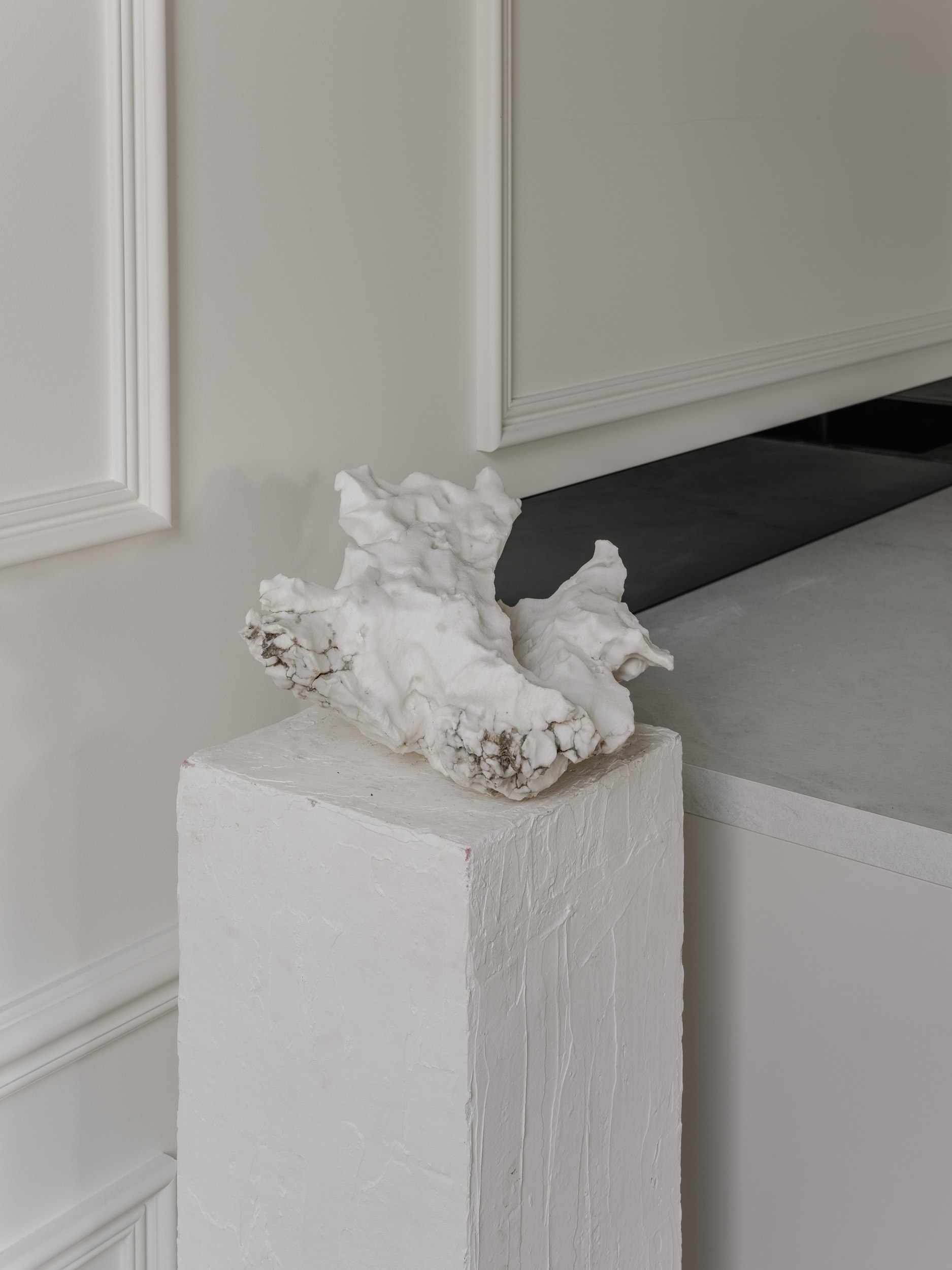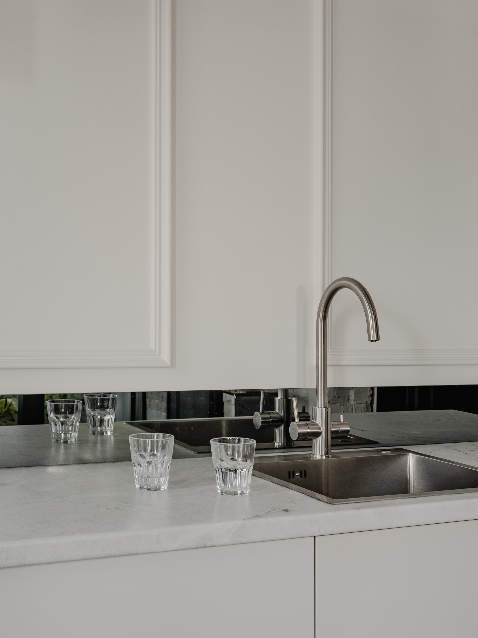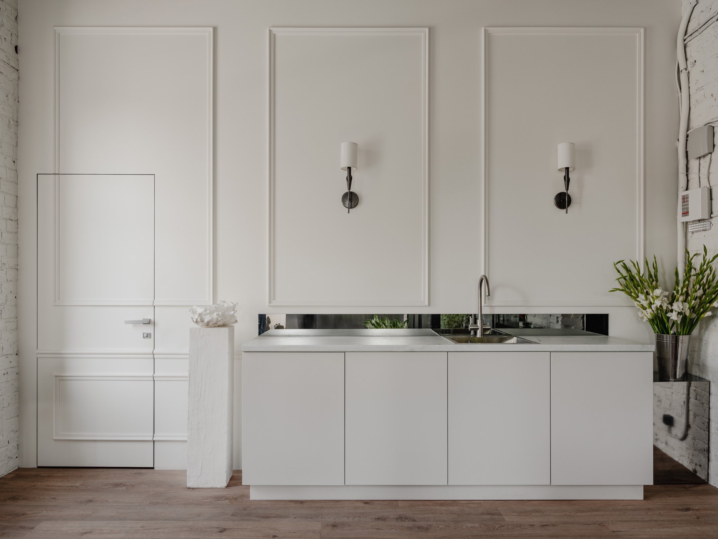 Кухня в этом пространстве сочетает утилитарность и декоративность: в зеркальном фартуке отражается естественный свет, а лепнина на стене служит фоном для съёмки свежих цветочных поставок.