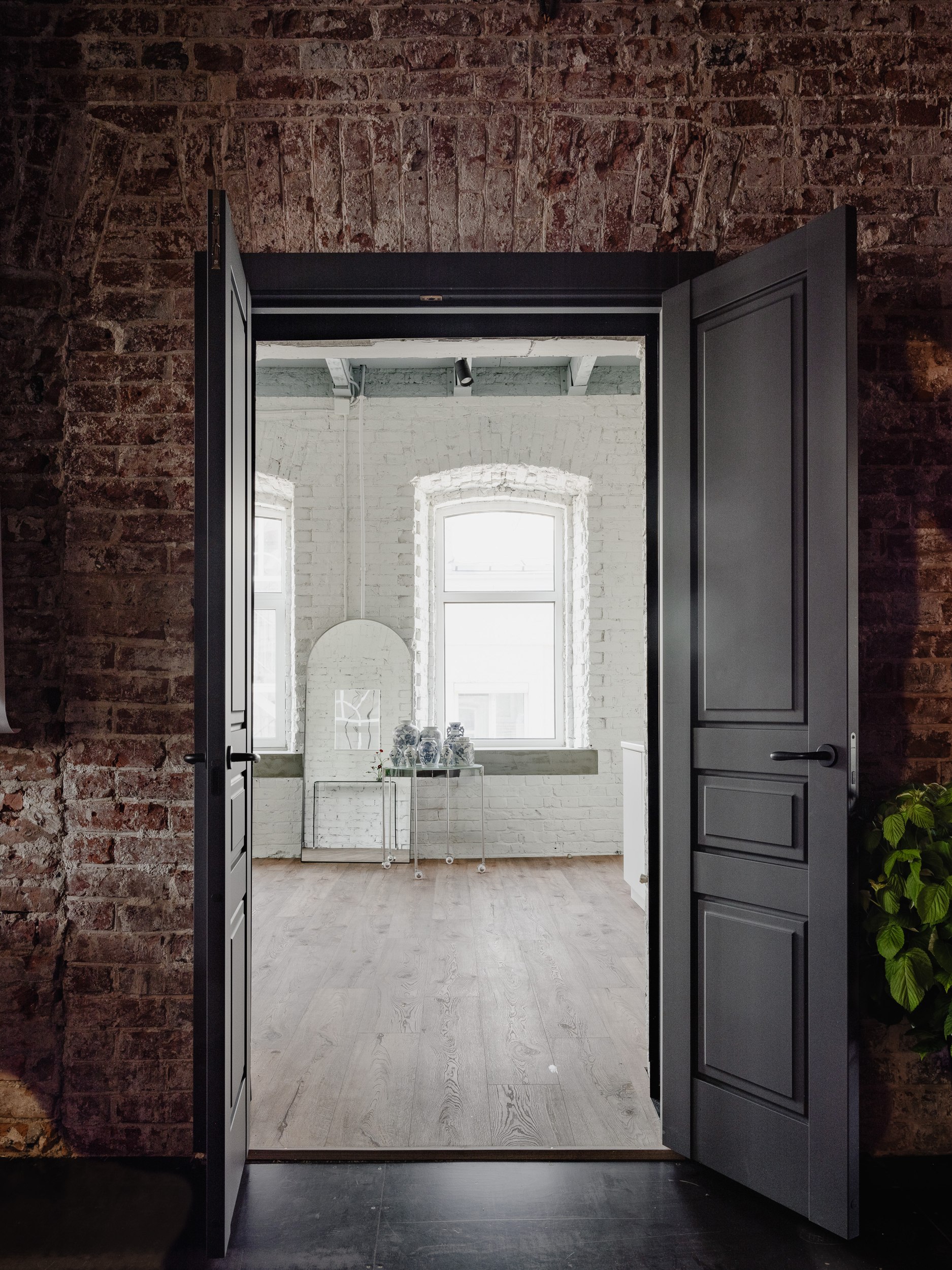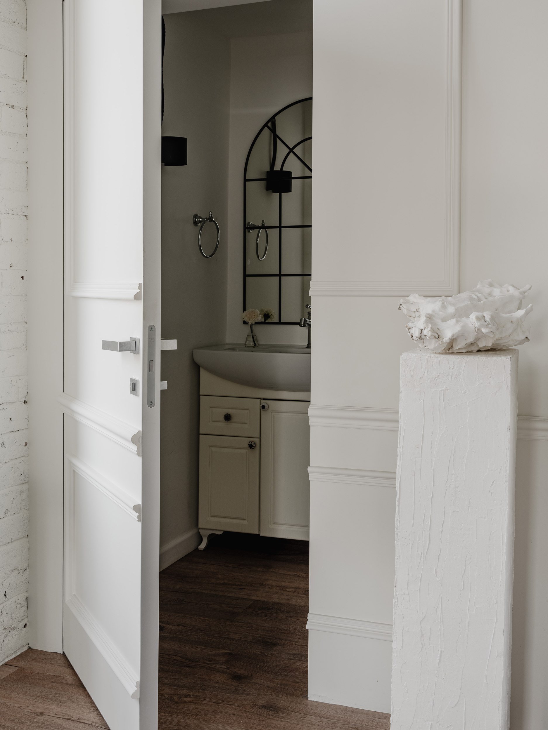 Мы особенно гордимся работой с материалами: сохранили живую текстуру кирпича, покрыв его тёплым белым оттенком, выбрали классические оконные ручки и бетонные подоконники, идеально подходящие для сложных проёмов.