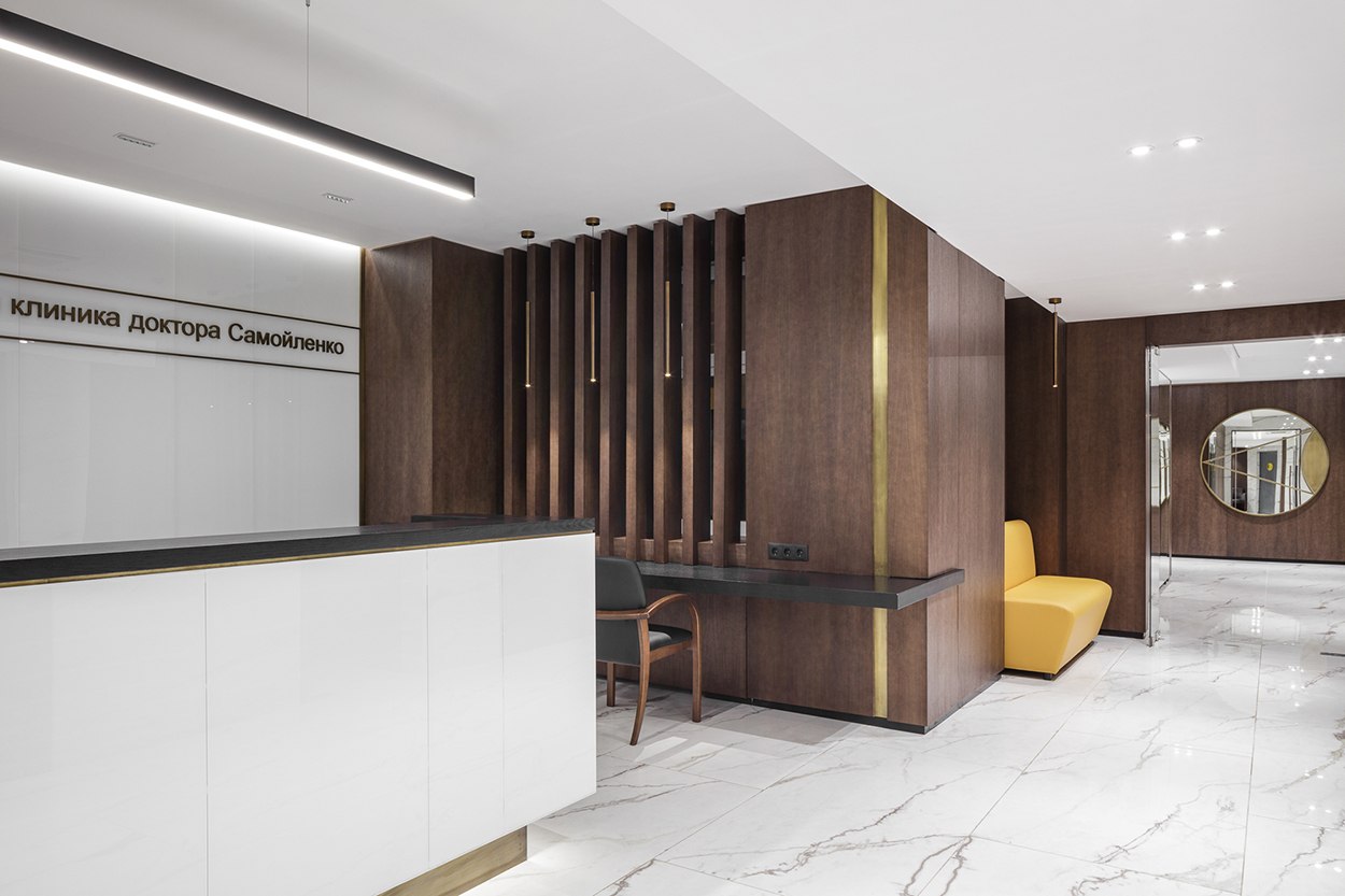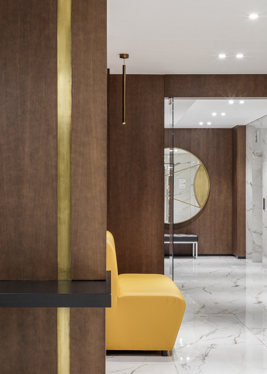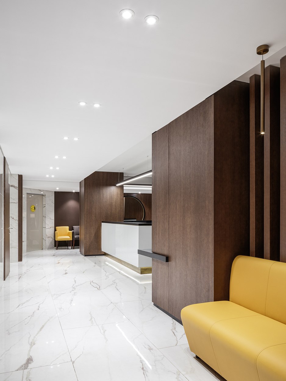Фирменные цвета клиники – жёлтый и белый. Однако, стремясь обеспечить спокойствие и расслабление, архитекторы отказались от активного использования жёлтого цвета, трансформировав его в деликатные латунные акценты на стенах и в мебели. Такой приём позволил сохранить фирменную айдентику, не нарушая гармонии интерьера.
