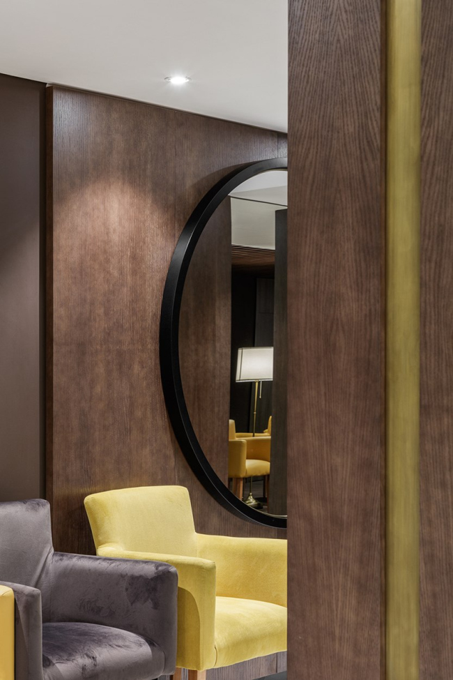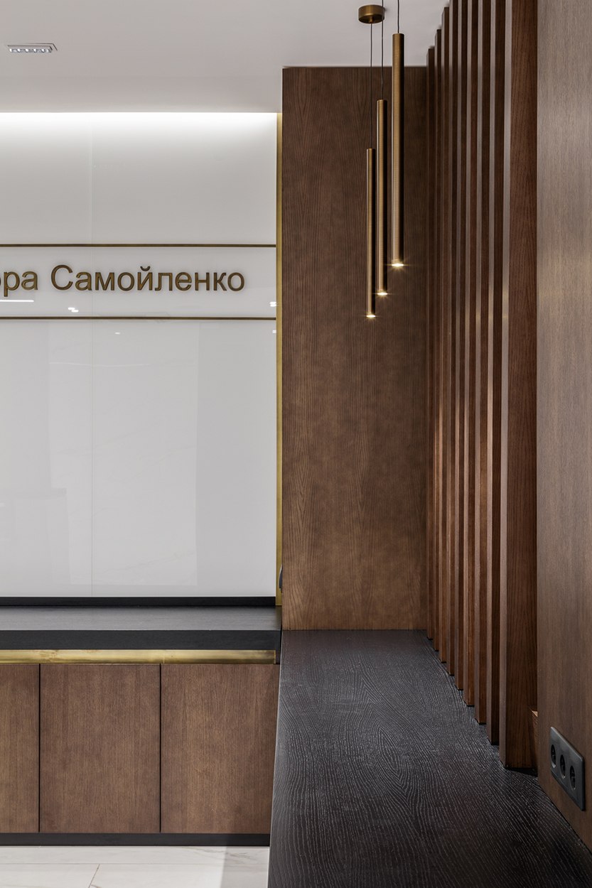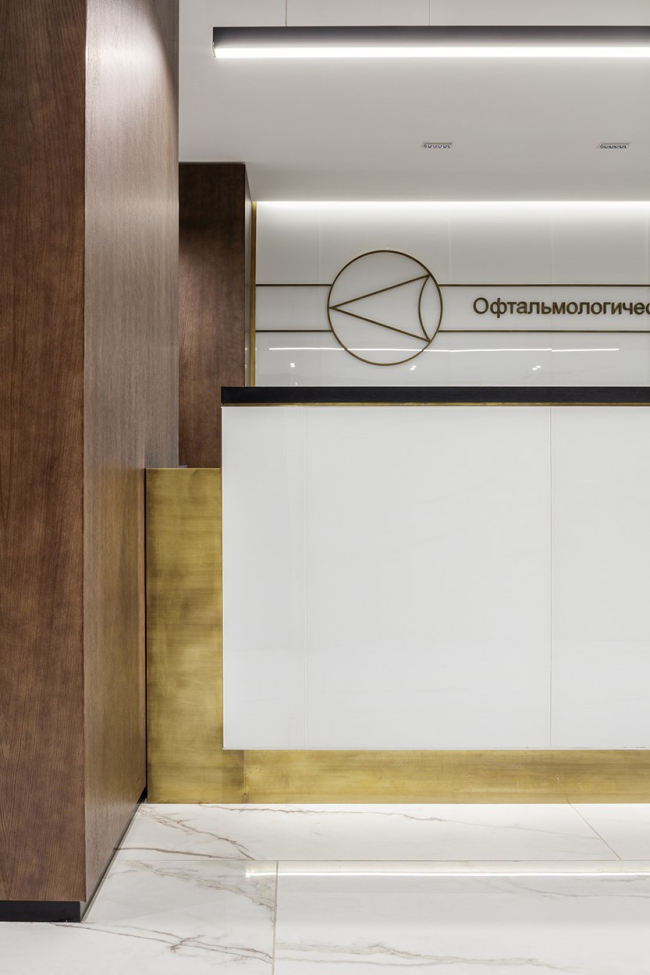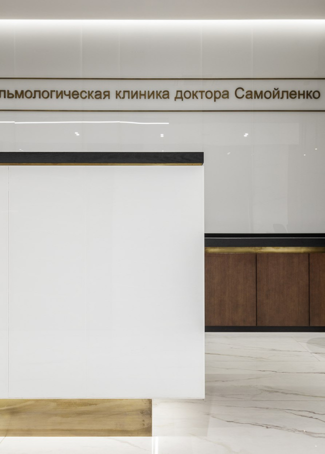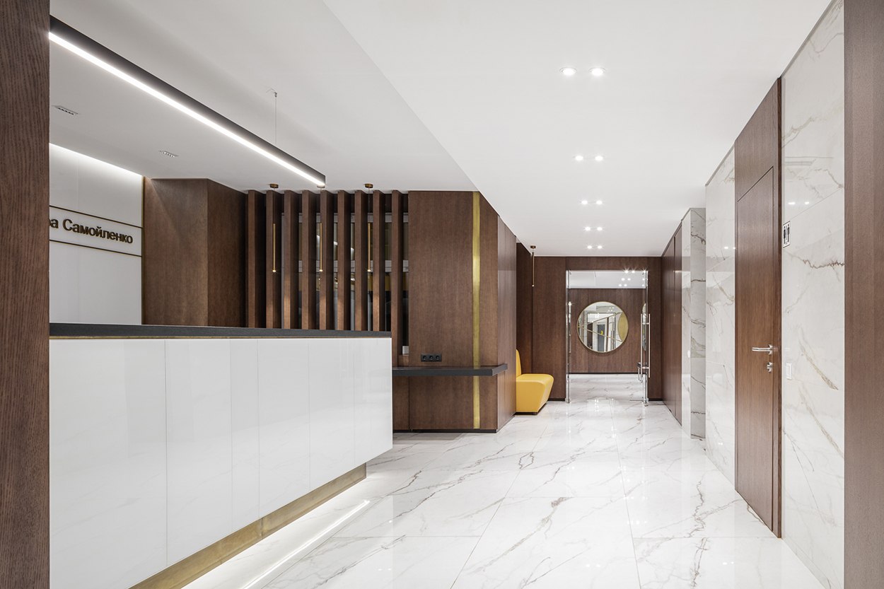 Фирменные цвета клиники – жёлтый и белый. Однако, стремясь обеспечить спокойствие и расслабление, архитекторы отказались от активного использования жёлтого цвета, трансформировав его в деликатные латунные акценты на стенах и в мебели. Такой приём позволил сохранить фирменную айдентику, не нарушая гармонии интерьера.
