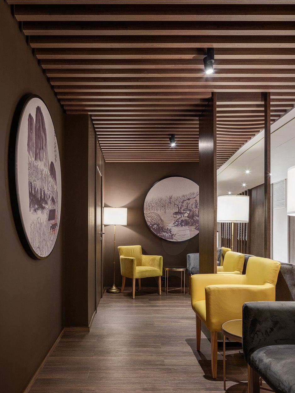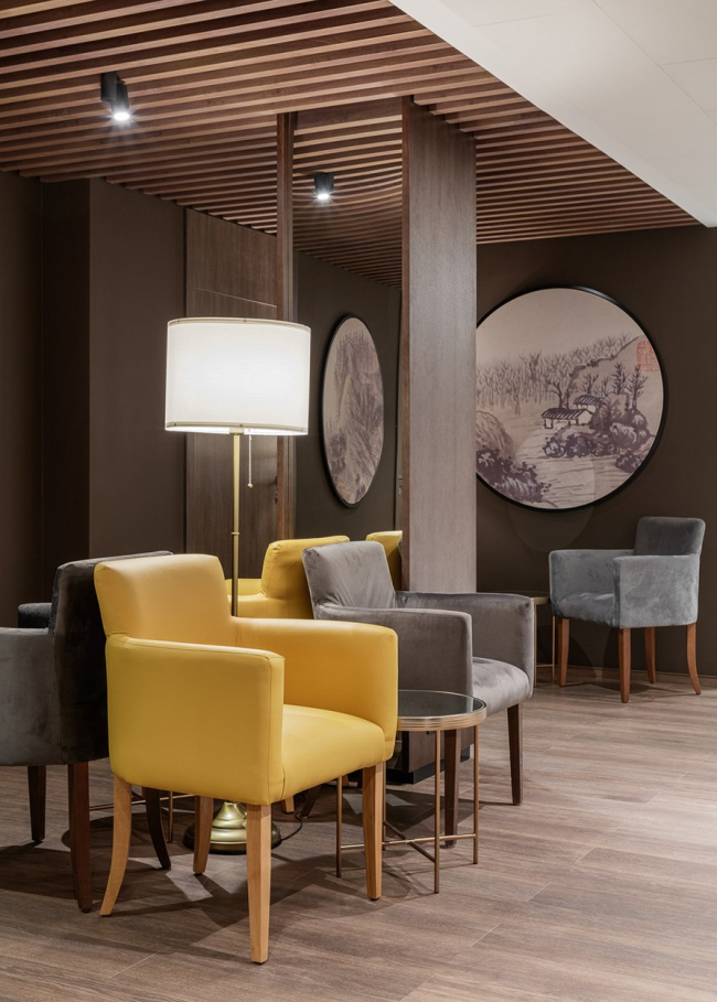 Комфортная атмосфера создаётся за счёт тактильных материалов, мягкого локального освещения и включения предметов искусства – репродукций китайских гравюр, которые добавляют пространству культурную глубину и визуальный акцент.