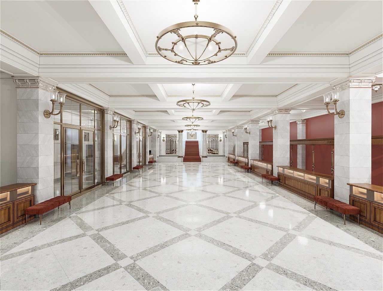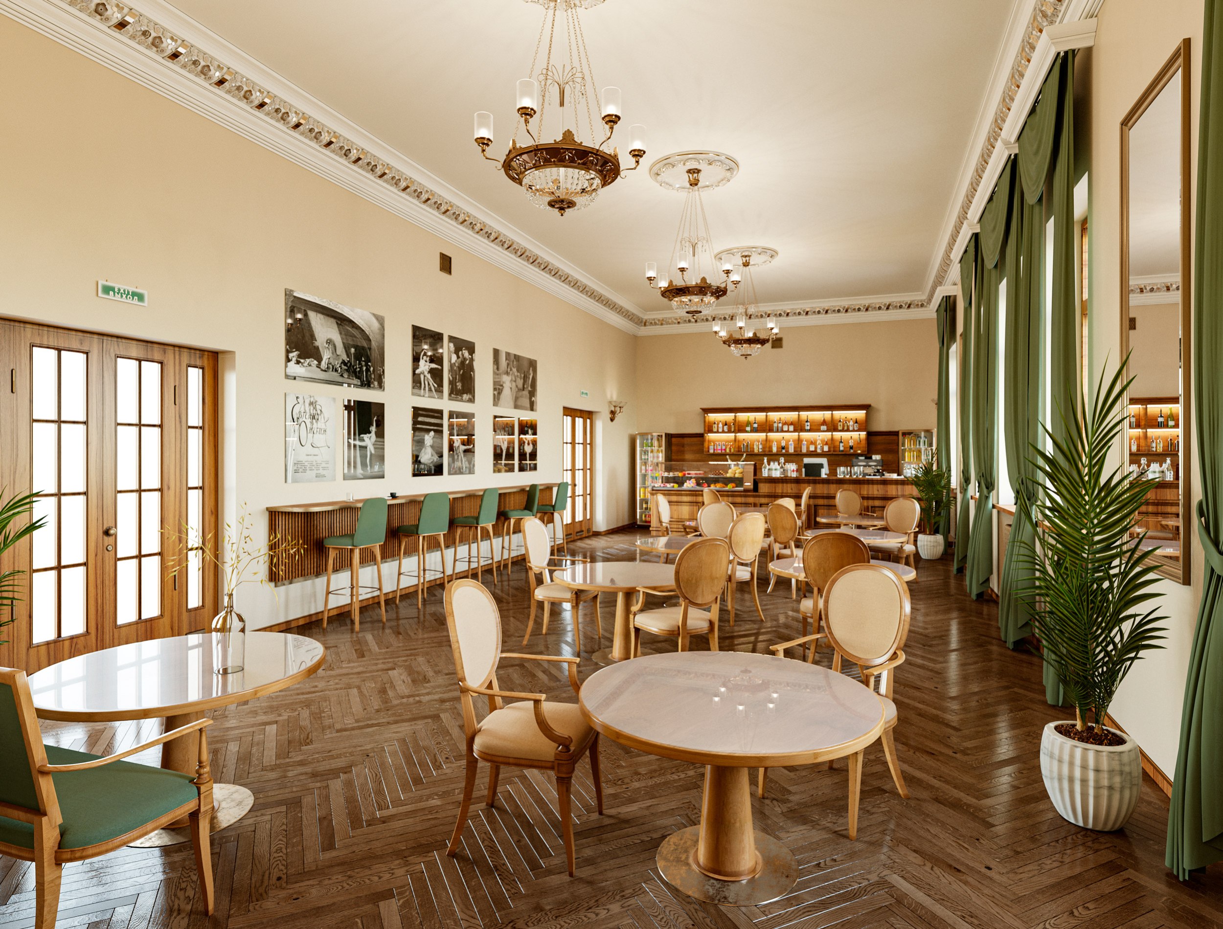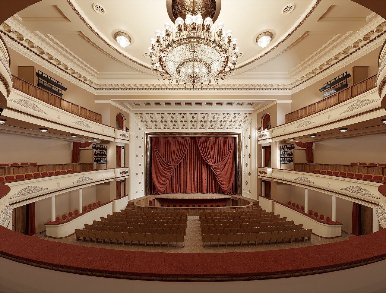 Интерьеры сохранят историческую цветовую гамму, но станут более торжественными и выразительными. Использование благородных материалов, декоративных элементов и уютной мебели подчеркнёт величие театрального искусства. Центральным акцентом зрительного зала станет восстановленная историческая кованая люстра весом 850 кг из хрусталя, бронзы и латуни.