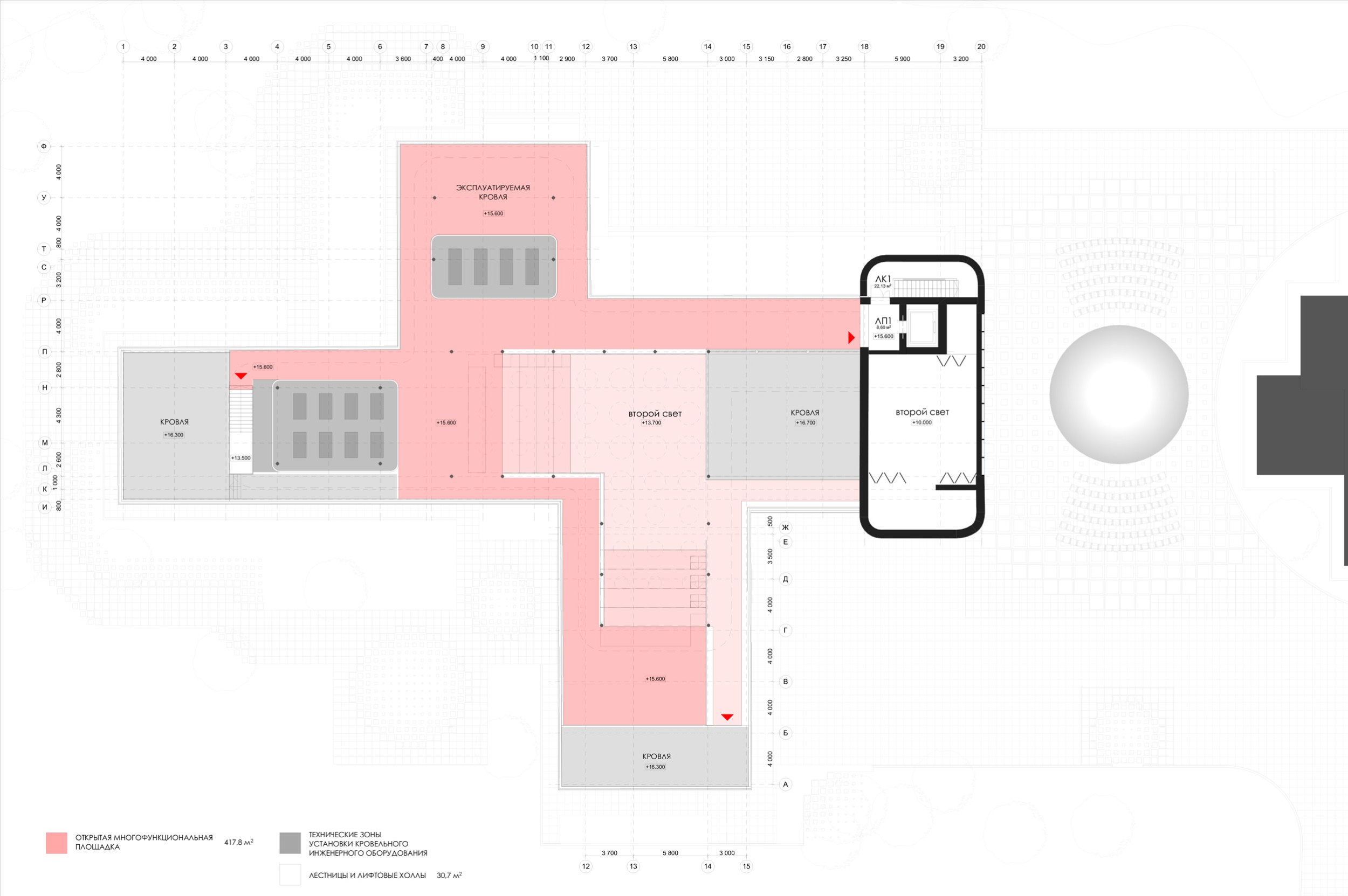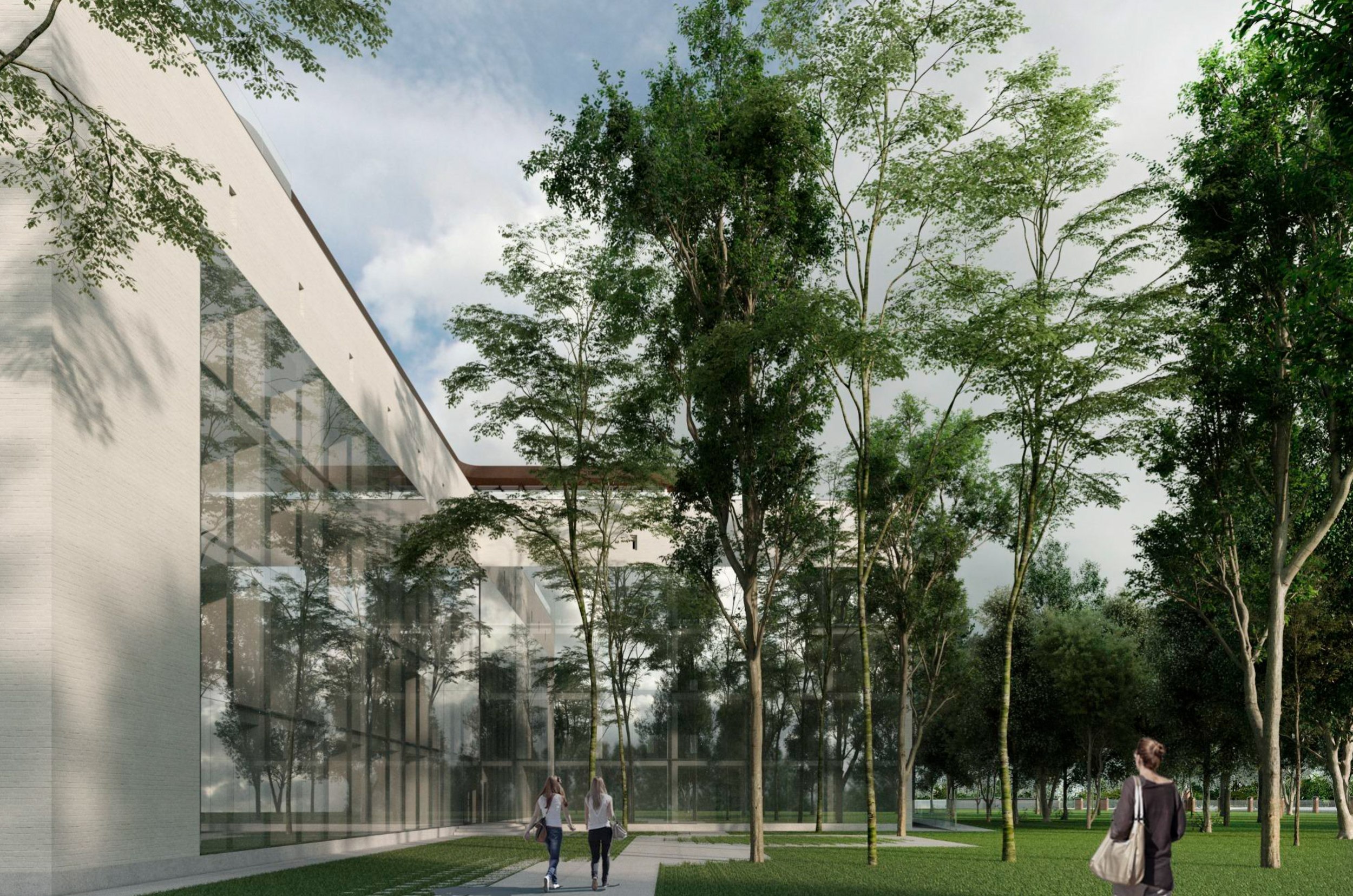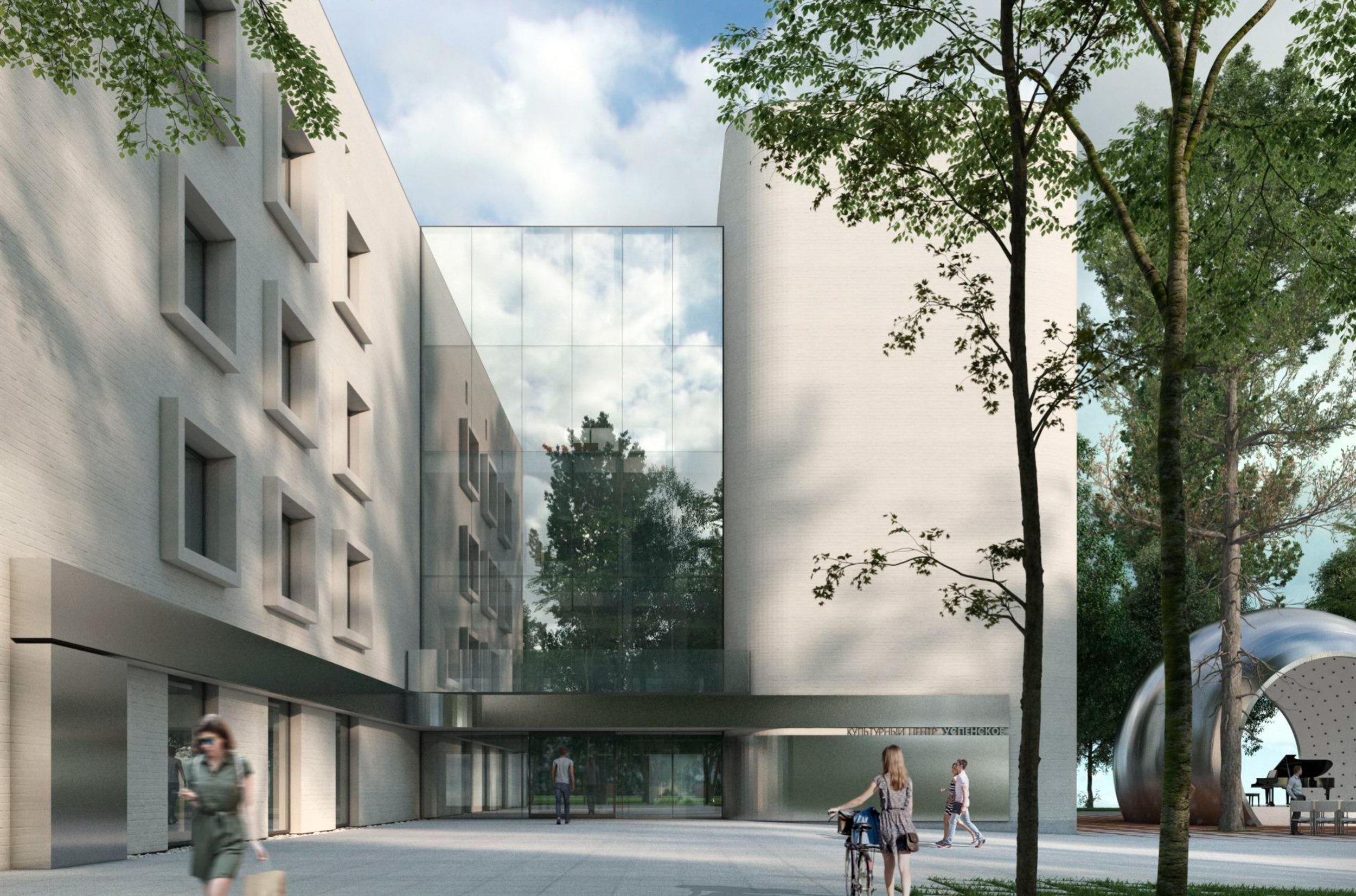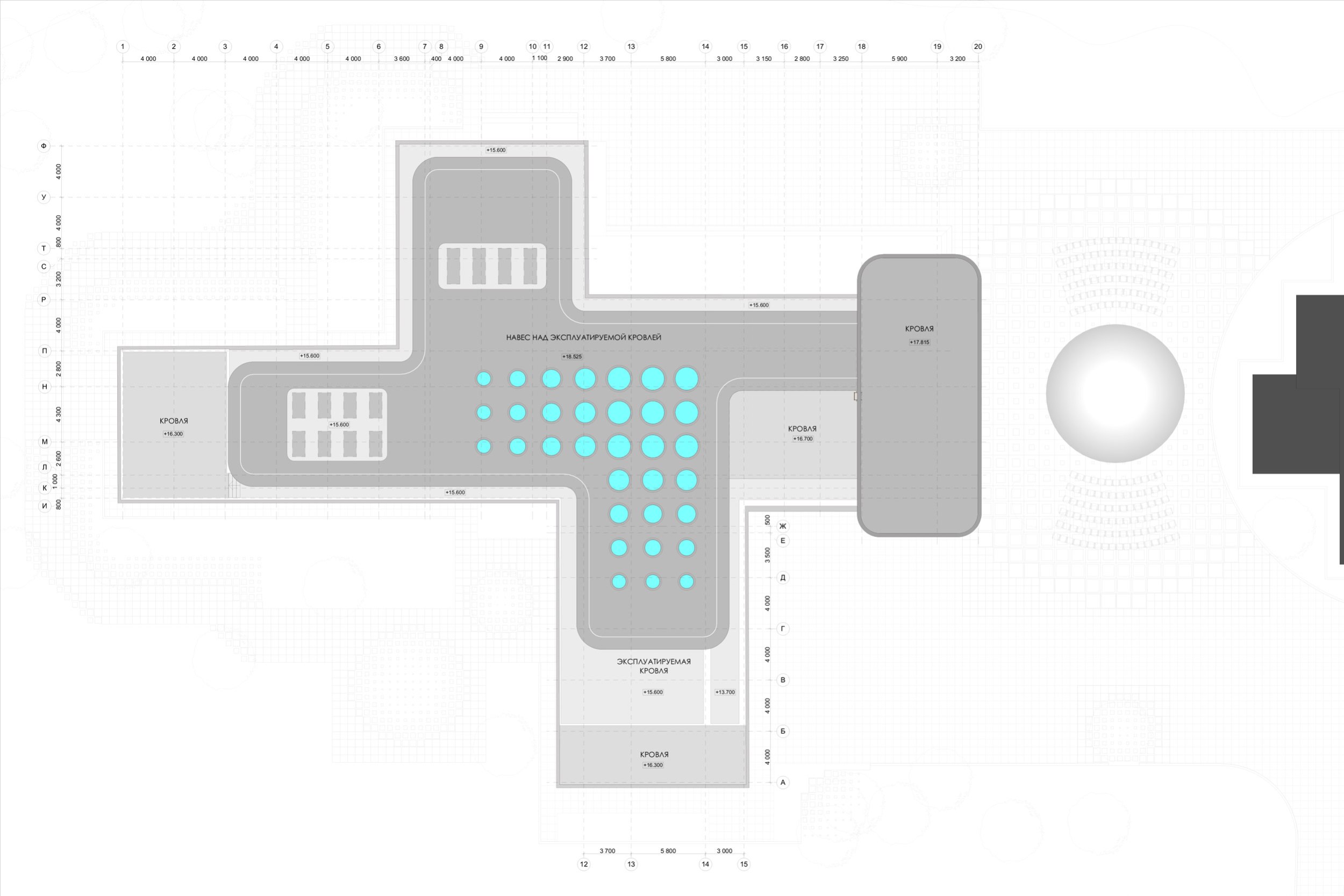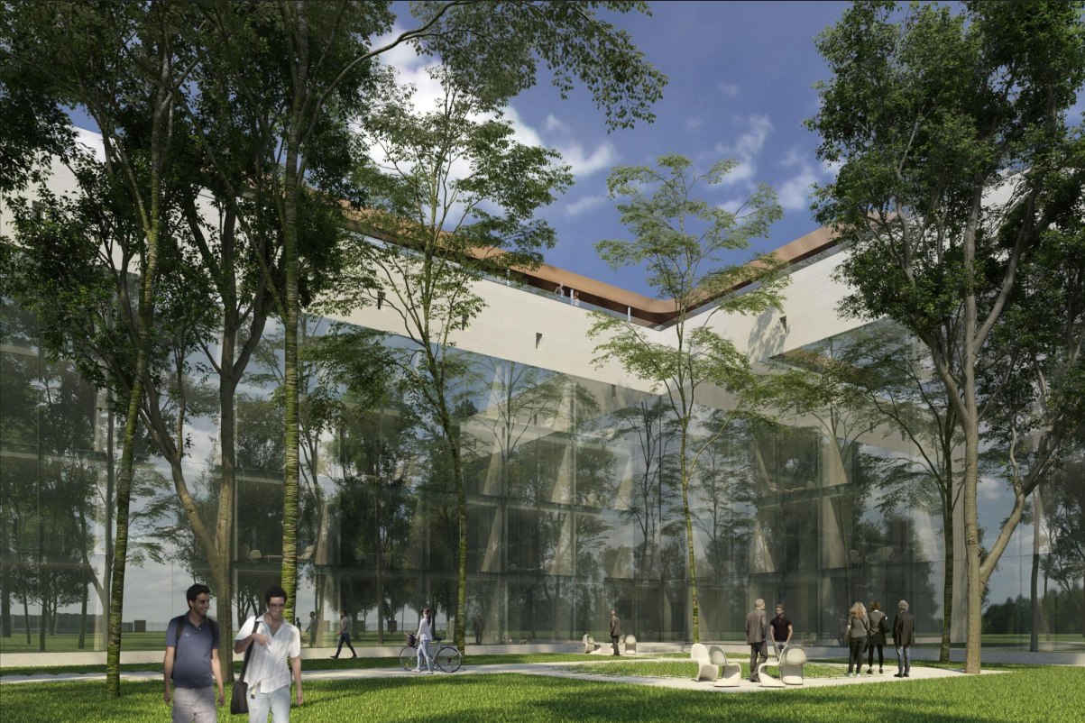 Нейтральная цветовая гамма и гладкие зеркальные поверхности фасада зрительно растворяют массивный объем в окружающем ландшафте. Кровля станет эксплуатируемой, что позволит проводить культурные мероприятия на открытом воздухе с прекрасными видами на природу.
