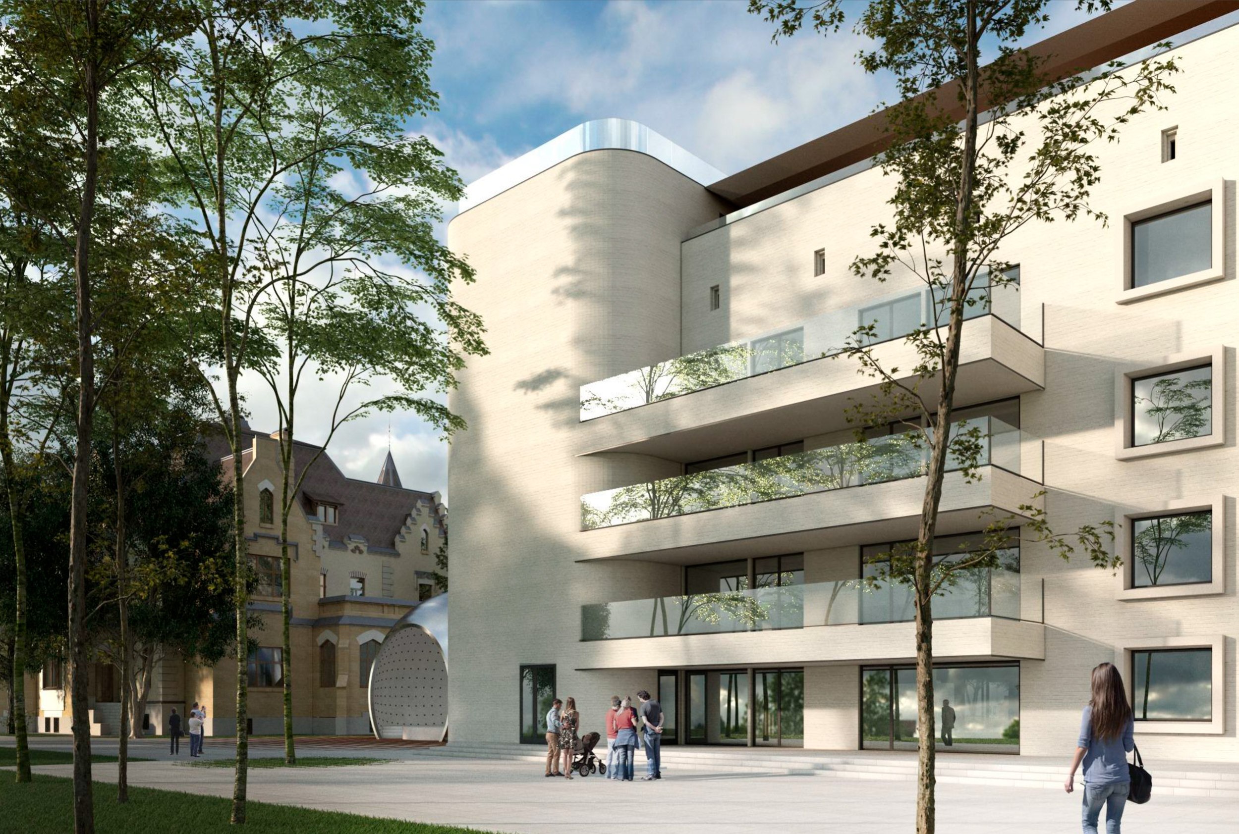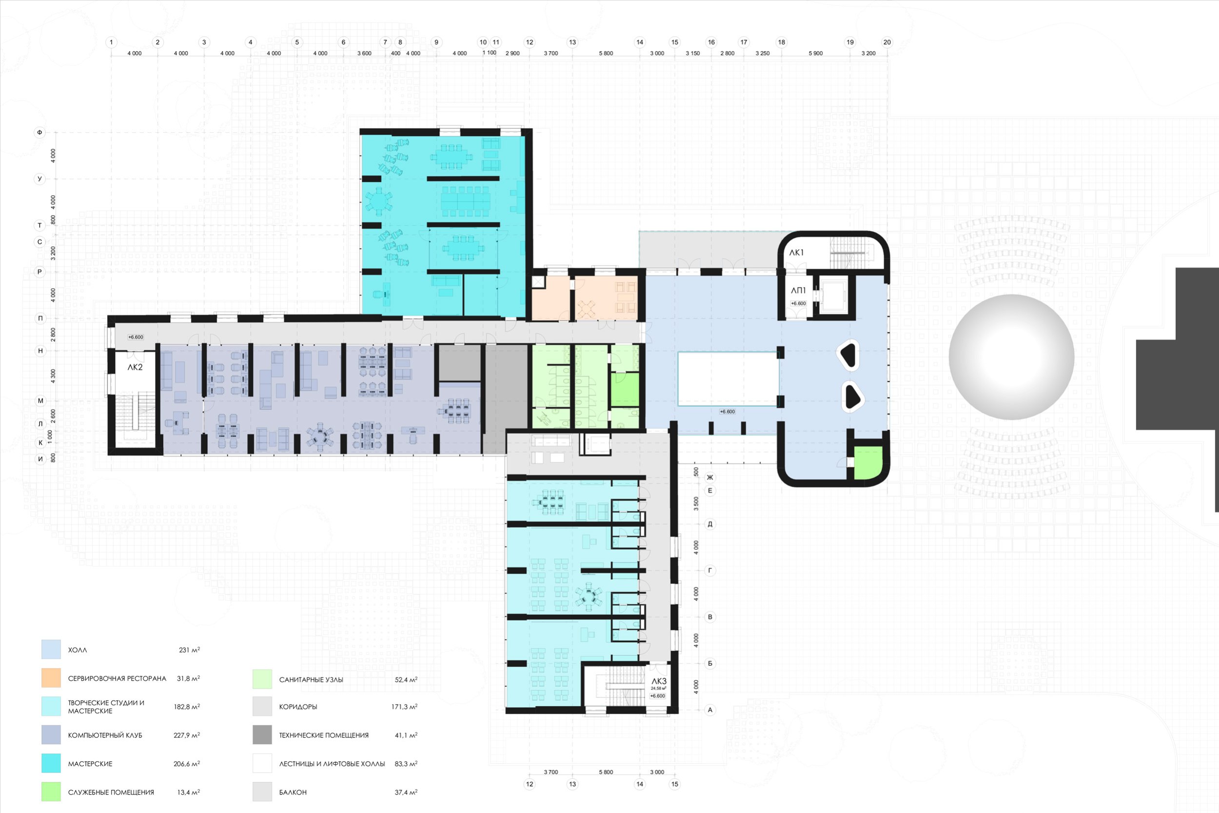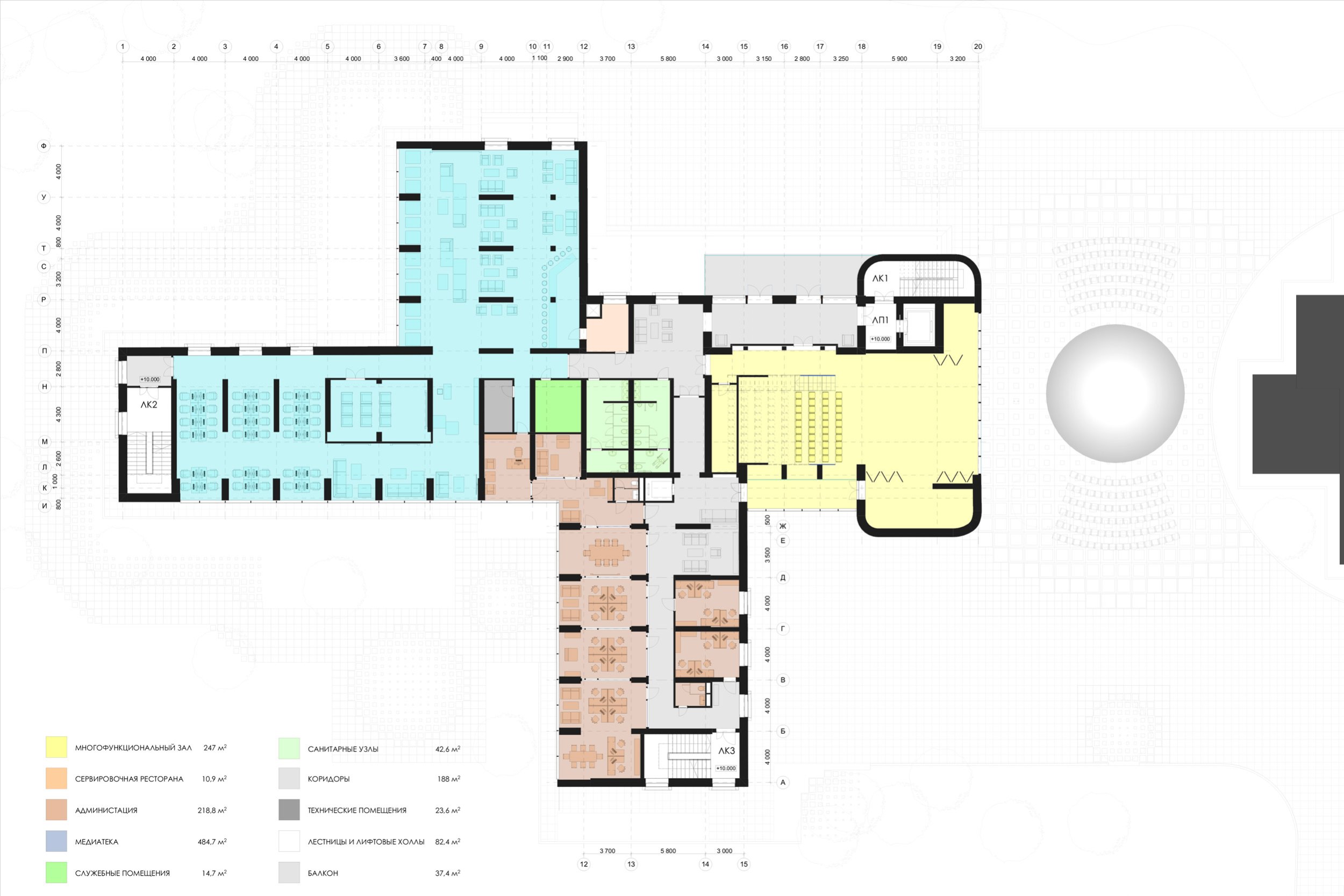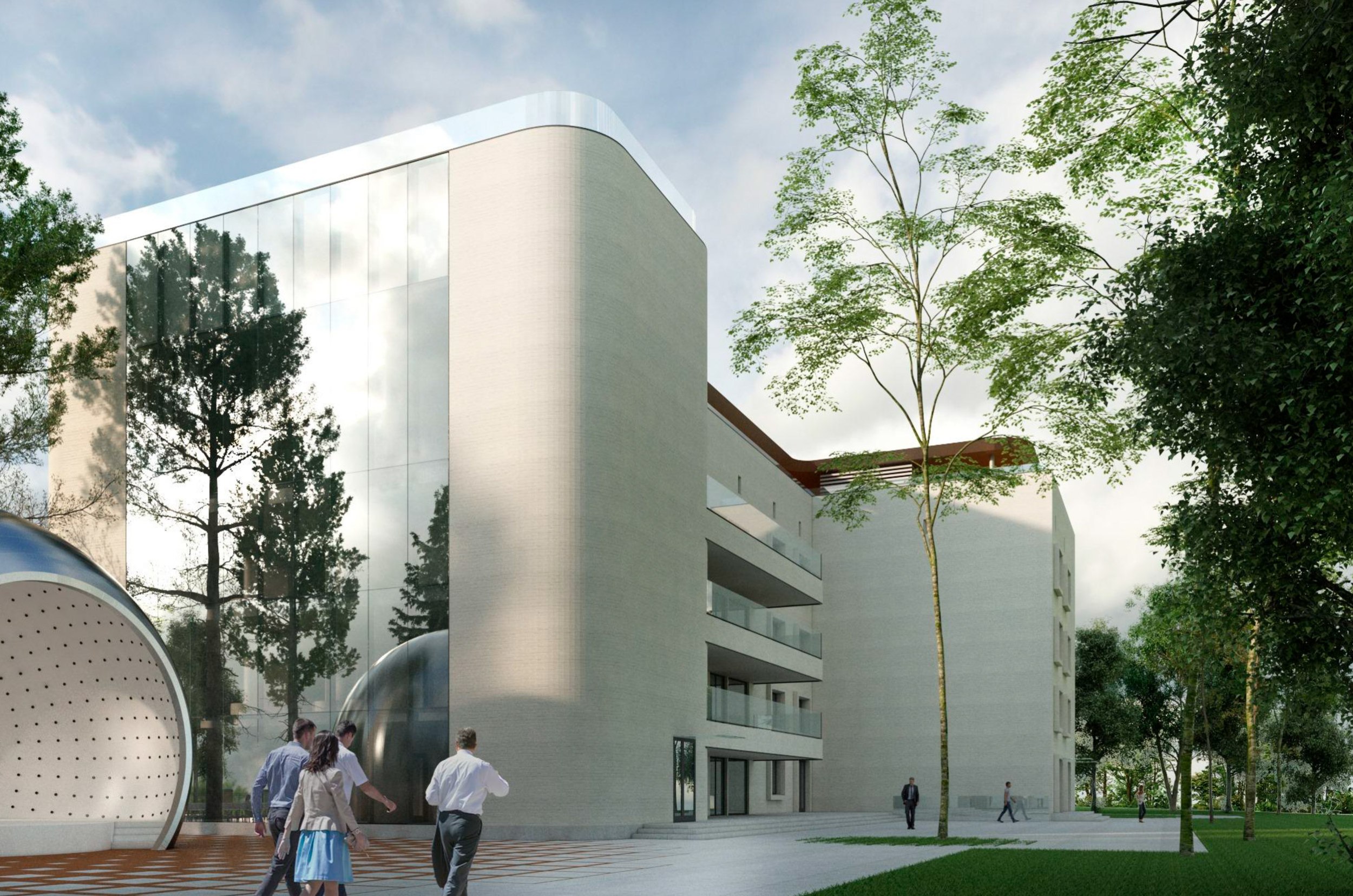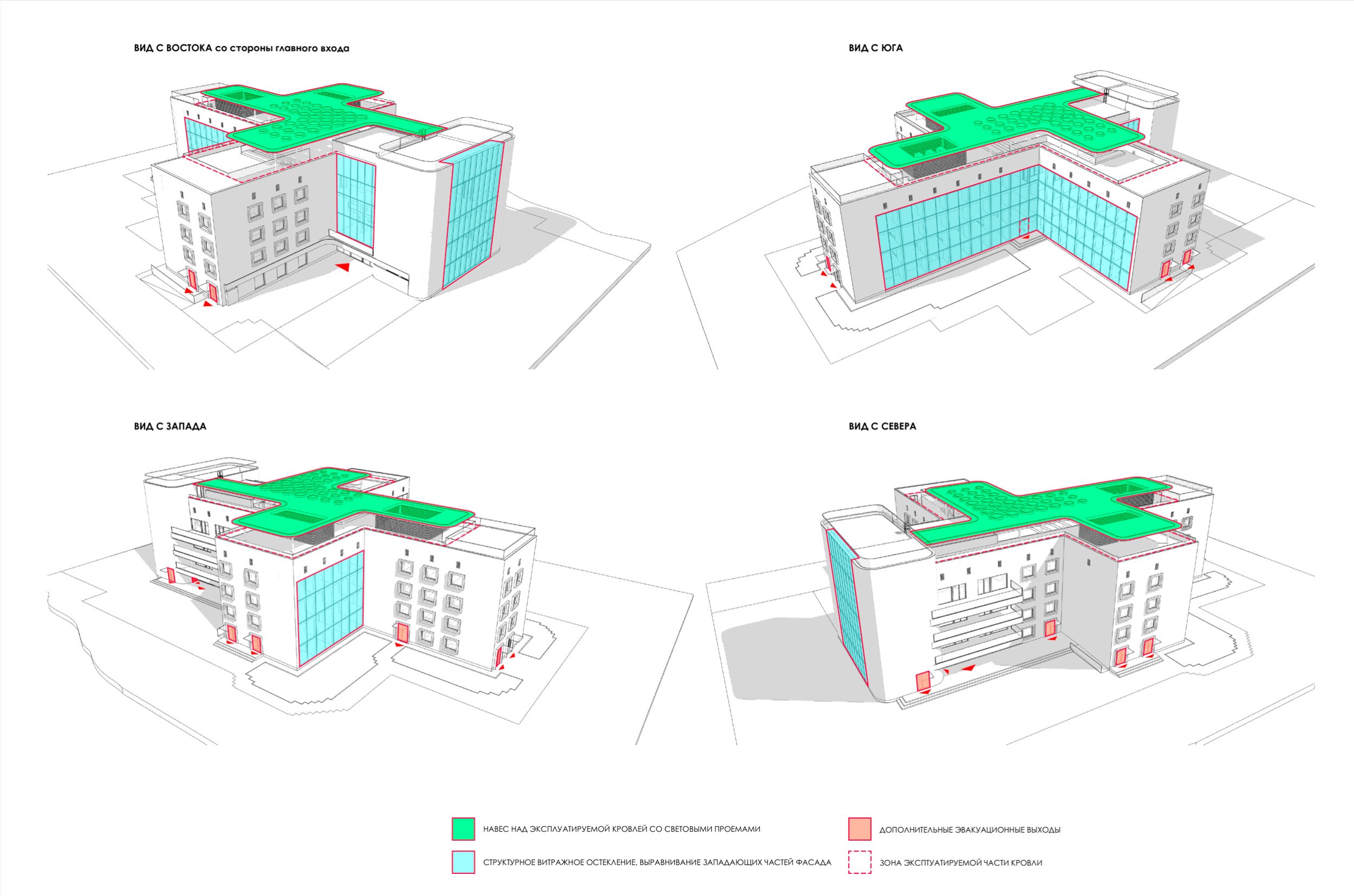 Нейтральная цветовая гамма и гладкие зеркальные поверхности фасада зрительно растворяют массивный объем в окружающем ландшафте. Кровля станет эксплуатируемой, что позволит проводить культурные мероприятия на открытом воздухе с прекрасными видами на природу.