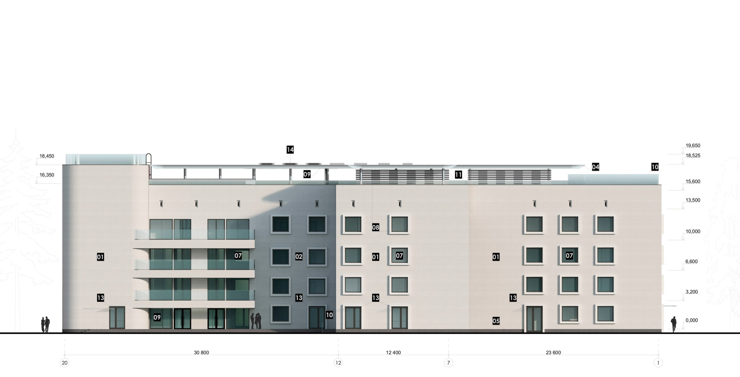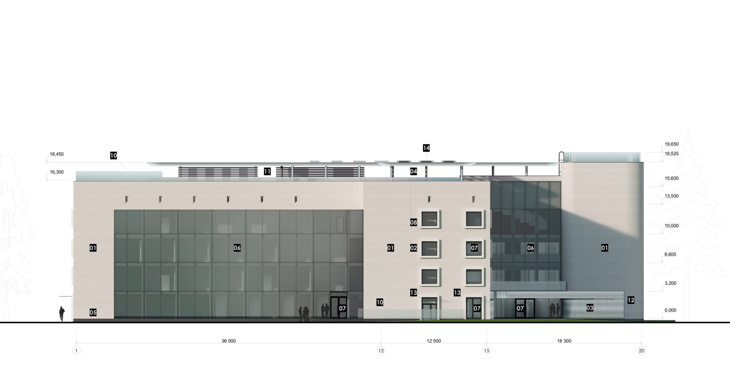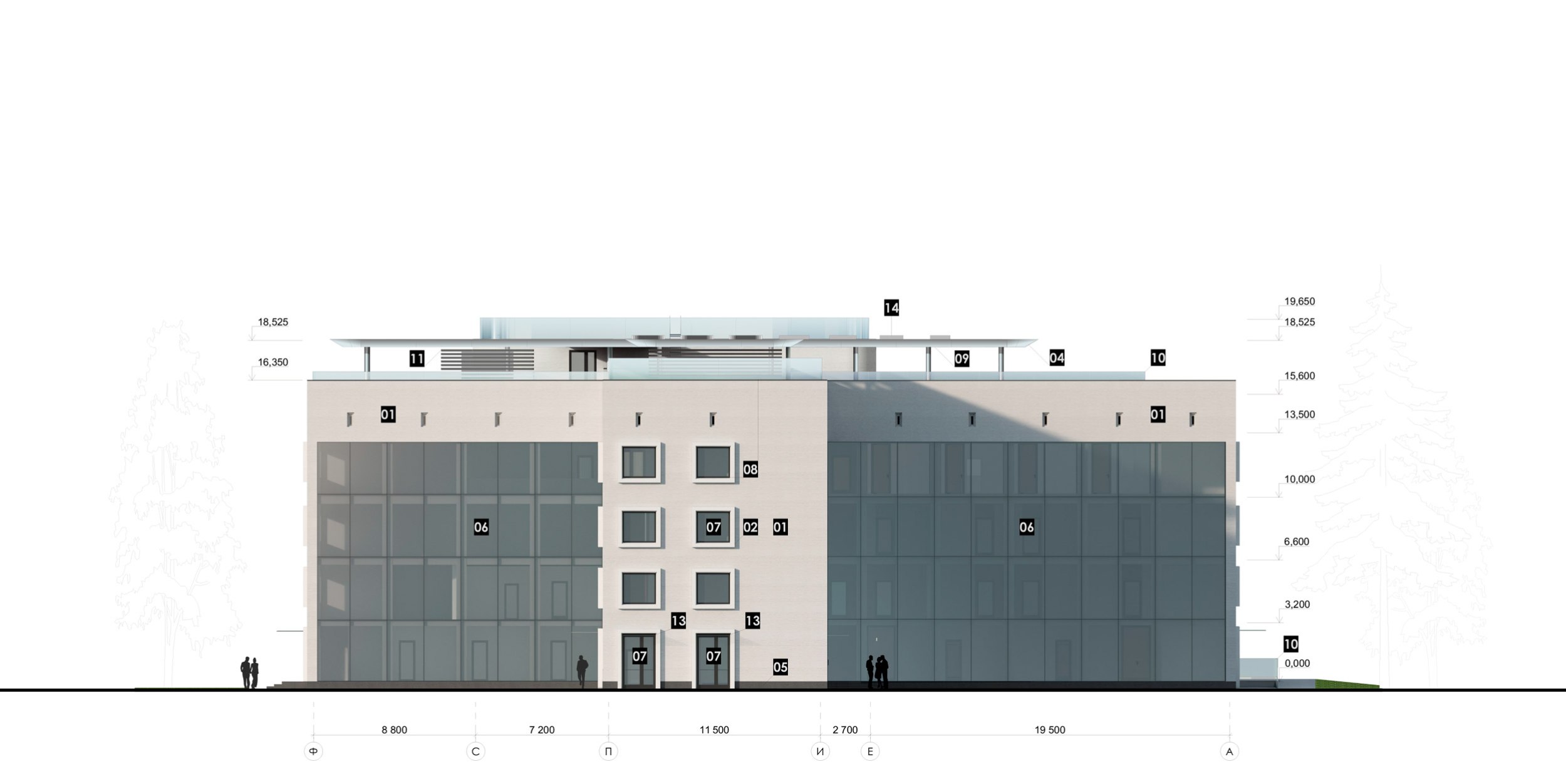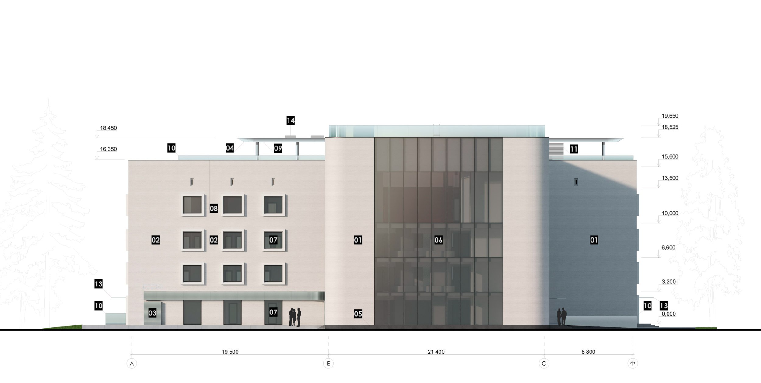 Основные параметры: 4 надземных и 1 подземный этаж, общая площадь – 8050 м², включая эксплуатируемую кровлю (1044 м²). Конструктивная схема – стеновая, перекрытия – железобетонные многопустотные. Цоколь и входные группы облицовываются тёмно-серым гранитом. Проектом предусмотрены новый пассажирский лифт, реконструкция лестниц, устройство двухсветного вестибюля и общественного пространства на кровле с лёгким металлическим навесом, не превышающим высоту существующего здания.