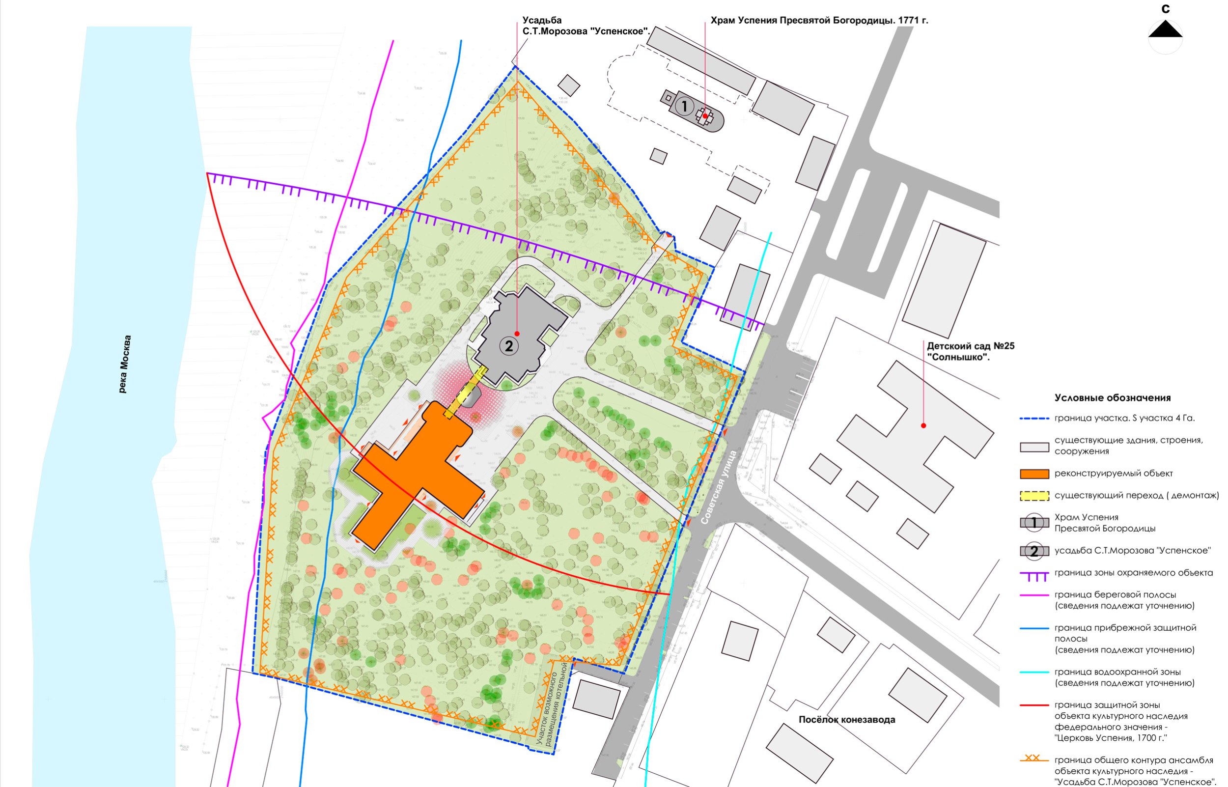 Концепция реконструкции предполагает создание культурно-просветительского центра «Успенское» с сохранением архитектурных особенностей и уважением к историческому контексту. Для восстановления визуальной автономности усадьбы демонтируется надземный переход между корпусом и основным зданием. Фасады сохраняют кирпичную облицовку с изменением цветового решения на более нейтральное. В зоне лоджий появится структурное витражное остекление с лёгким зеркальным эффектом, отражающим парк и визуально «растворяющим» здание в ландшафте.