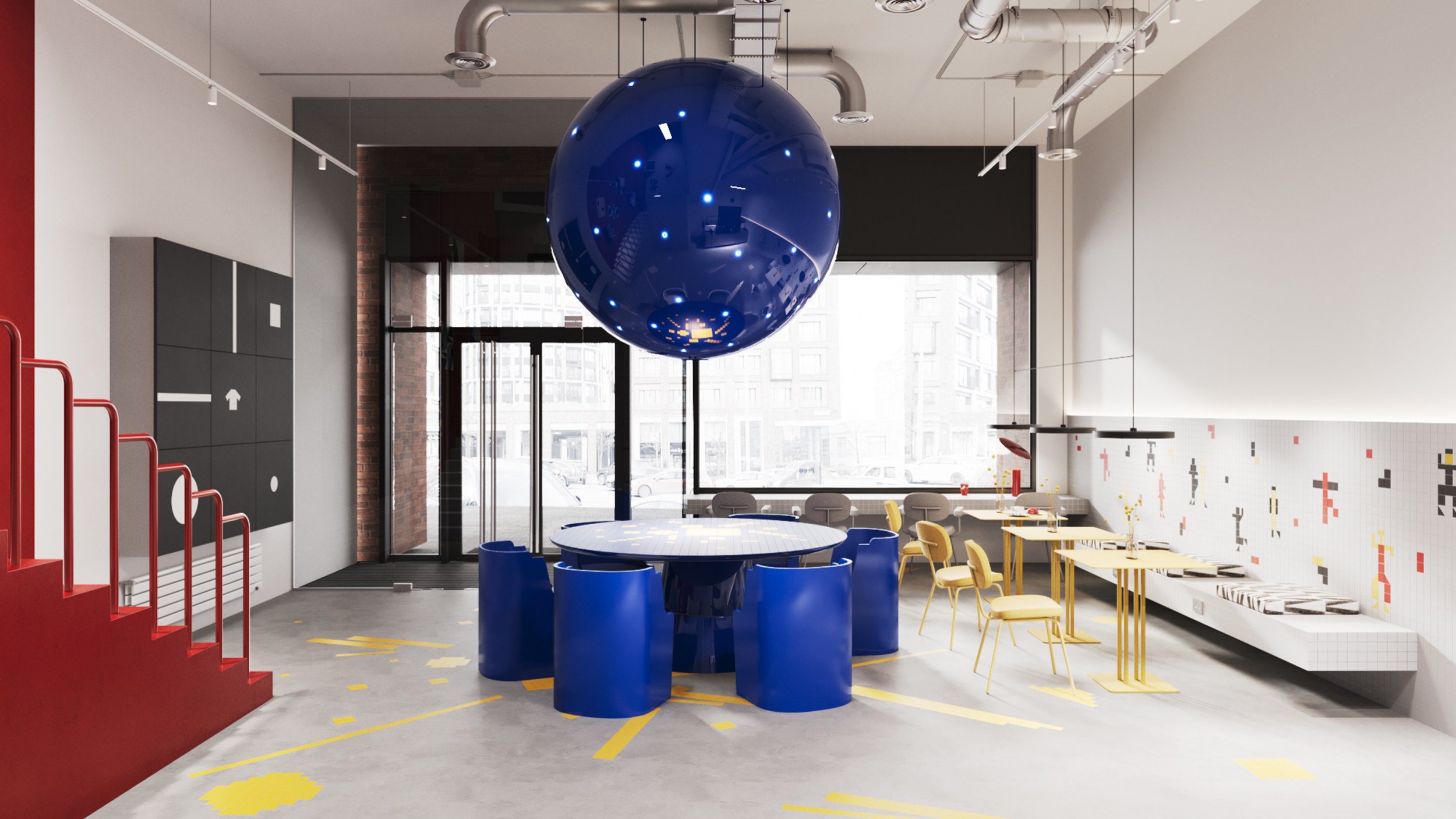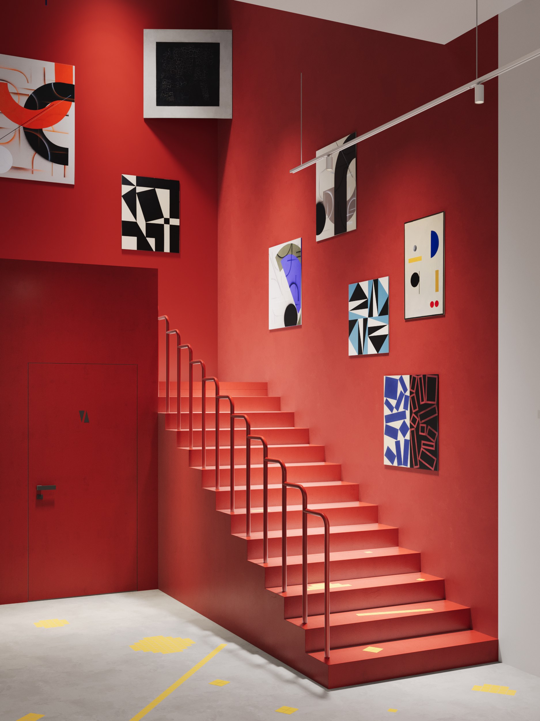 Отделка пола отсылает нас к «Супрематической композиции» Малевича, представляет собой множество геометрических фигур с прямоугольником в центре, пронзённым лучом. Композиция выражает протест художника против натурализма и предметности. В нашем прочтении реализована с помощью декоротивных вставки желтой плитки в наливной бетон.