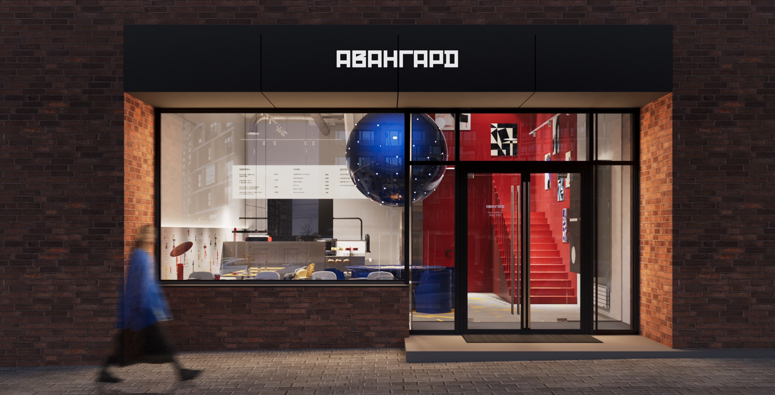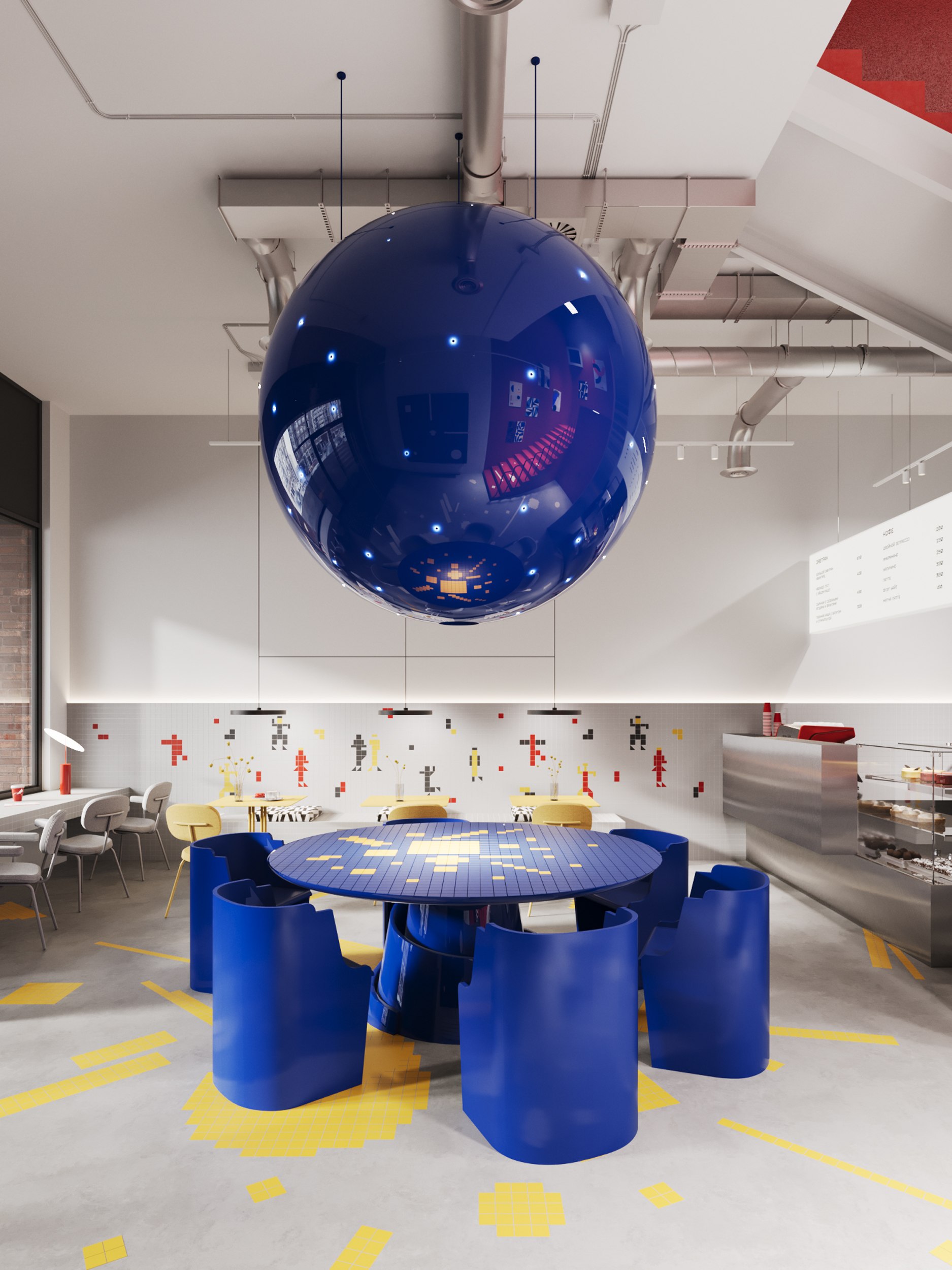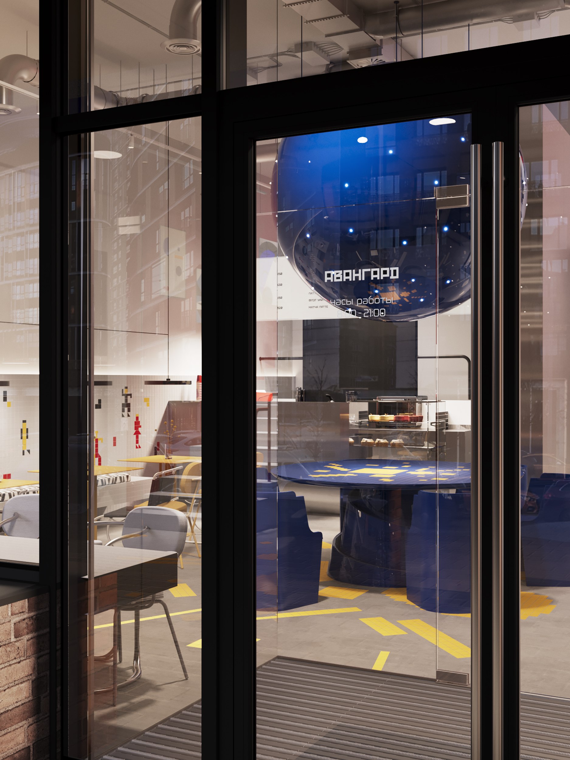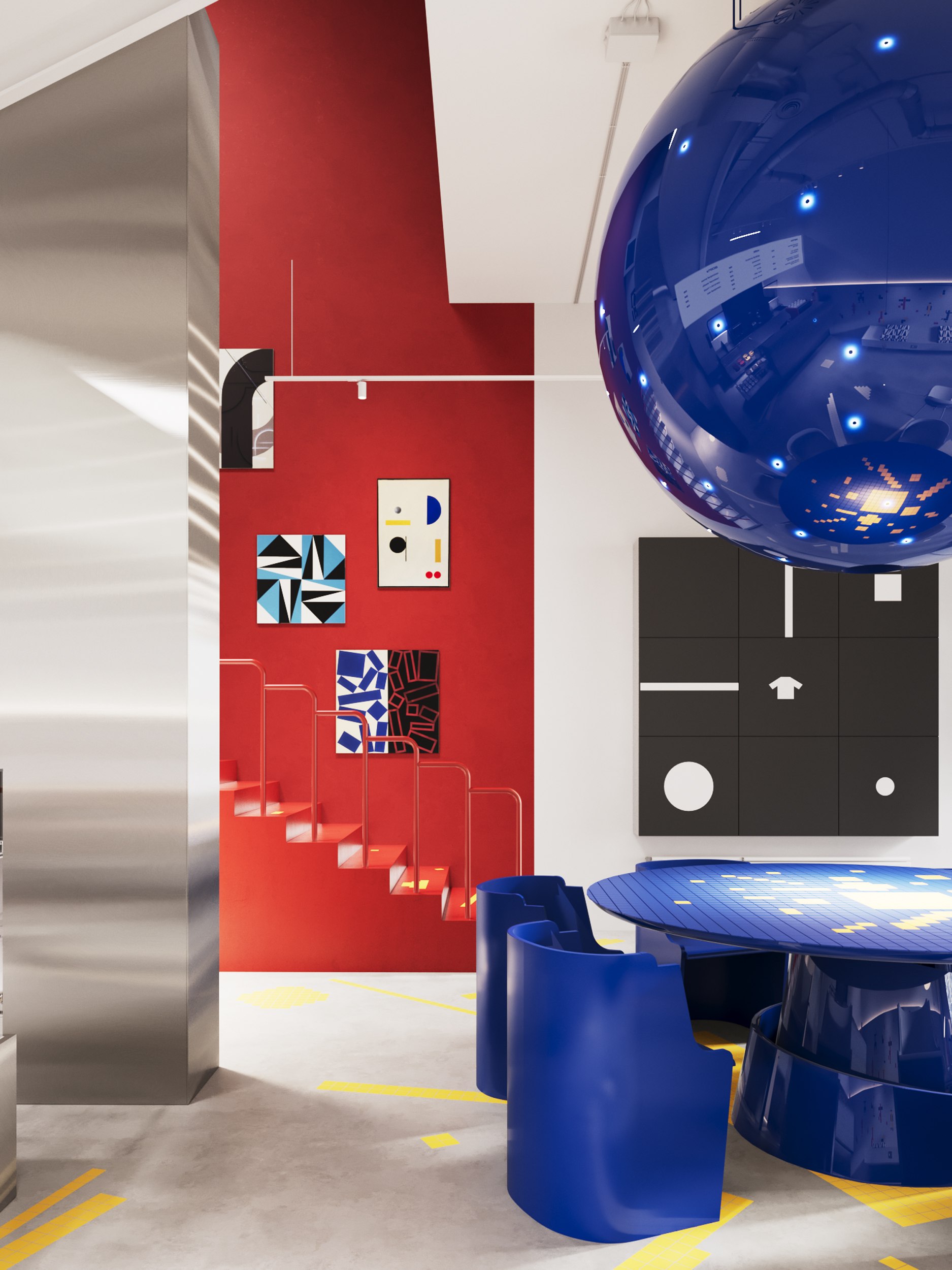 Каждая деталь интерьера содержит отсылку к знаковым произведениям эпохи авангарда, которые удалось переосмыслить и применить к конкретному пространству. Под новым углом предстают узнаваемые символы – «Башня Татлина», «Чёрный квадрат», «Супрематическая композиция» и «Спортсмены» Малевича.