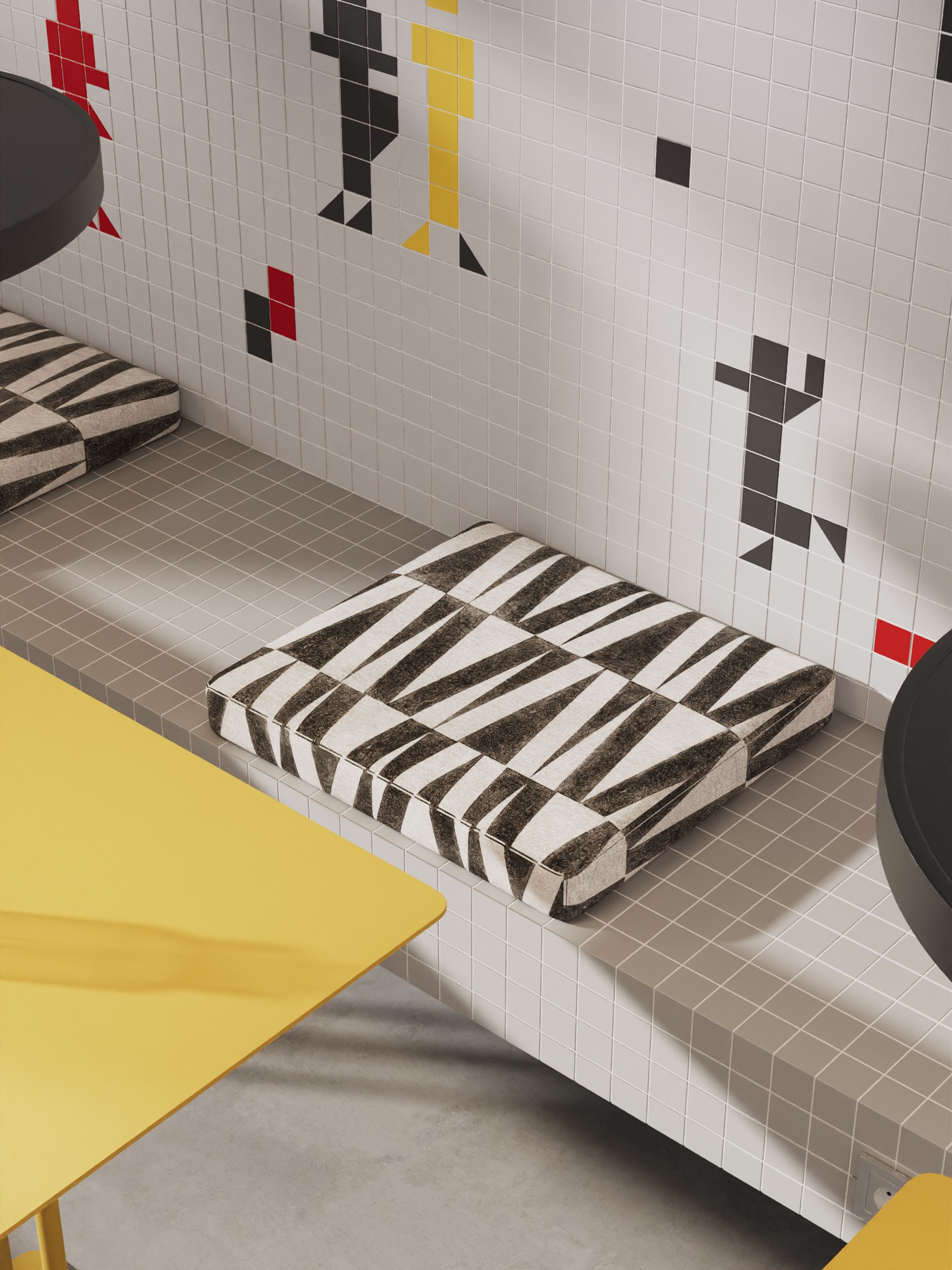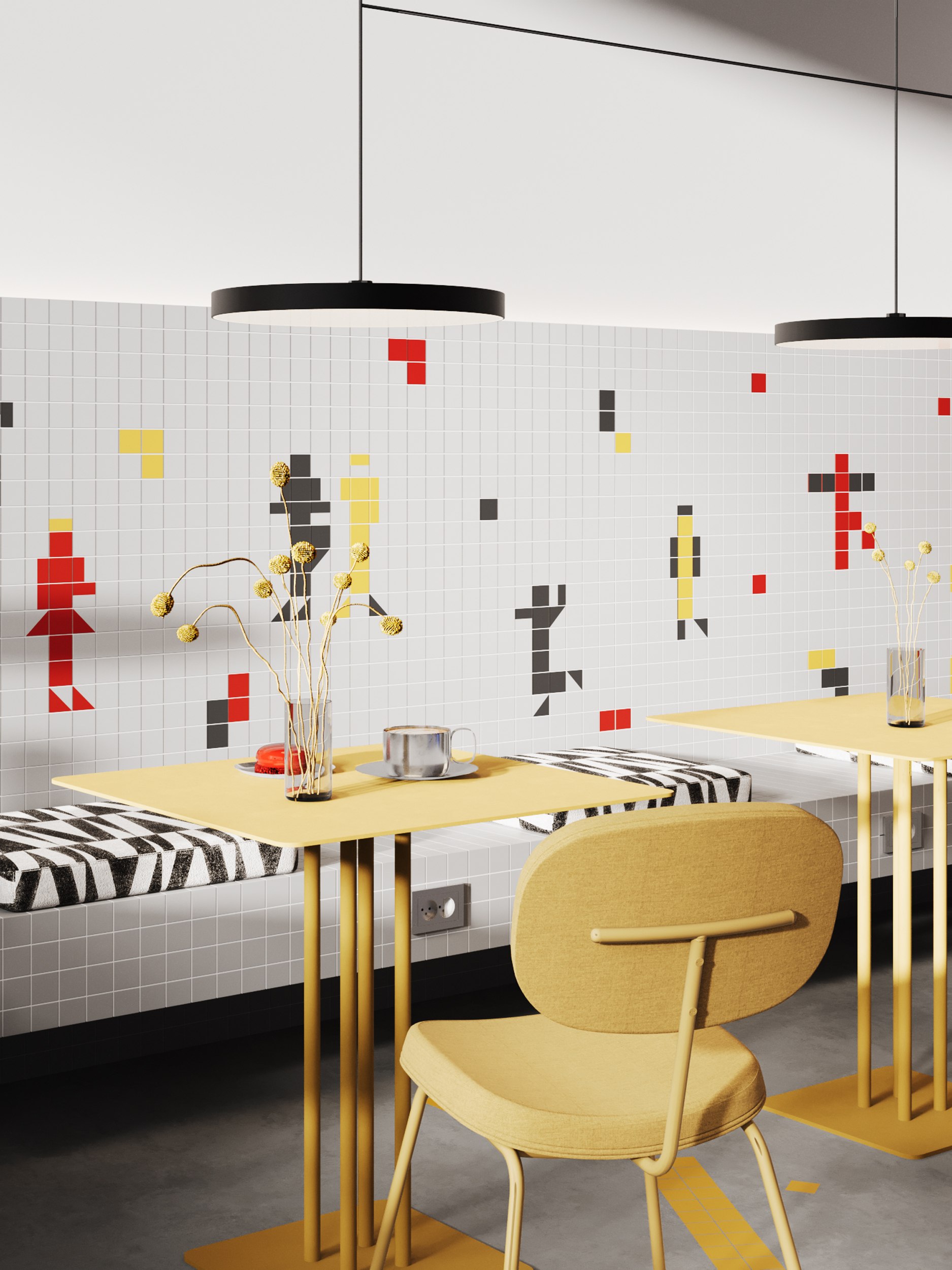 «Спортсмены» Малевича стали прообразом для цветных человечков, выложенных из малоформатной плитки в зоне обеденной скамьи. Они просты и абстрактны, состоят из геометрических фигур и повторяют основные цвета использованные в интерьере. Композиция является отражением идеологии супрематизма, которая подчеркивает важность абстрактных форм и цветов в искусстве.