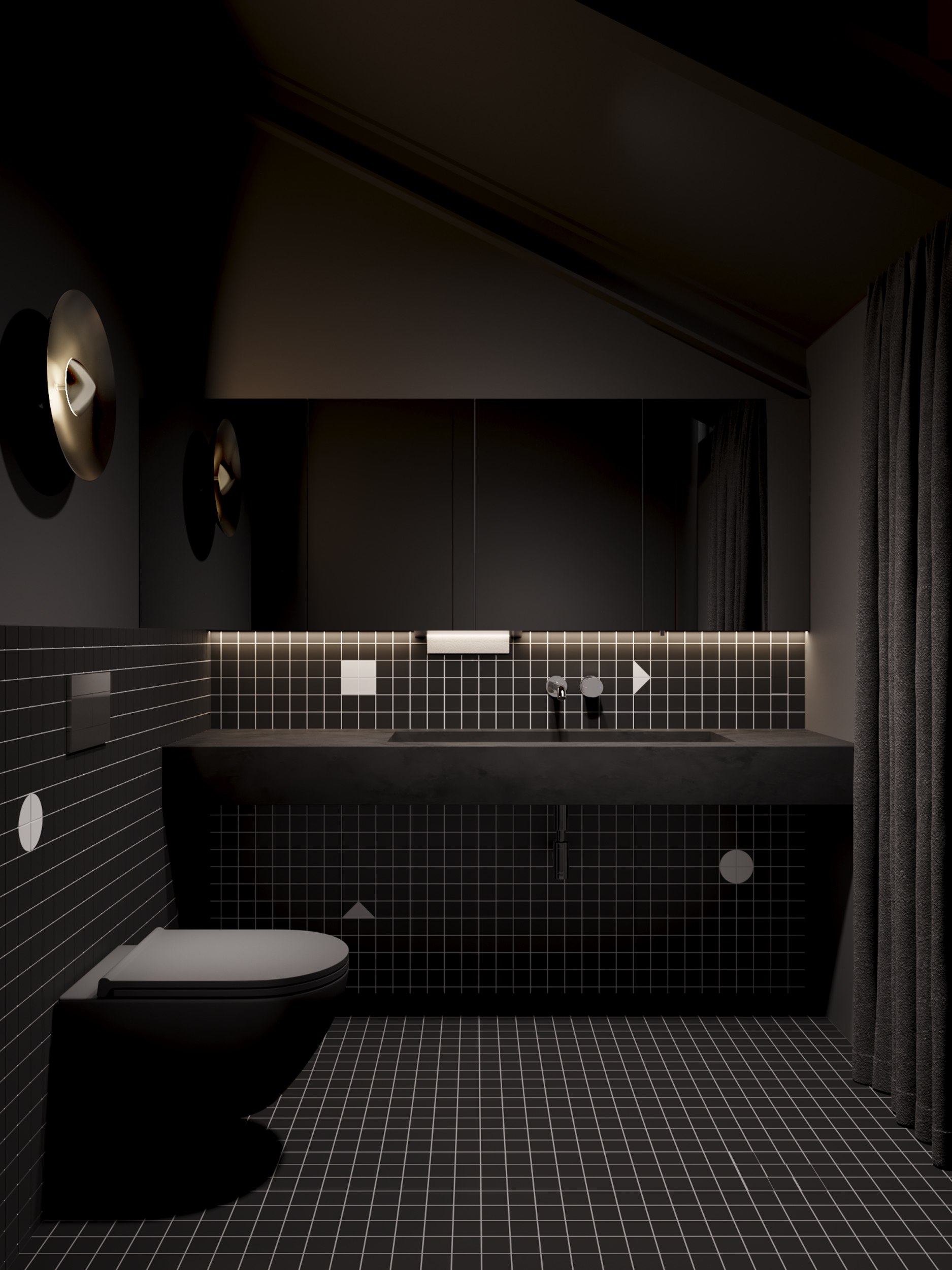 Санузел. Объединённый гостевой санузел со входом в кладовую уборочного инвентаря. Полностью чёрное помещение – самый укромный уголок. Акцентами служат мягкий свет и геометричные вставки на плитке.