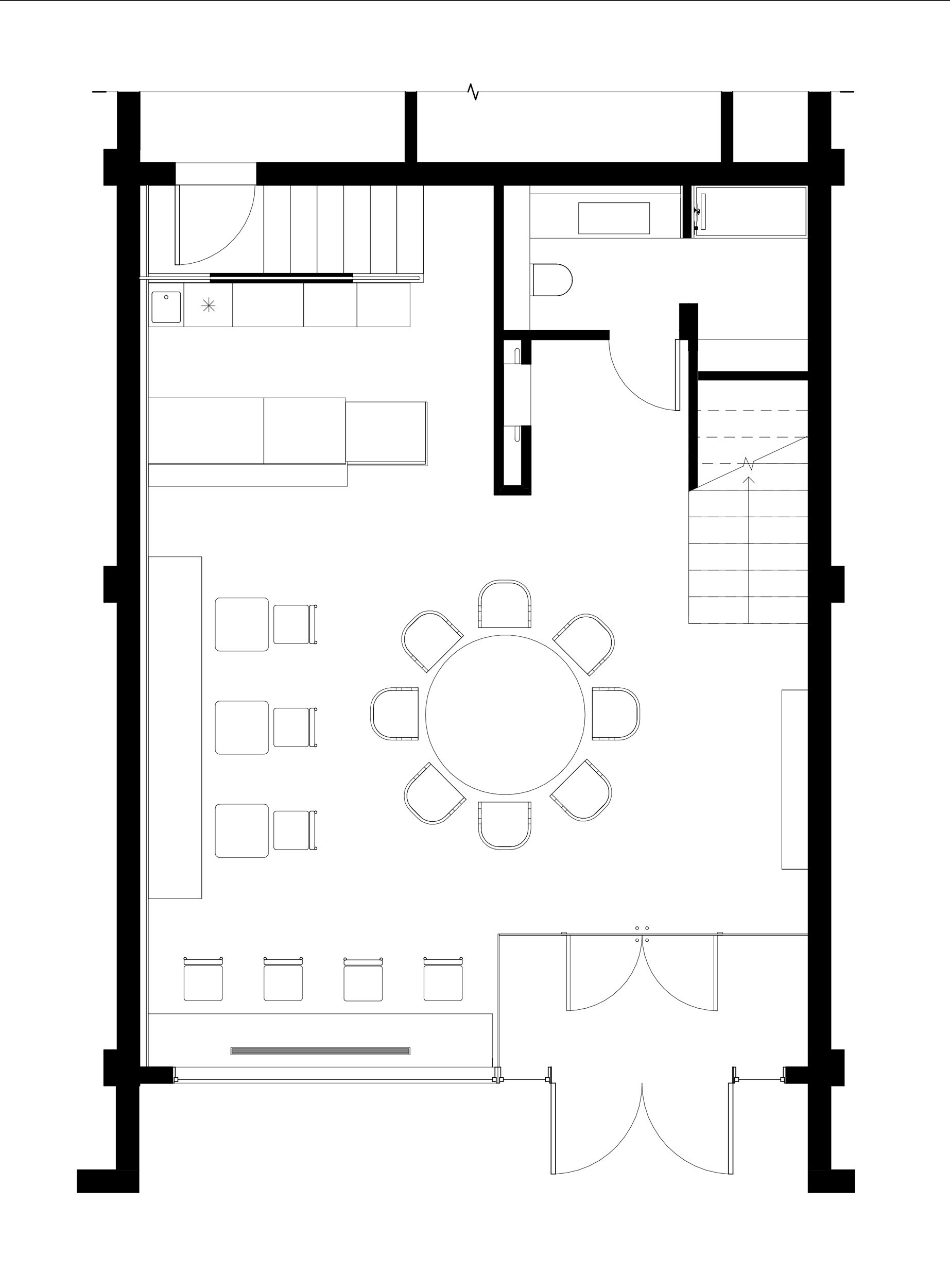 Круг – самая сильная форма, притягивающая взгляд, центр композиции. Центром нашей композиции является круглый коммунальный стол со светильником-сферой. Они видны через стеклянные фасады – это точка фокуса, ориентир для посетителей.
