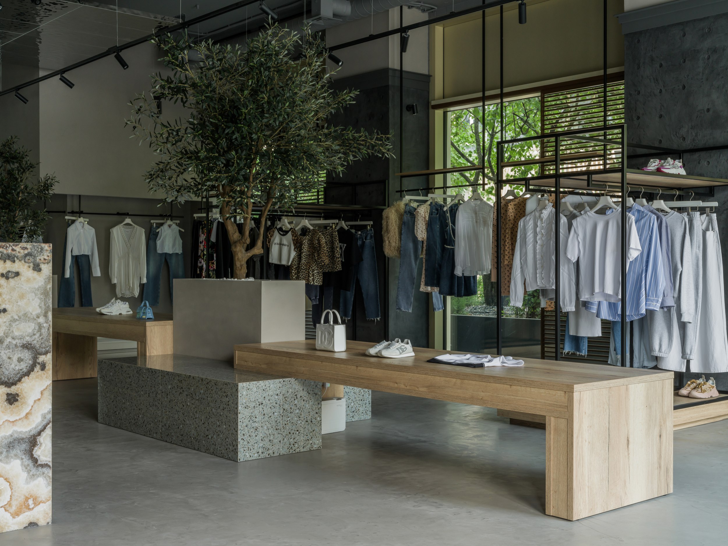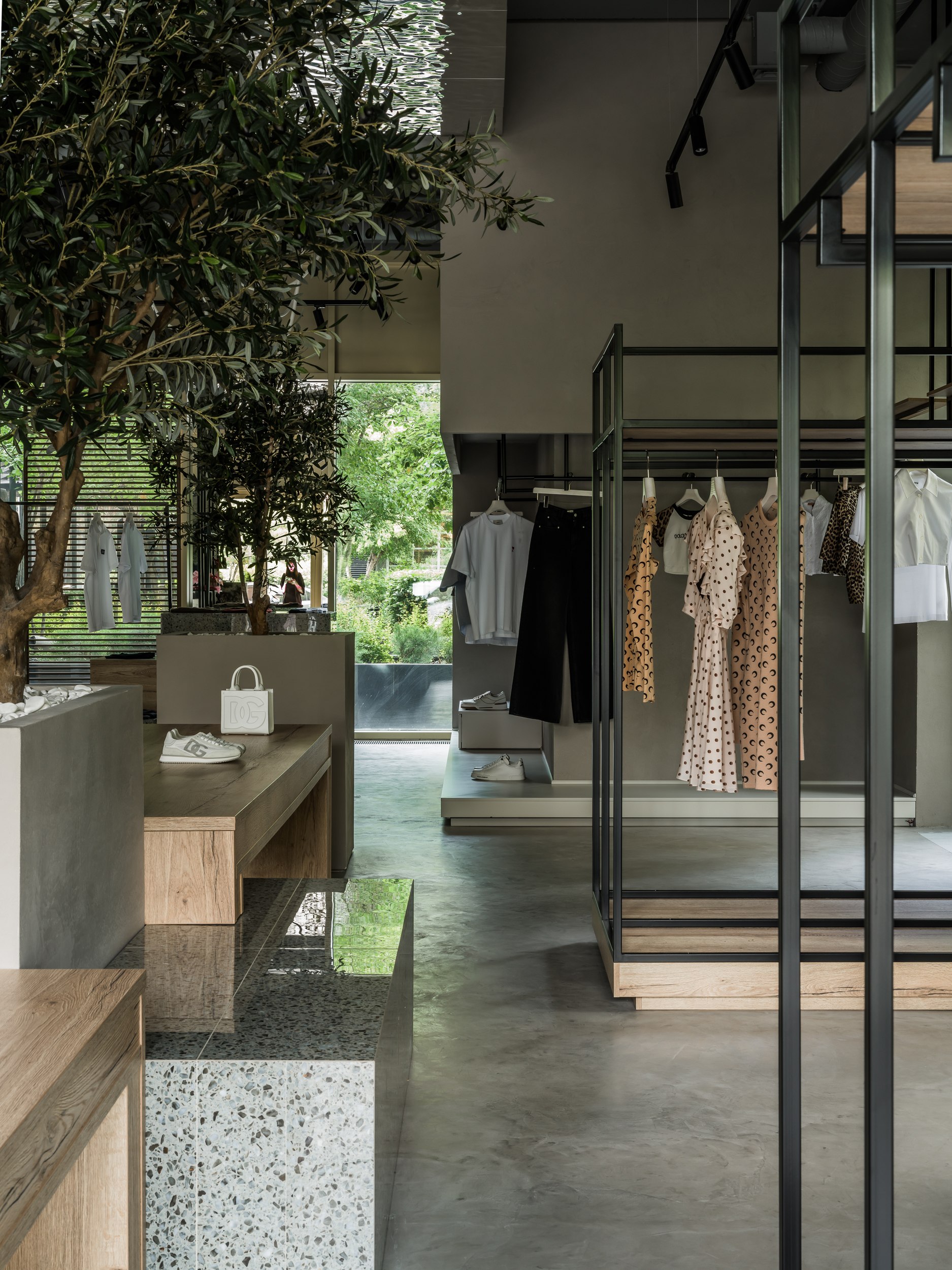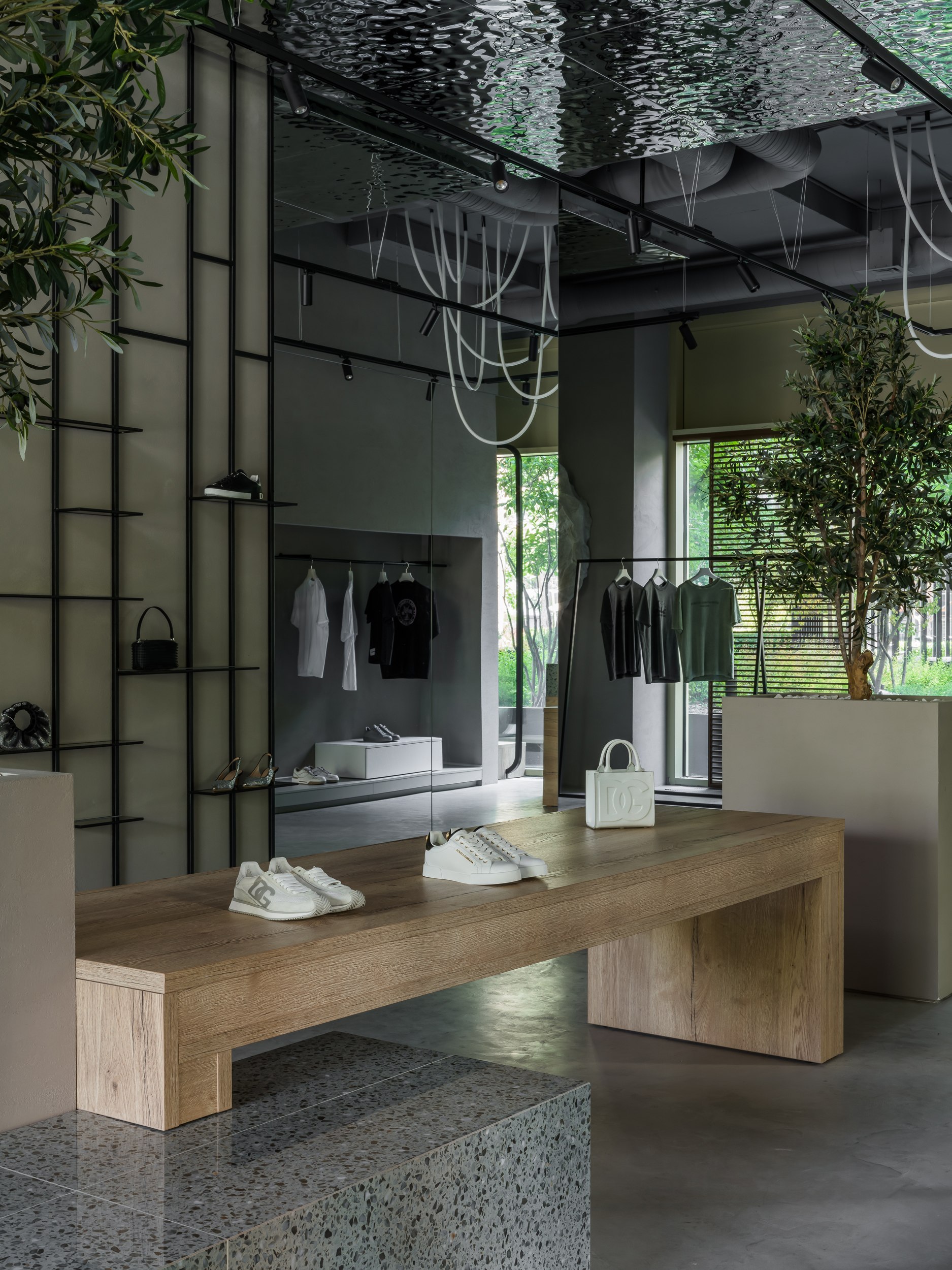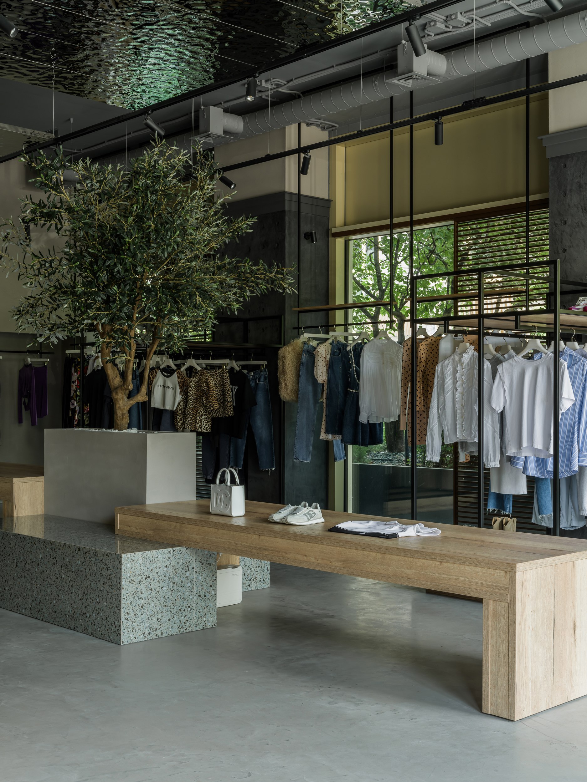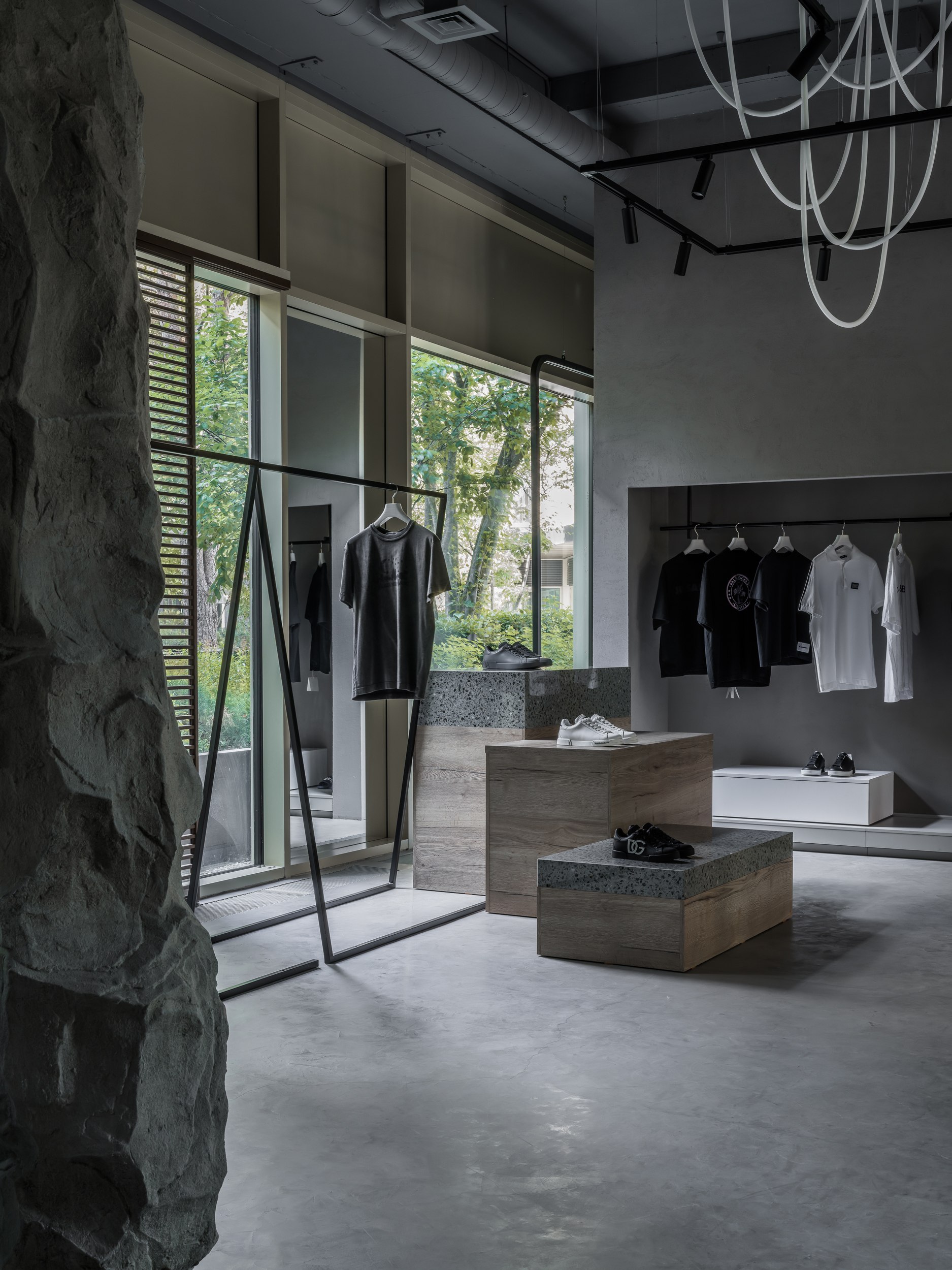Торговое пространство организовано максимально удобно и эстетично: предусмотрены различные варианты экспонирования одежды, продуманная эргономичная кассовая зона и две просторные примерочные. Однако функциональность не ограничилась исключительно торговыми задачами – внутри проекта возник целый мир, который выходит далеко за рамки привычного ритейла.