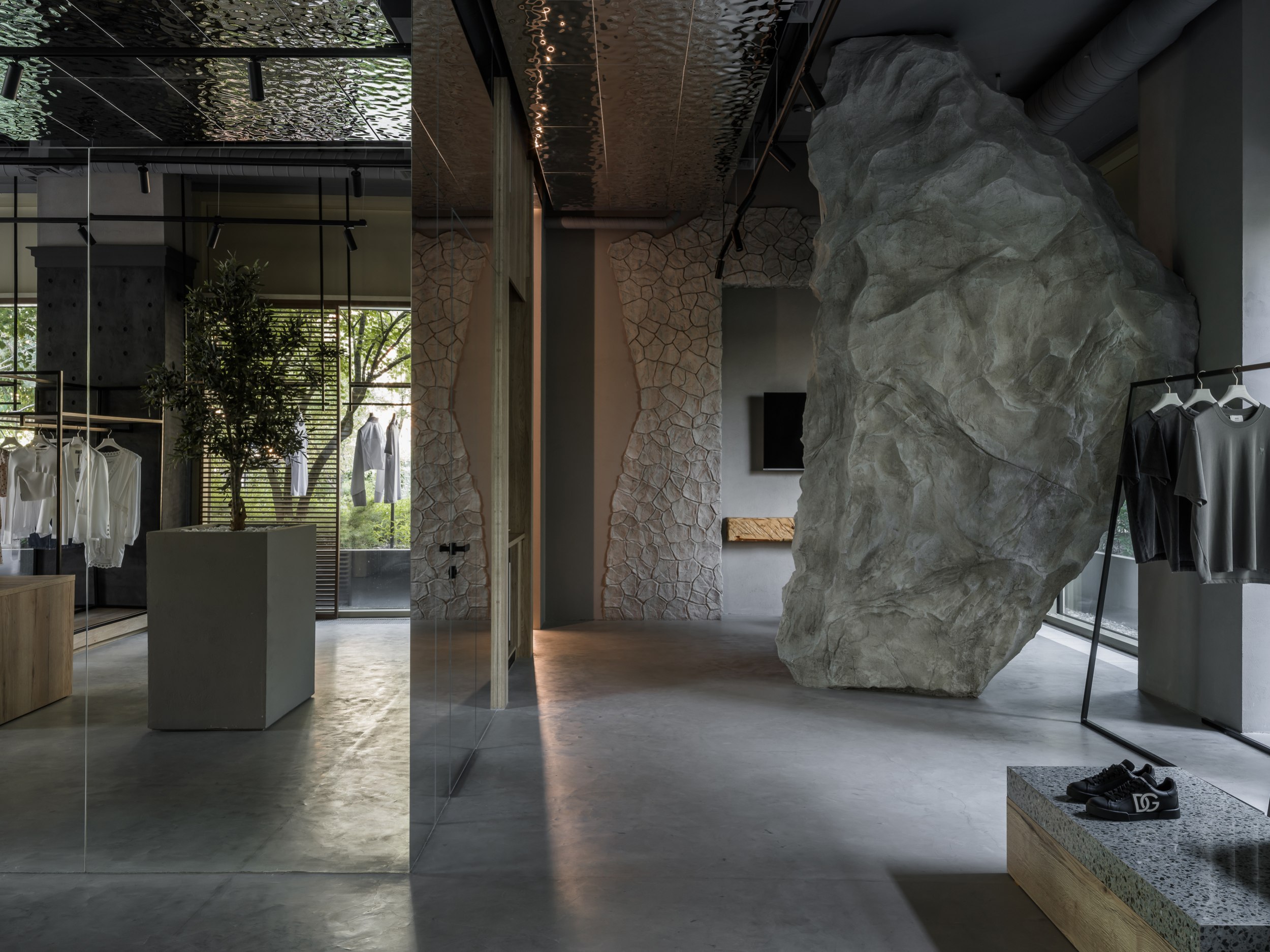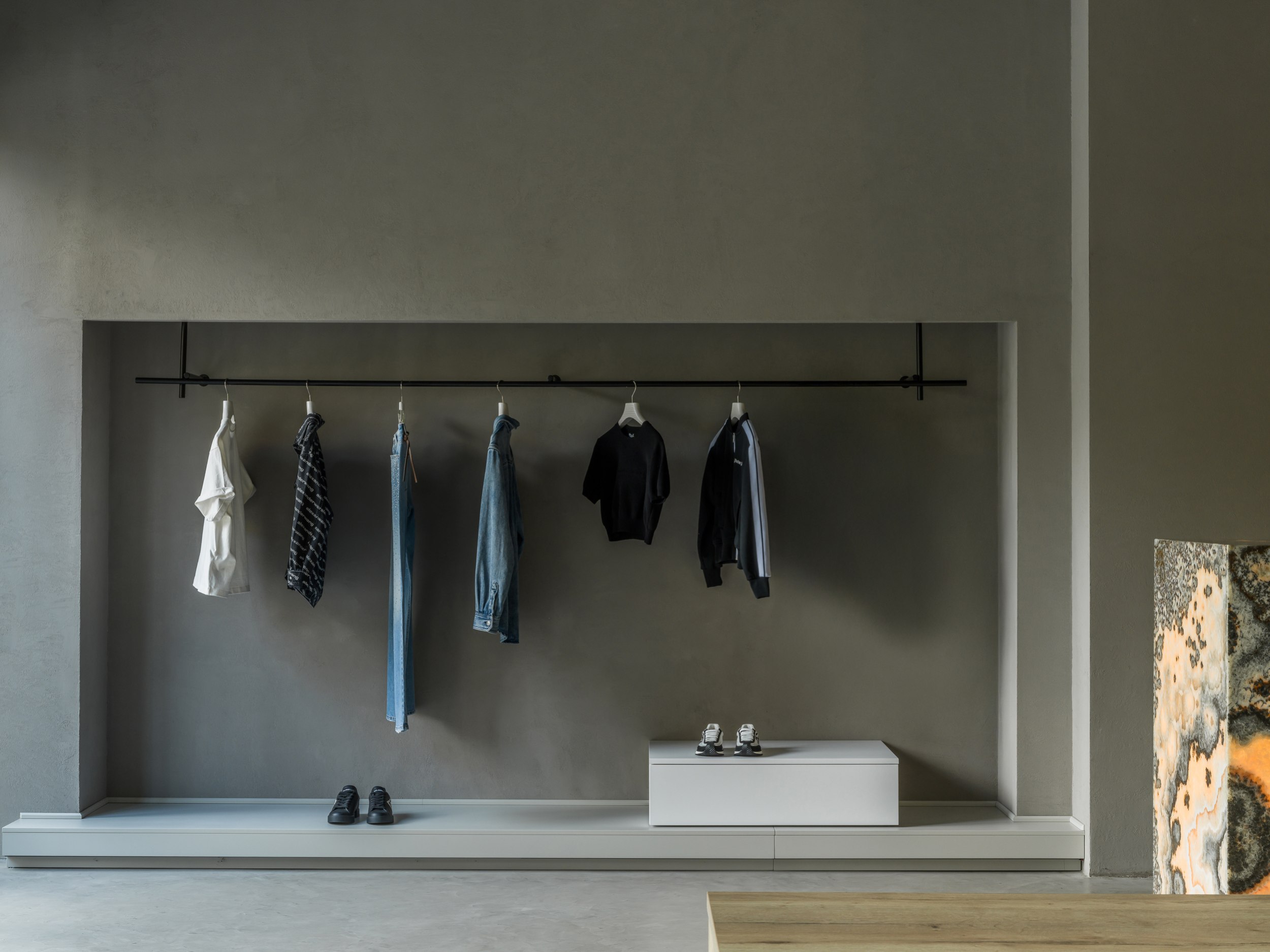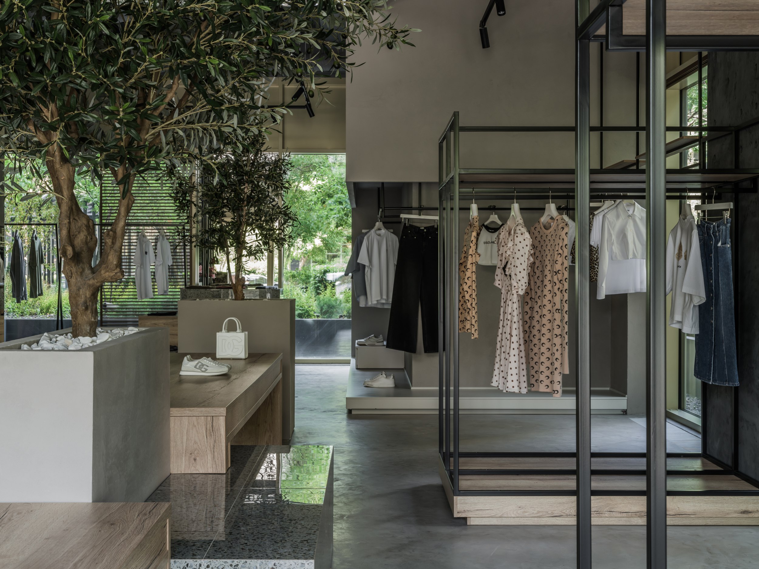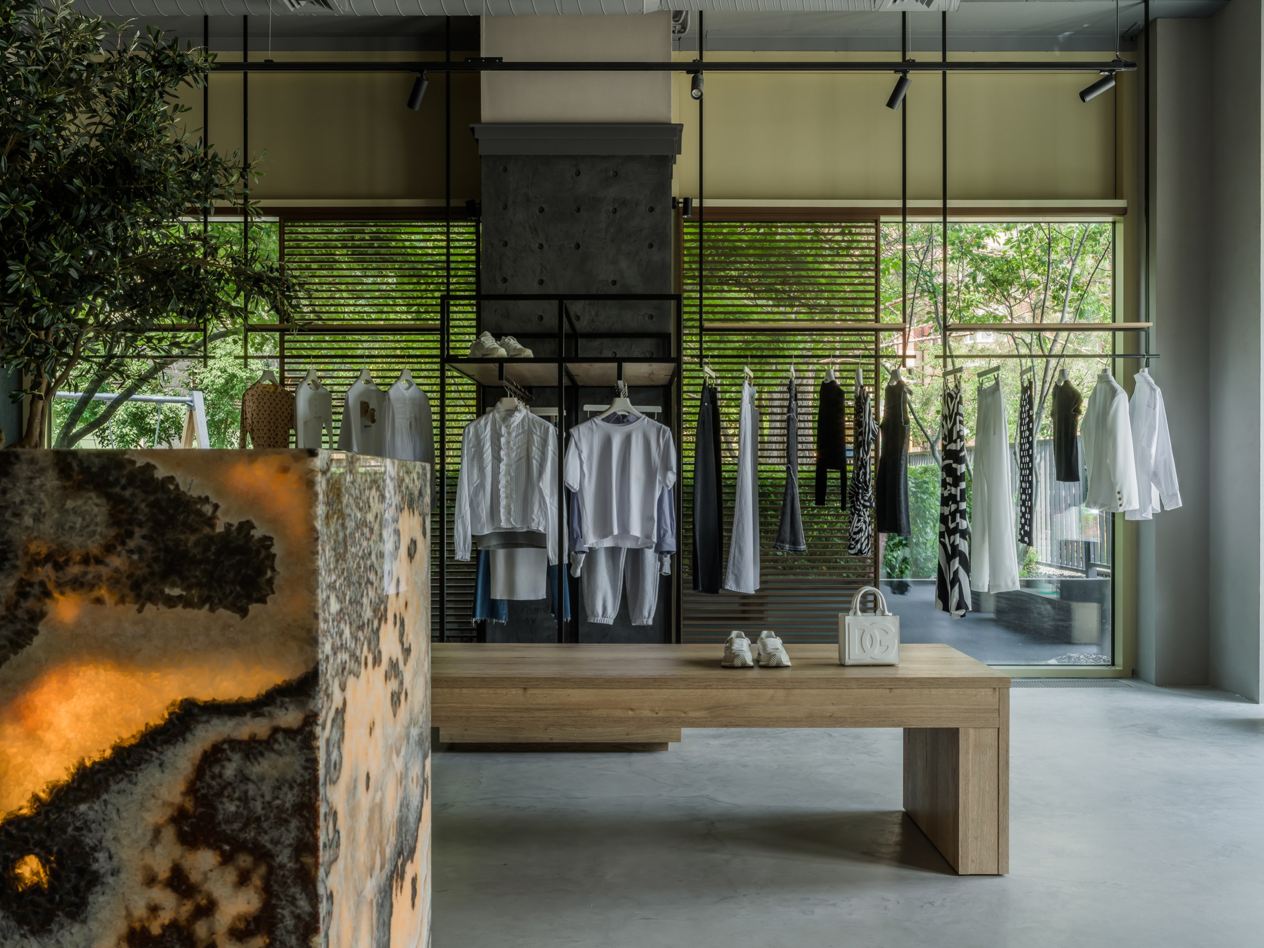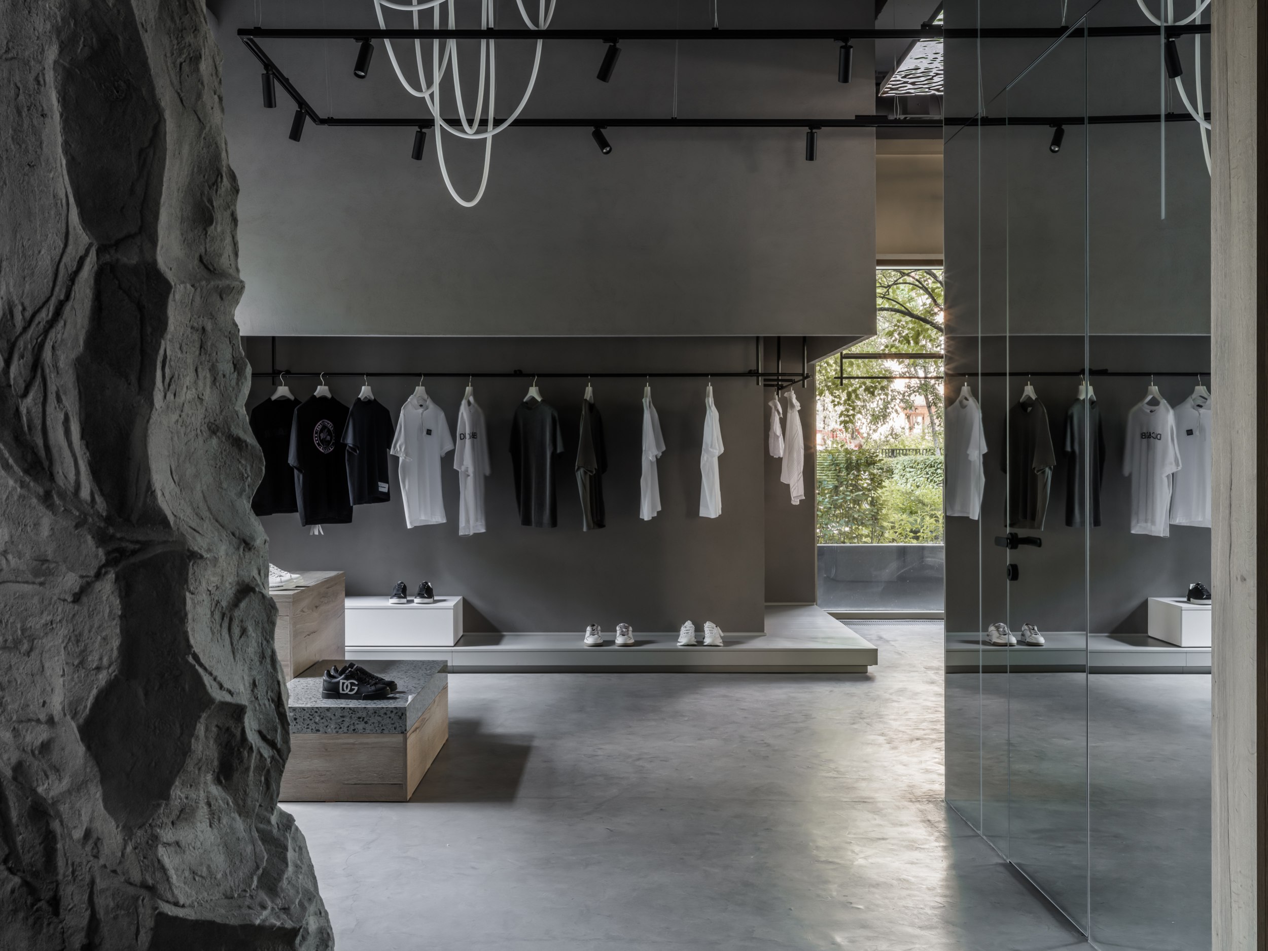 Торговое пространство организовано максимально удобно и эстетично: предусмотрены различные варианты экспонирования одежды, продуманная эргономичная кассовая зона и две просторные примерочные. Однако функциональность не ограничилась исключительно торговыми задачами – внутри проекта возник целый мир, который выходит далеко за рамки привычного ритейла.