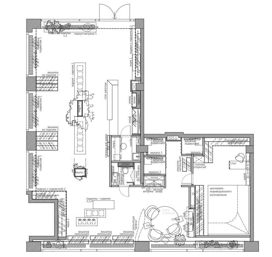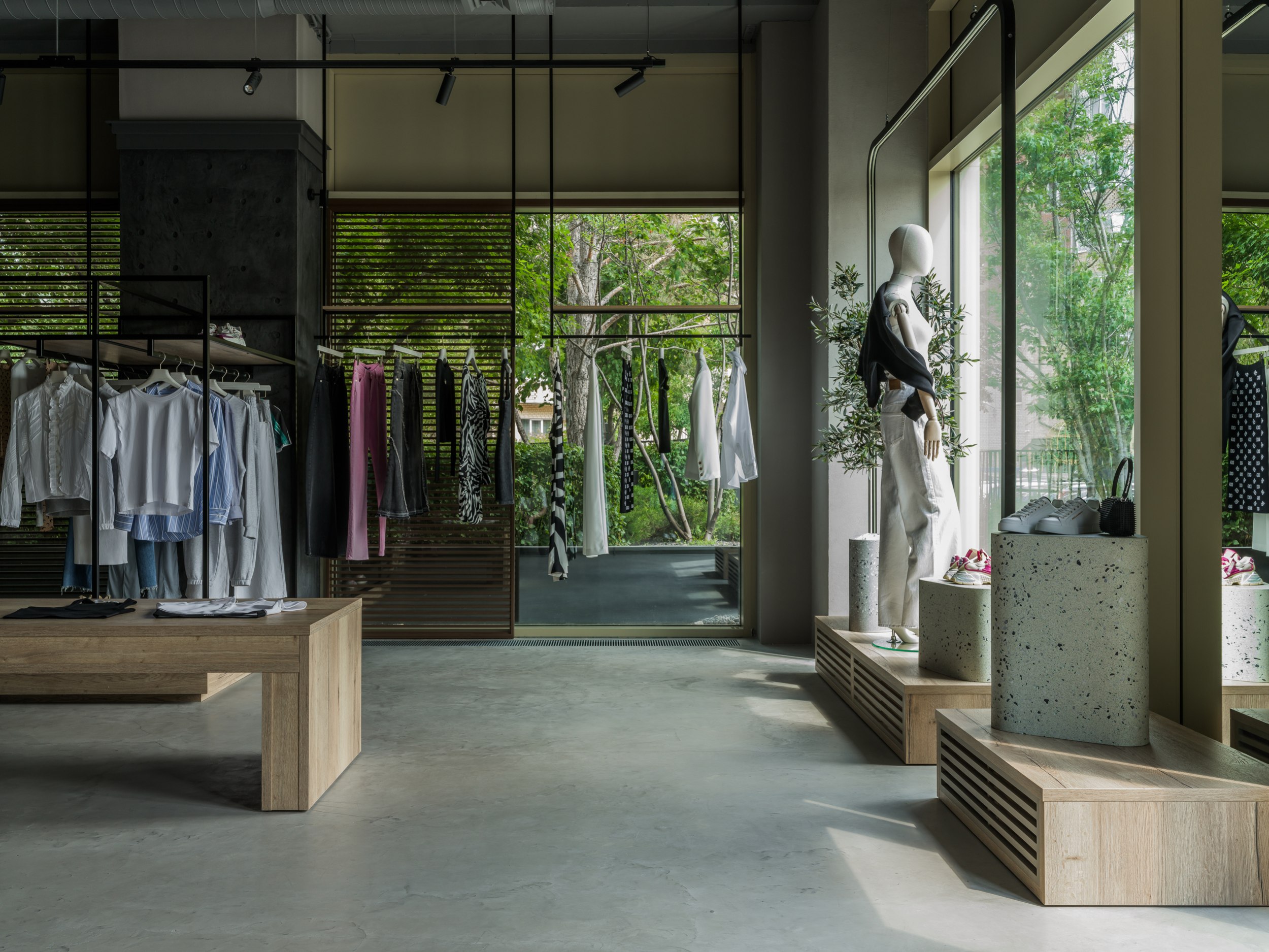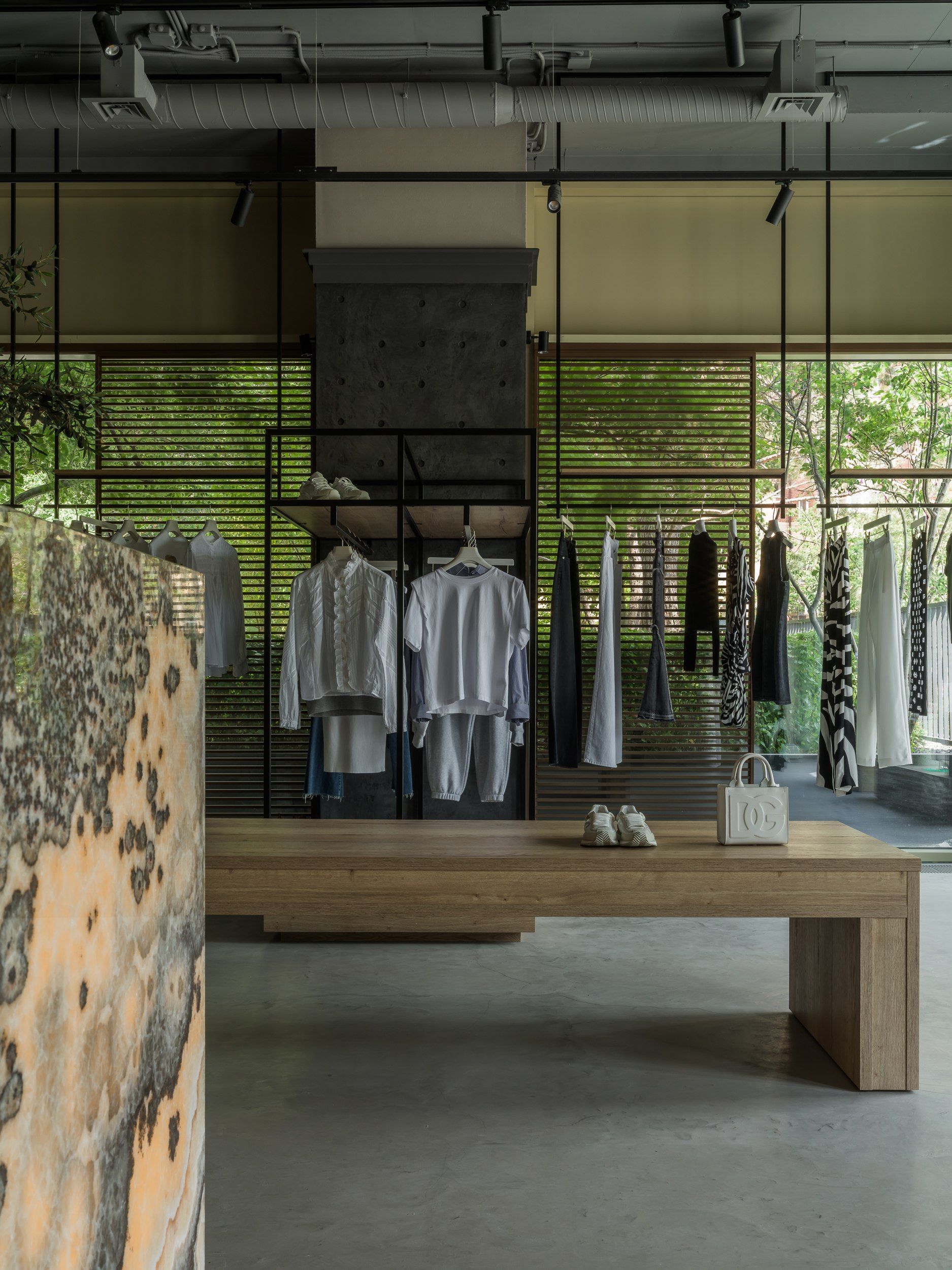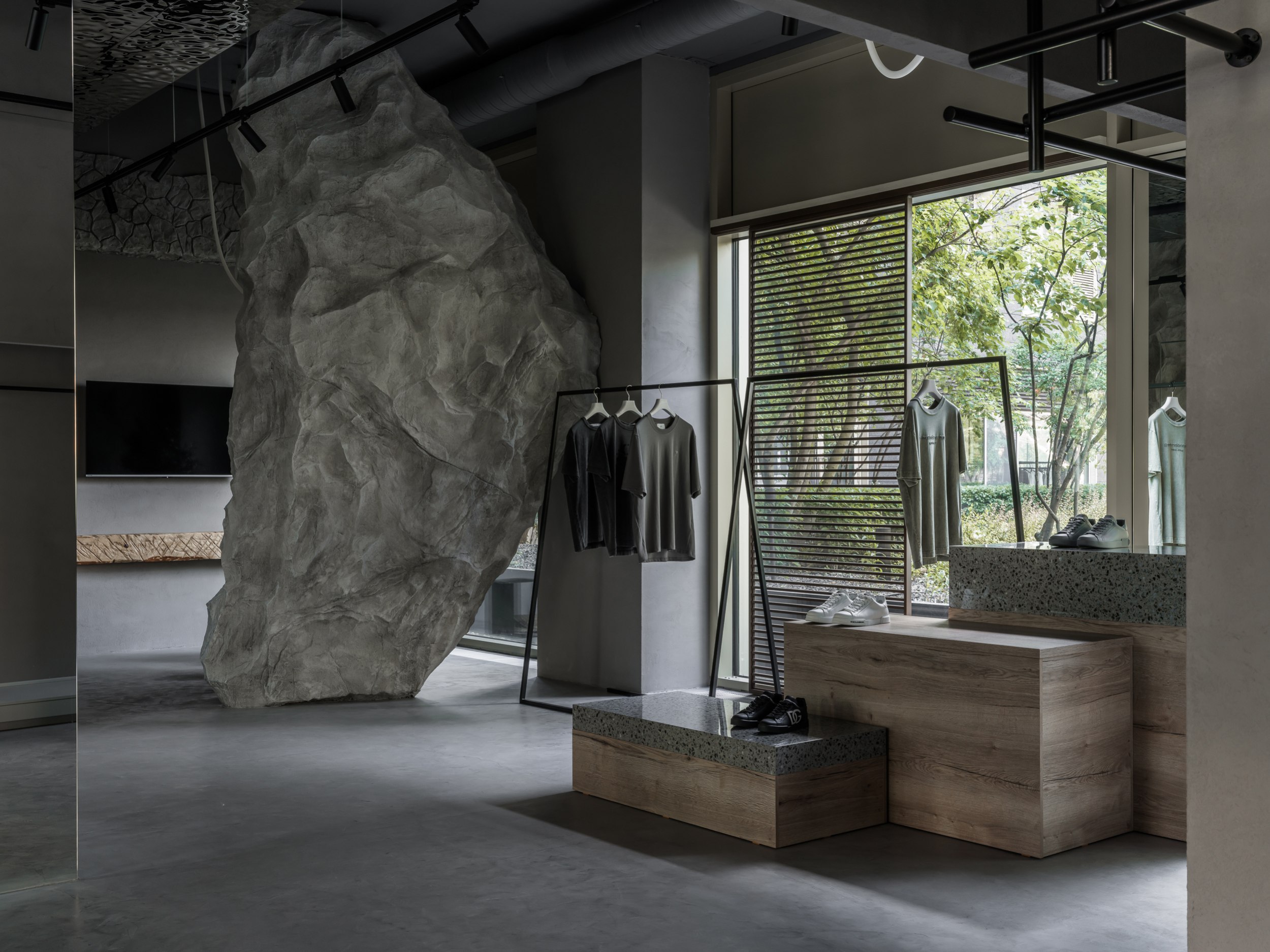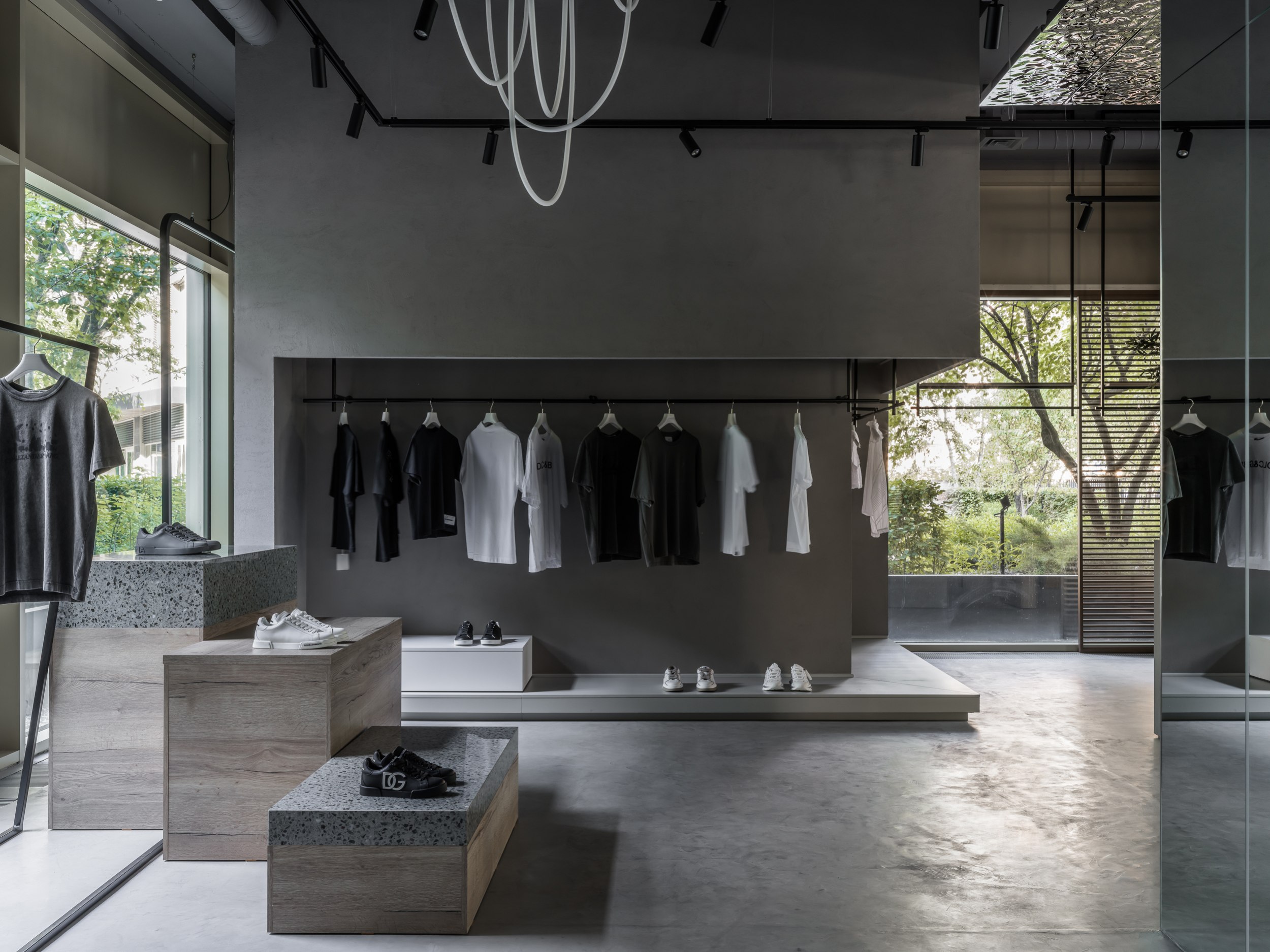 Торговое пространство организовано максимально удобно и эстетично: предусмотрены различные варианты экспонирования одежды, продуманная эргономичная кассовая зона и две просторные примерочные. Однако функциональность не ограничилась исключительно торговыми задачами – внутри проекта возник целый мир, который выходит далеко за рамки привычного ритейла.