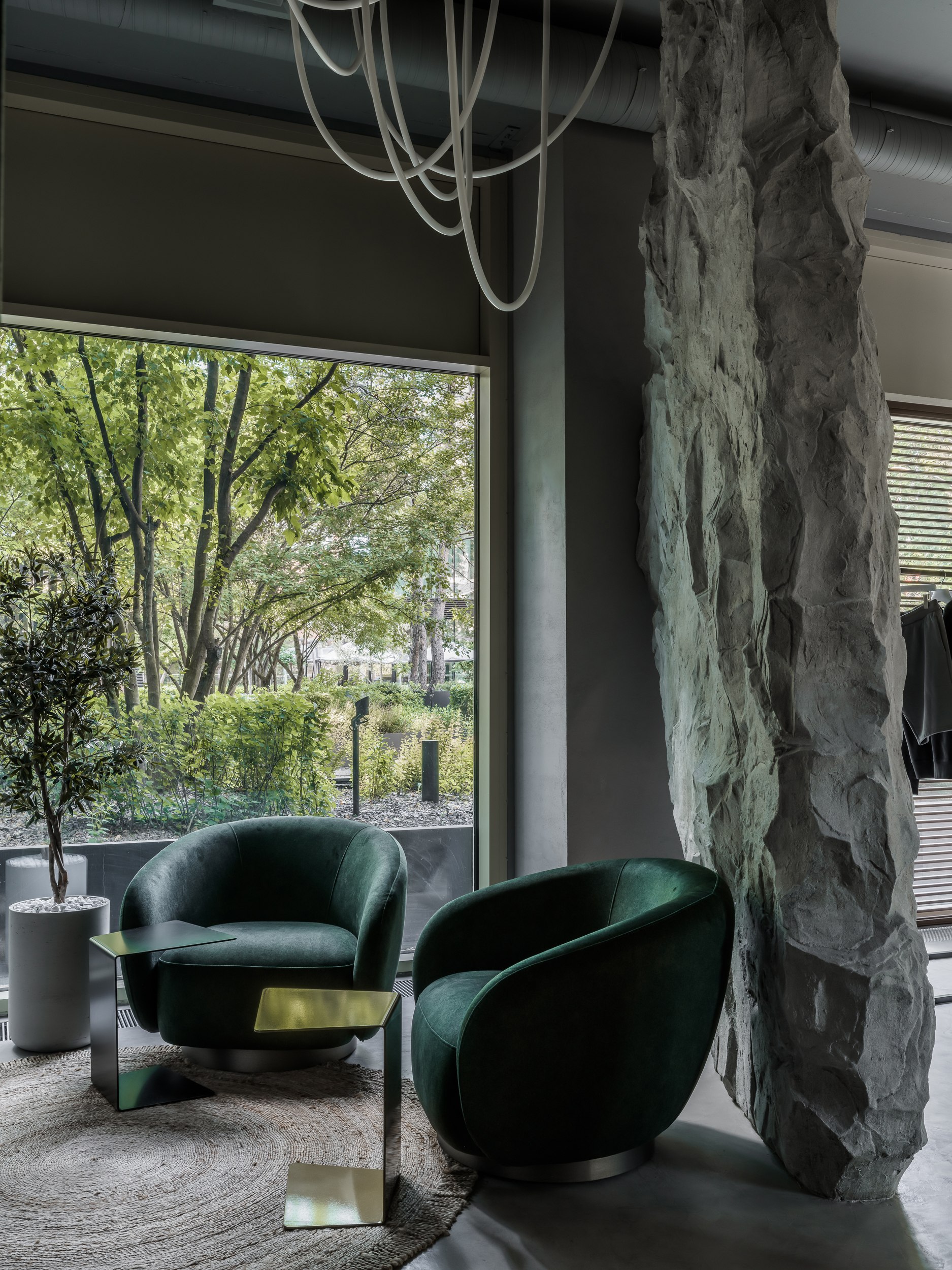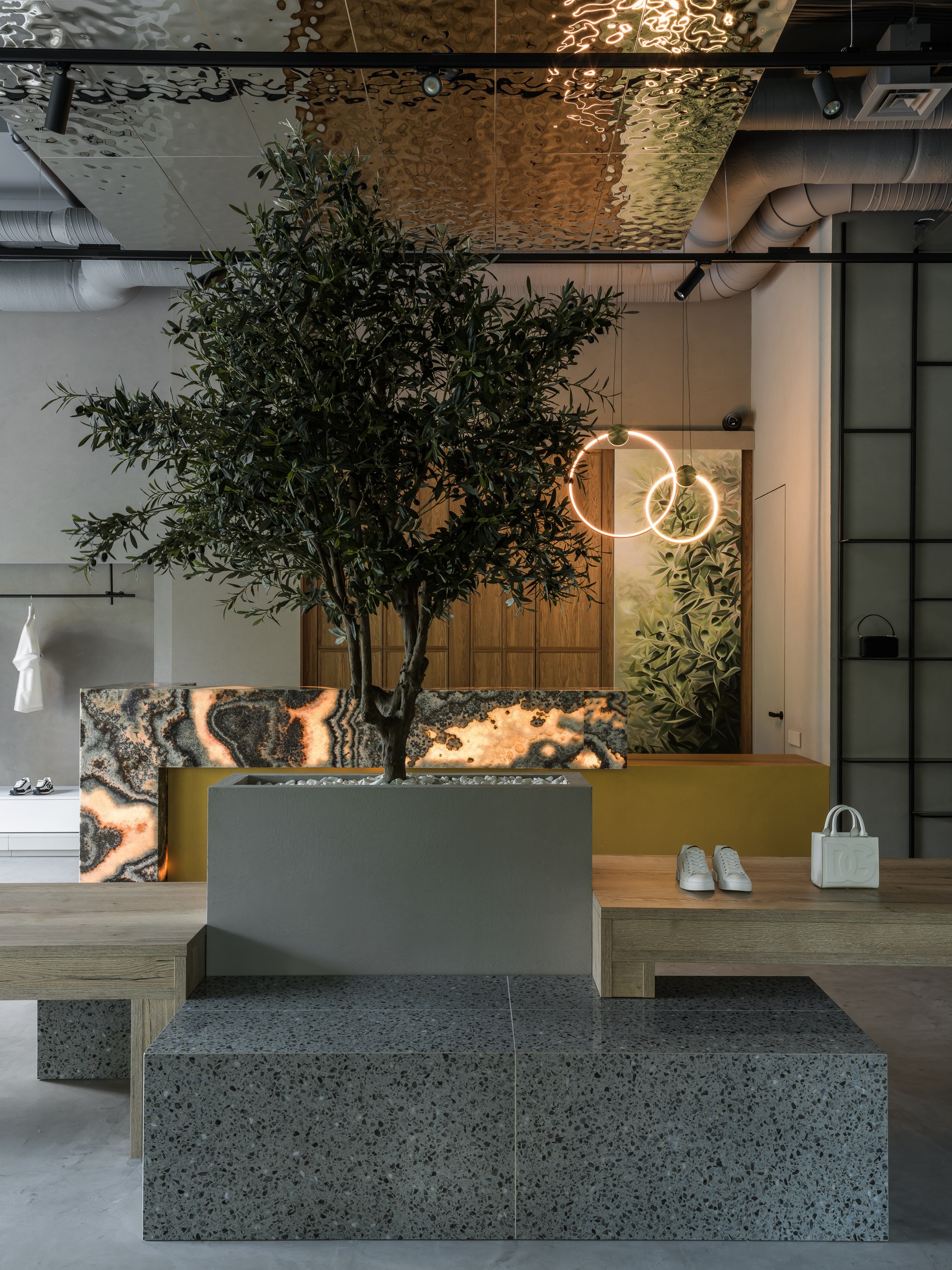 Центральная часть бутика превращается в настоящий манифест архитектурной поэзии. Оливковые деревья, установленные прямо в торговом зале, создают ощущение средиземноморского ландшафта, а тумбы из керамогранита под терраццо приглашают присесть и зарядить телефон. Композицию дополняет декоративная скала – выразительный арт-объект, задающий эмоциональный акцент.