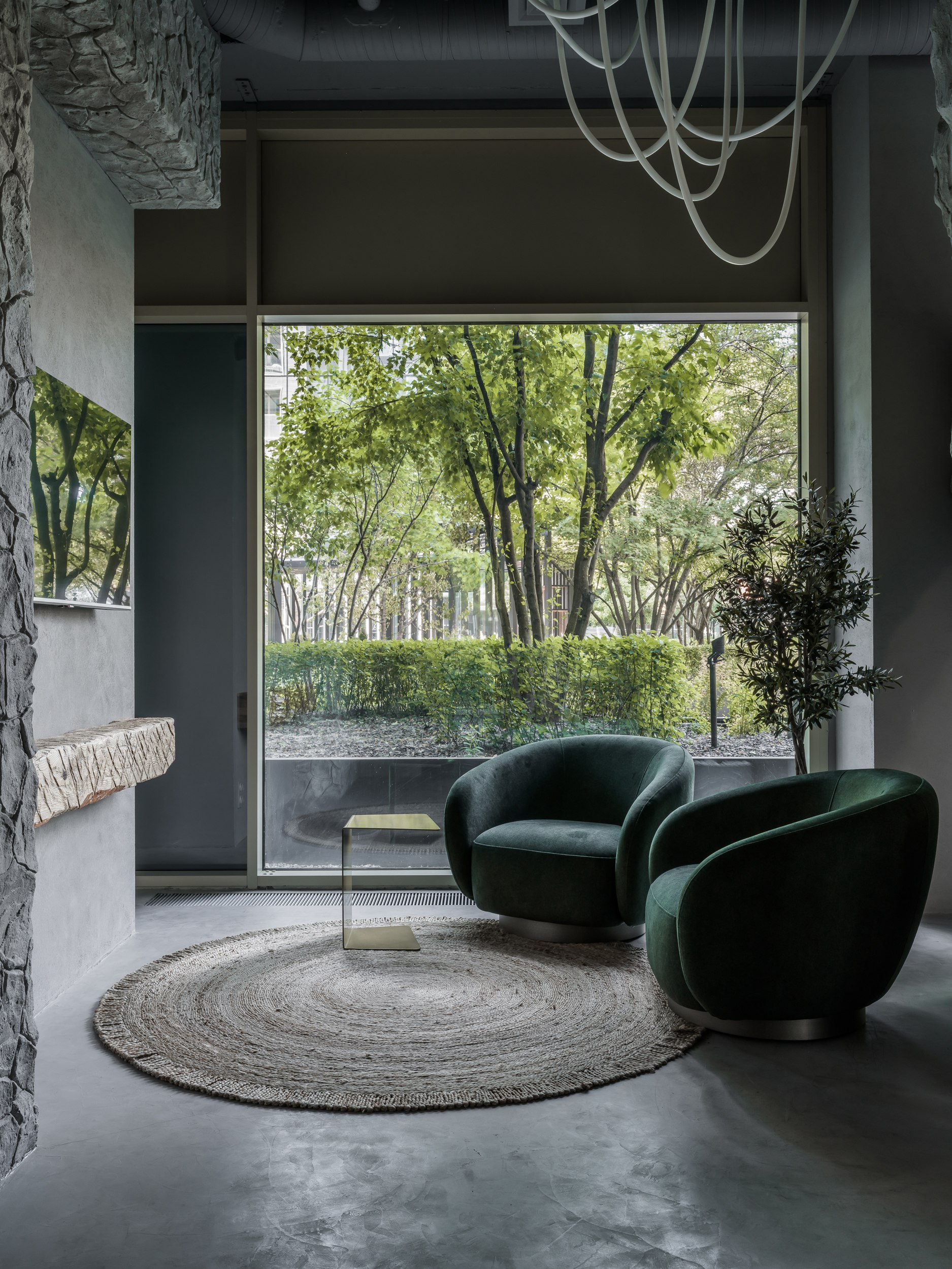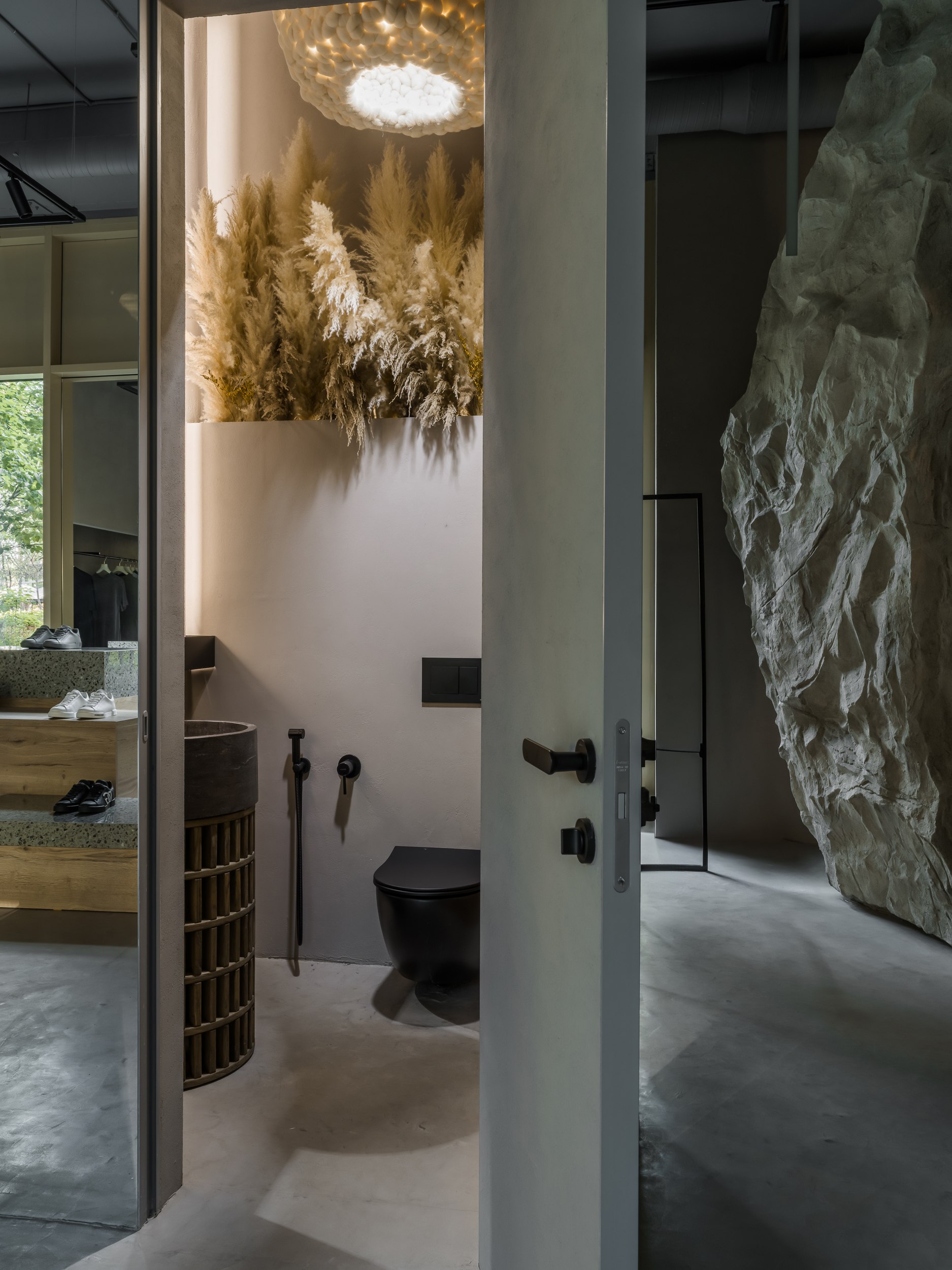 Кассовая стойка выполнена из выразительного натурального оникса, а потолок украшают панели «Рябь на воде». Нейтральный бетонный пол и намеренно потрескавшаяся штукатурка на чёрных полуколоннах – детали, имеющие ассоциативный и символический характер. Интерьер остаётся минималистичным, но не холодным – наоборот, он наполнен эмоцией и живой материей пространства.