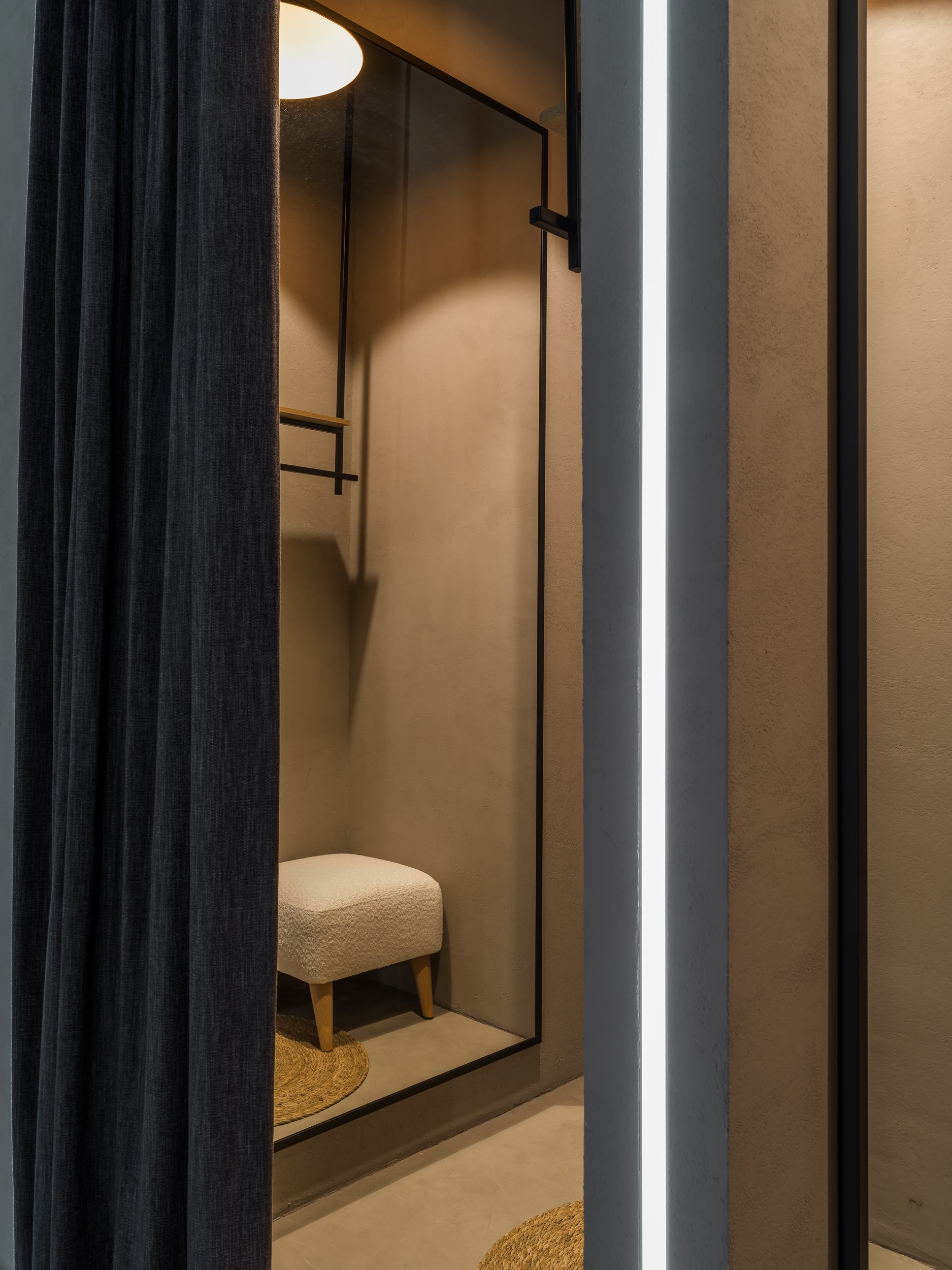 Так, в бутике размещена полноценная фотостудия с циклорамой – профессиональное пространство для модных съёмок и создания визуального контента. Зона ожидания рядом с примерочными задумана как камерное и атмосферное место для отдыха. Здесь можно не только расслабиться, но и выпить кофе – для этого предусмотрена небольшая, но уютная кухня.