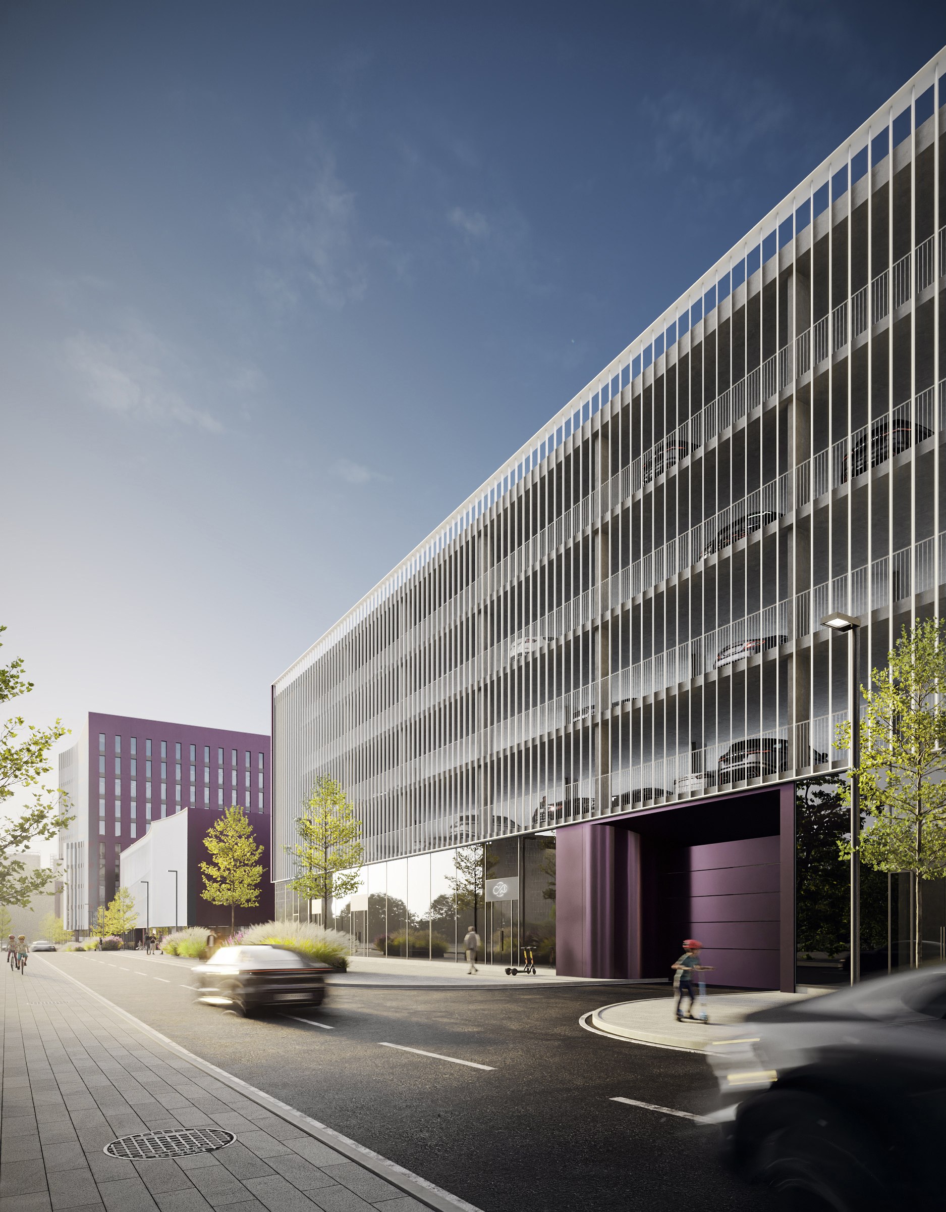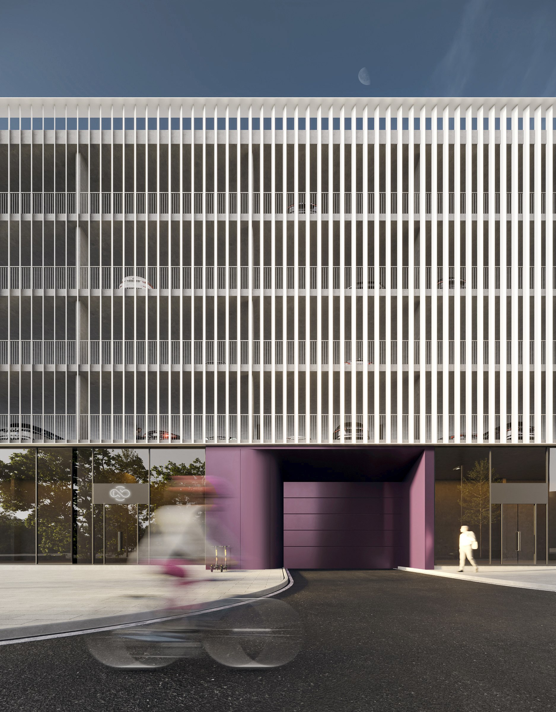 Фасады паркинга будут повторять архитектурные приемы основного здания, для отделки применят белые ламели с частым шагом.