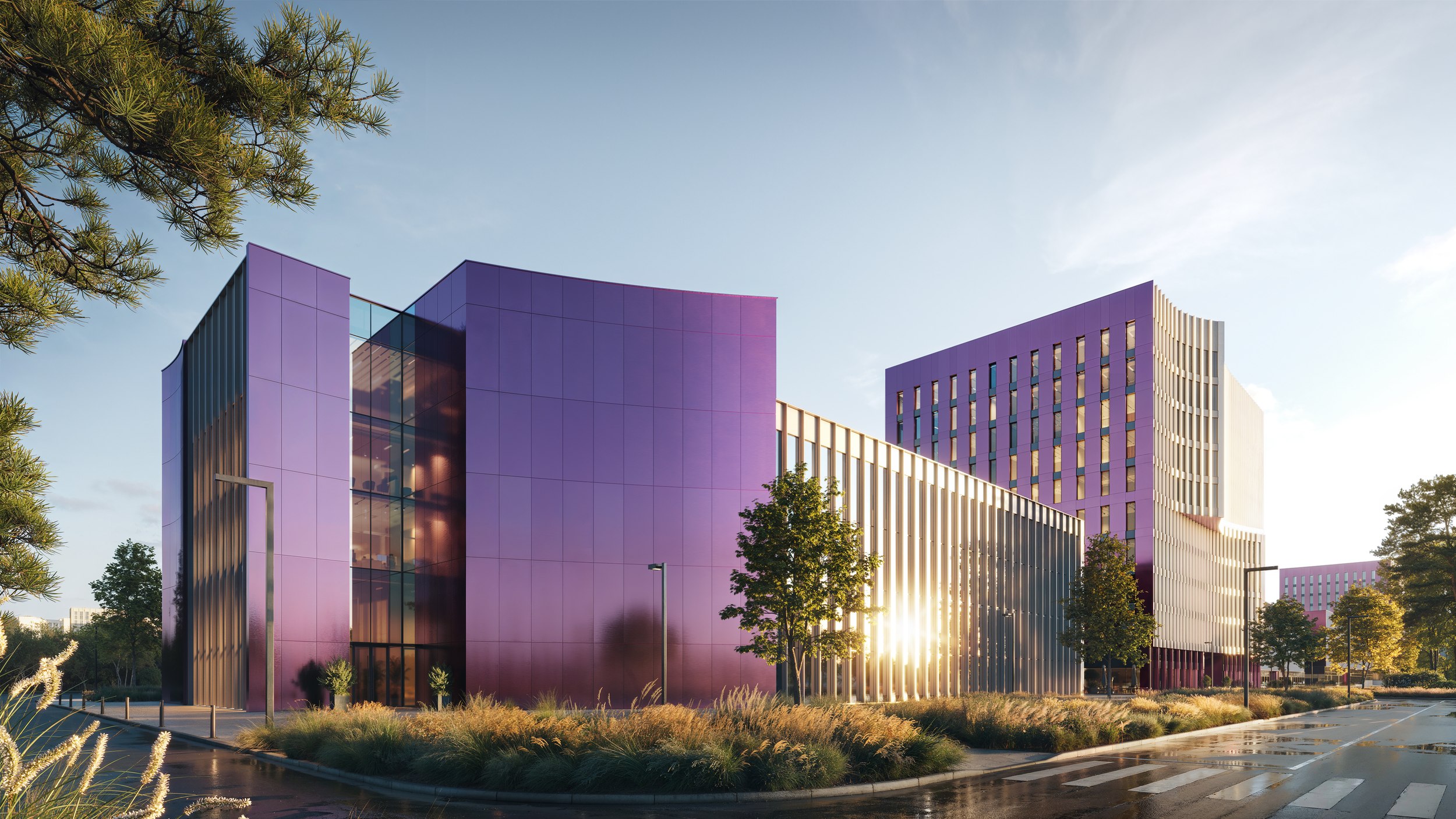 Облик здания формируют светлые фасады, панорамное остекление и динамичные объемы, создающие ритм и гармонию. Белый цвет дает ощущение чистоты и воздушности, а металл сливового оттенка придаст акцент визуальному образу. Архитектурные элементы первого уровня расположатся под углом.