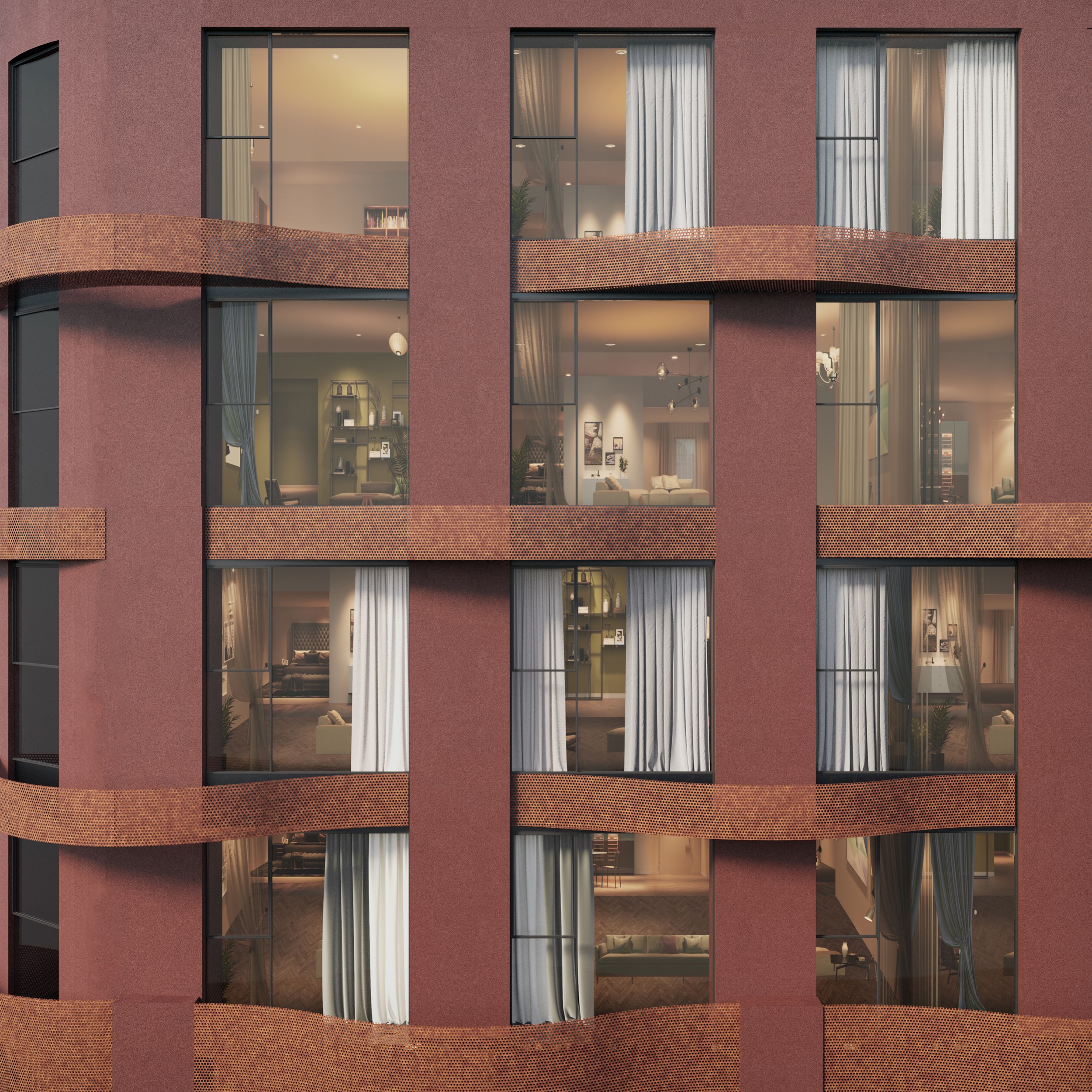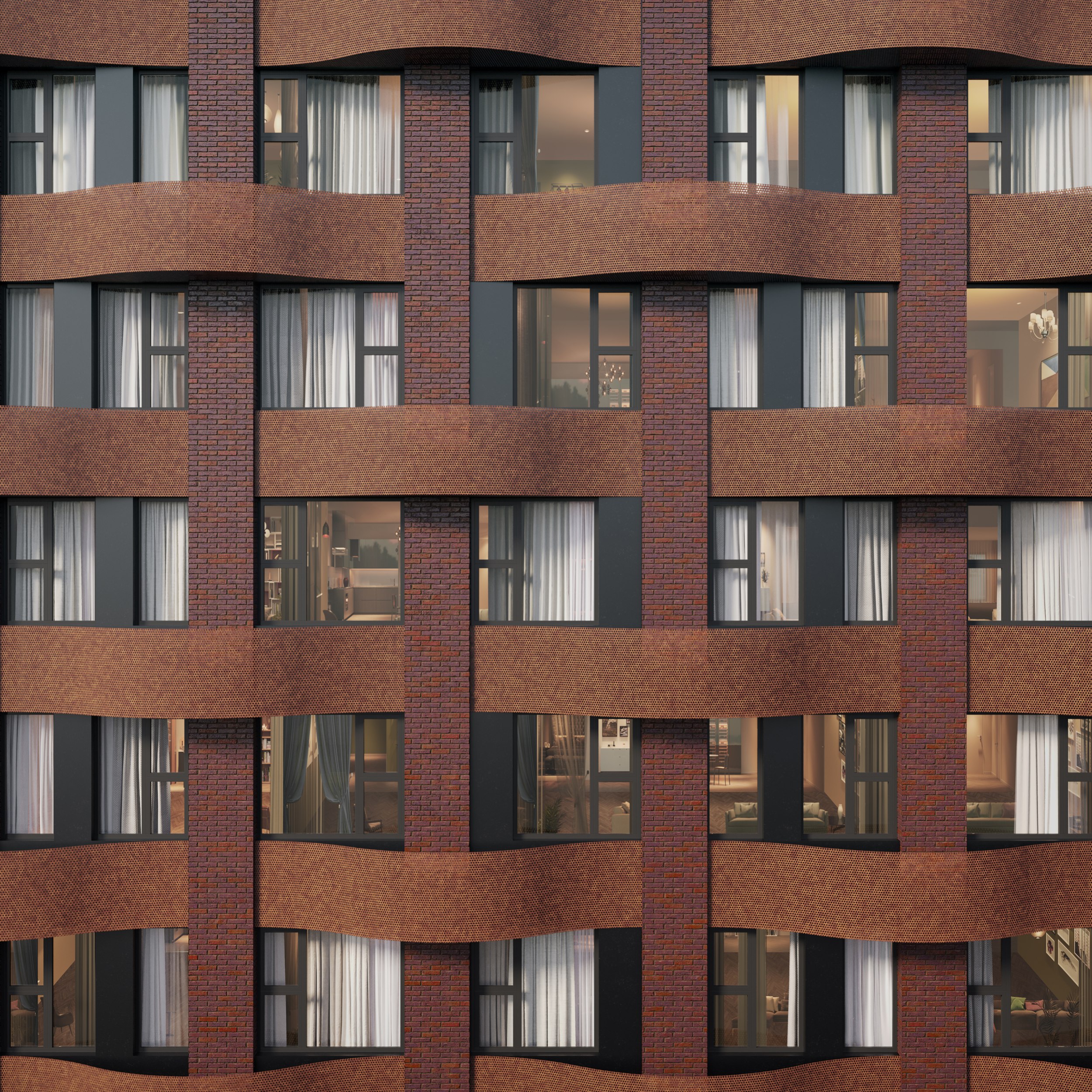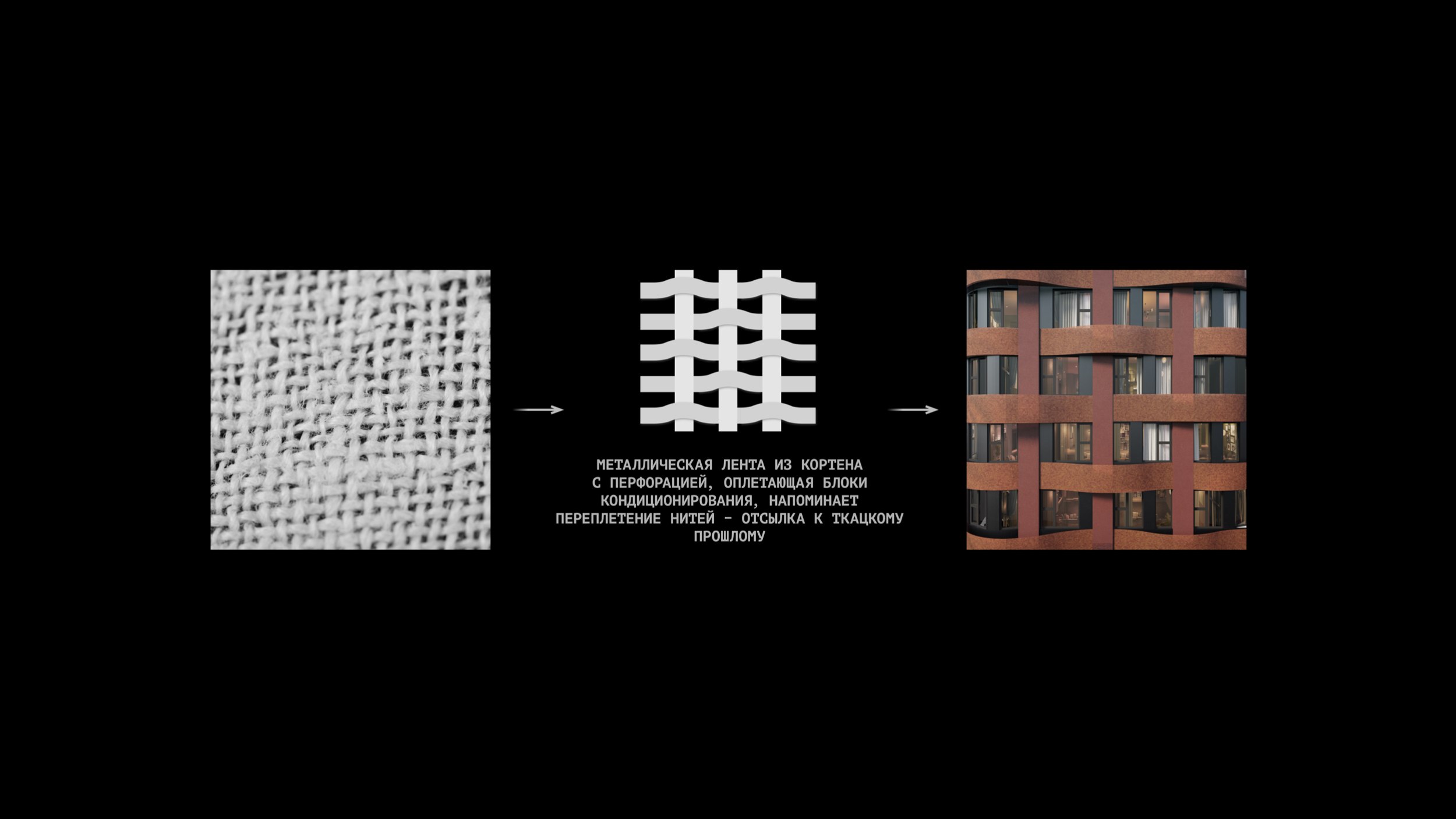 Архитекторы KPLN переосмыслили текстильную тему через эстетику фасадов: металлическая лента из кортена с перфорацией, оплетающая блоки кондиционирования, напоминает переплетение нитей – отсылка к ткацкому прошлому. Терракотовые вставки под клинкерный кирпич связывают комплекс с историей и дореволюционной застройкой.