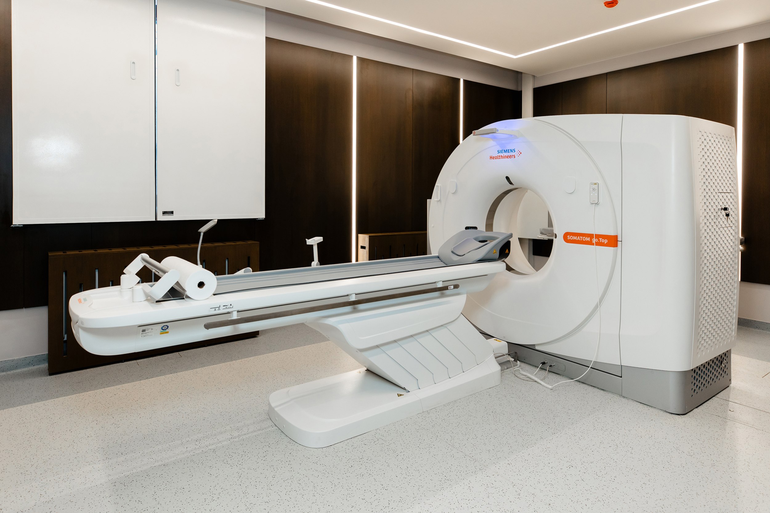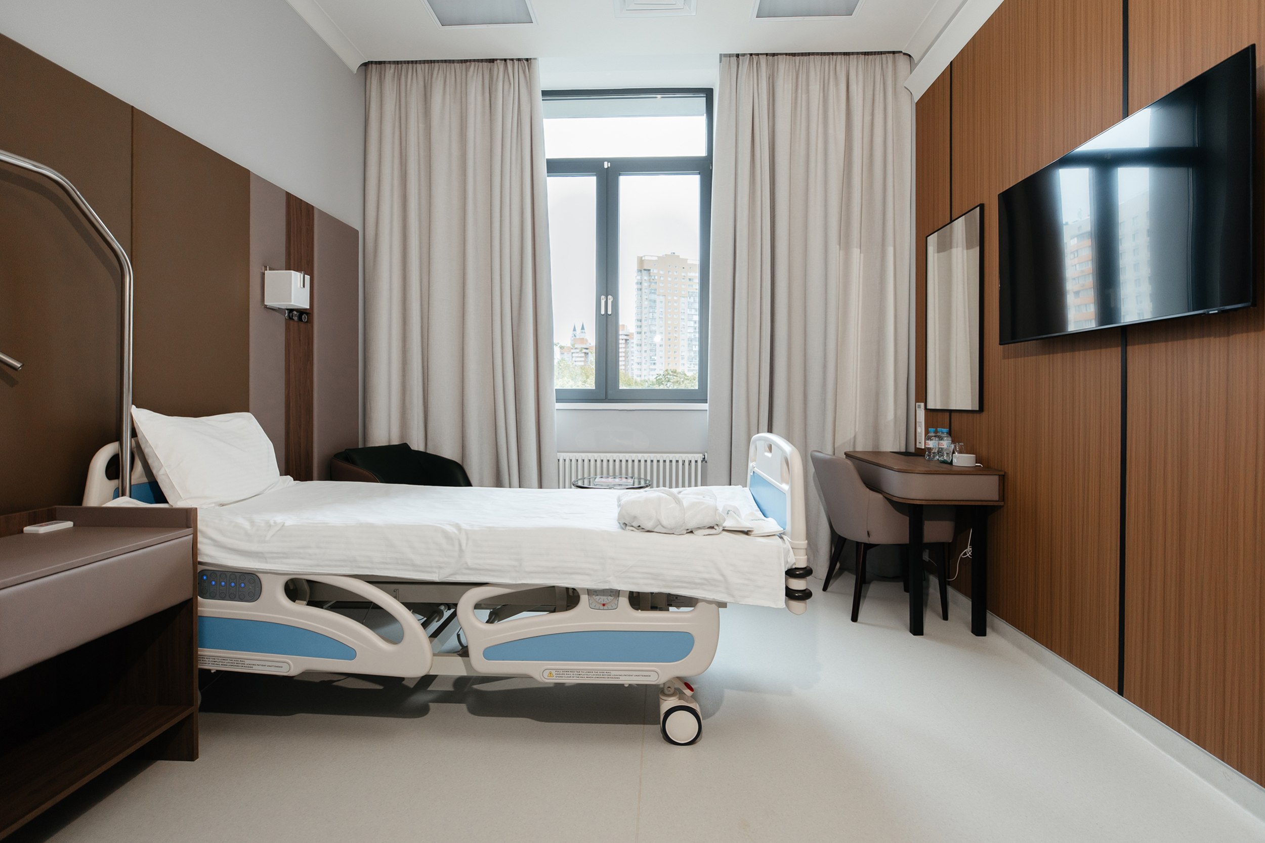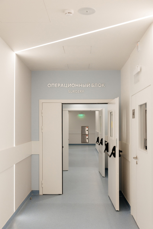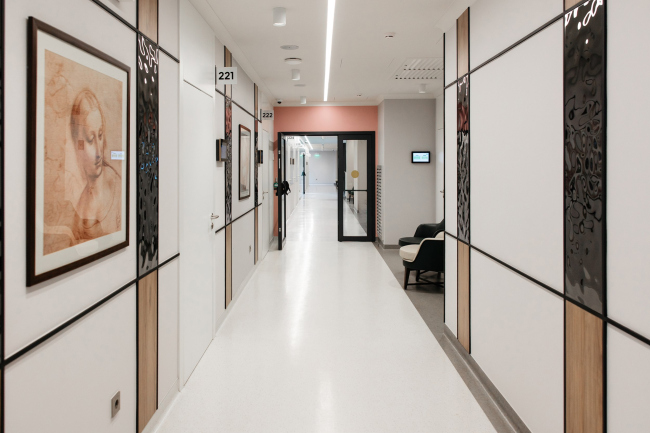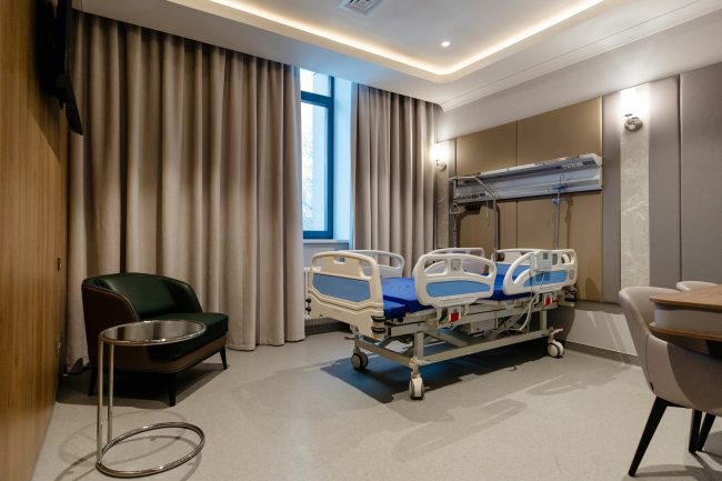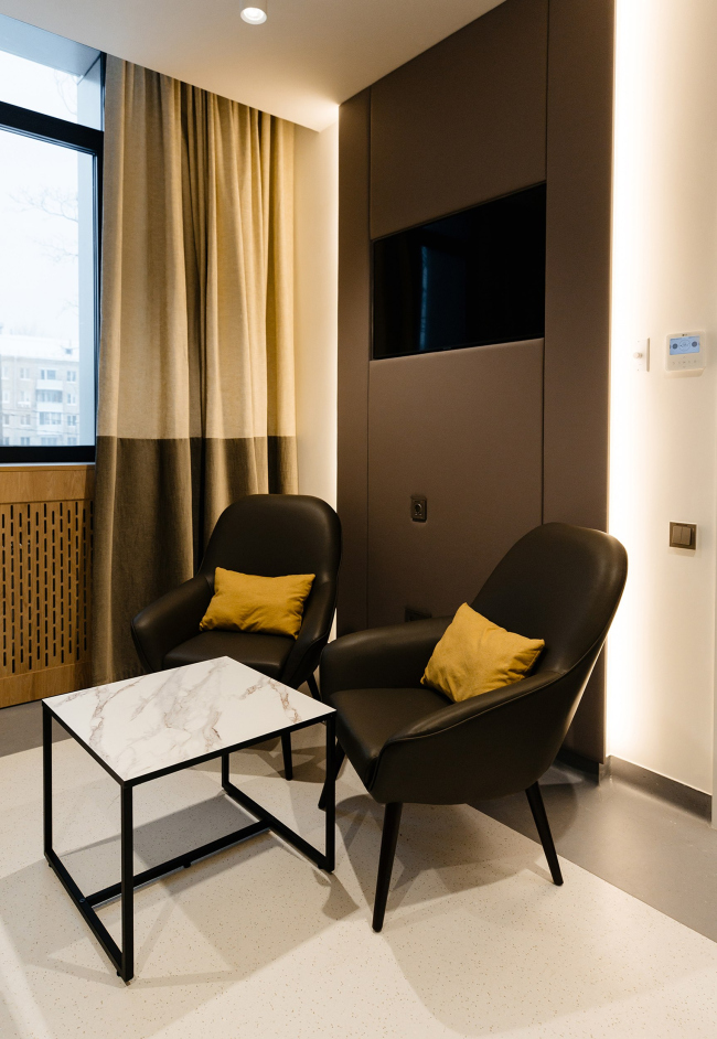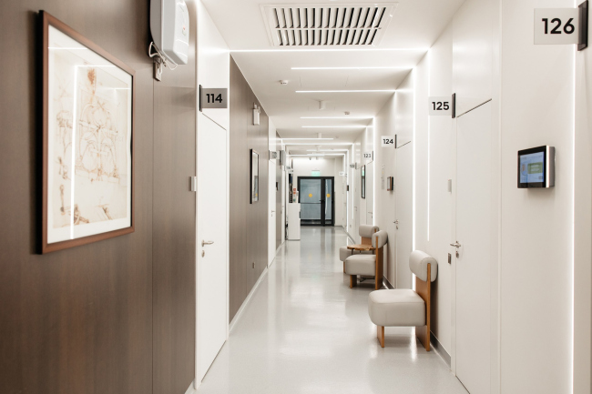 Интерьер стремится к балансу технологичности и человеческого масштаба. Светлые нейтральные поверхности сочетаются с тёплыми фактурами и мягким, рассеянным светом. В палатах стационара предусмотрены «домашние» зоны отдыха с лаунж-мебелью и вариативными световыми сценариями – так пребывание воспринимается не как госпитализация, а как заботливое сопровождение.