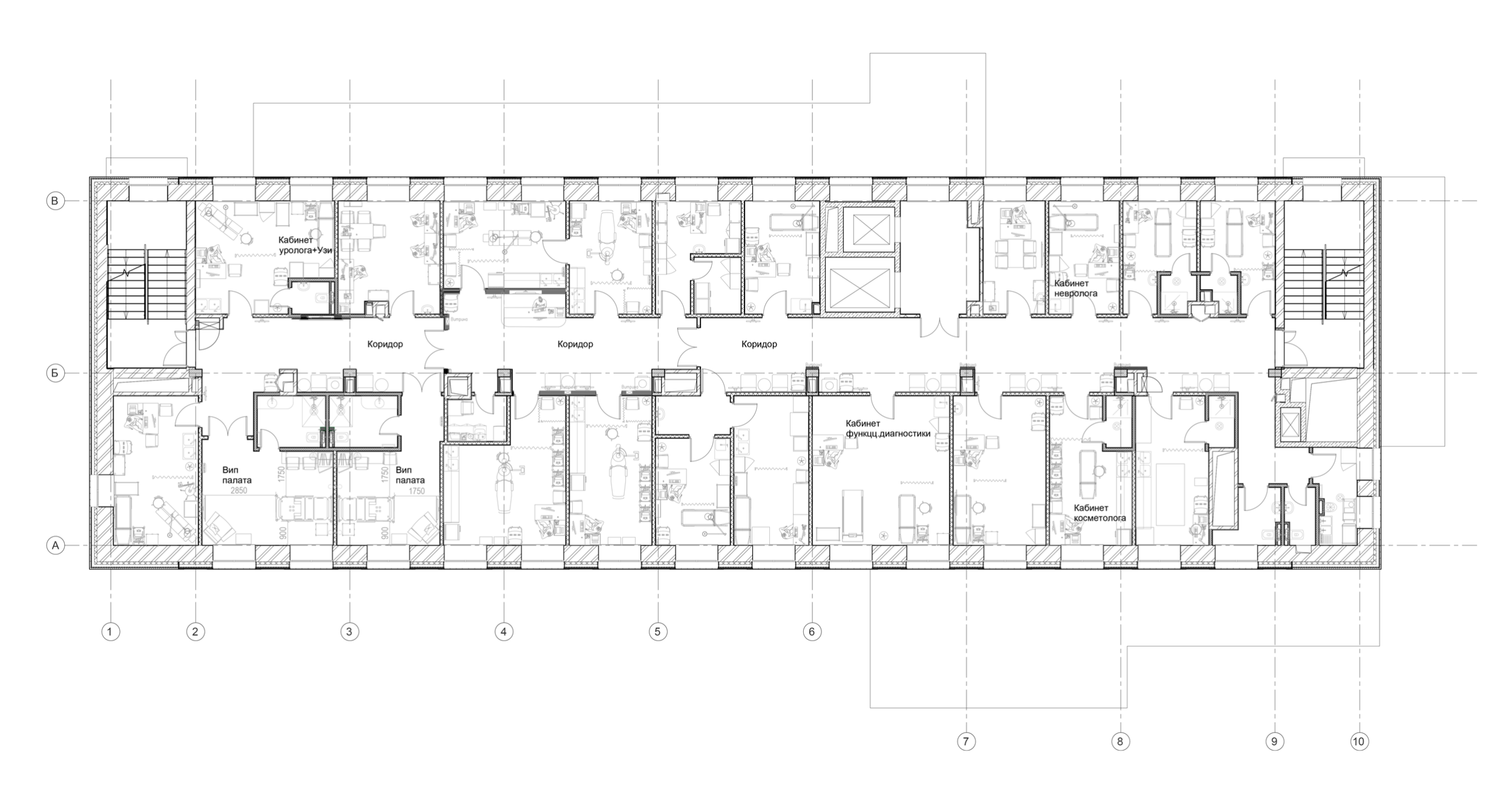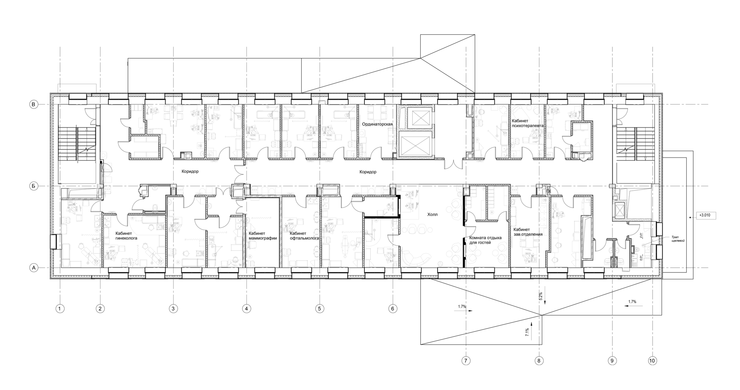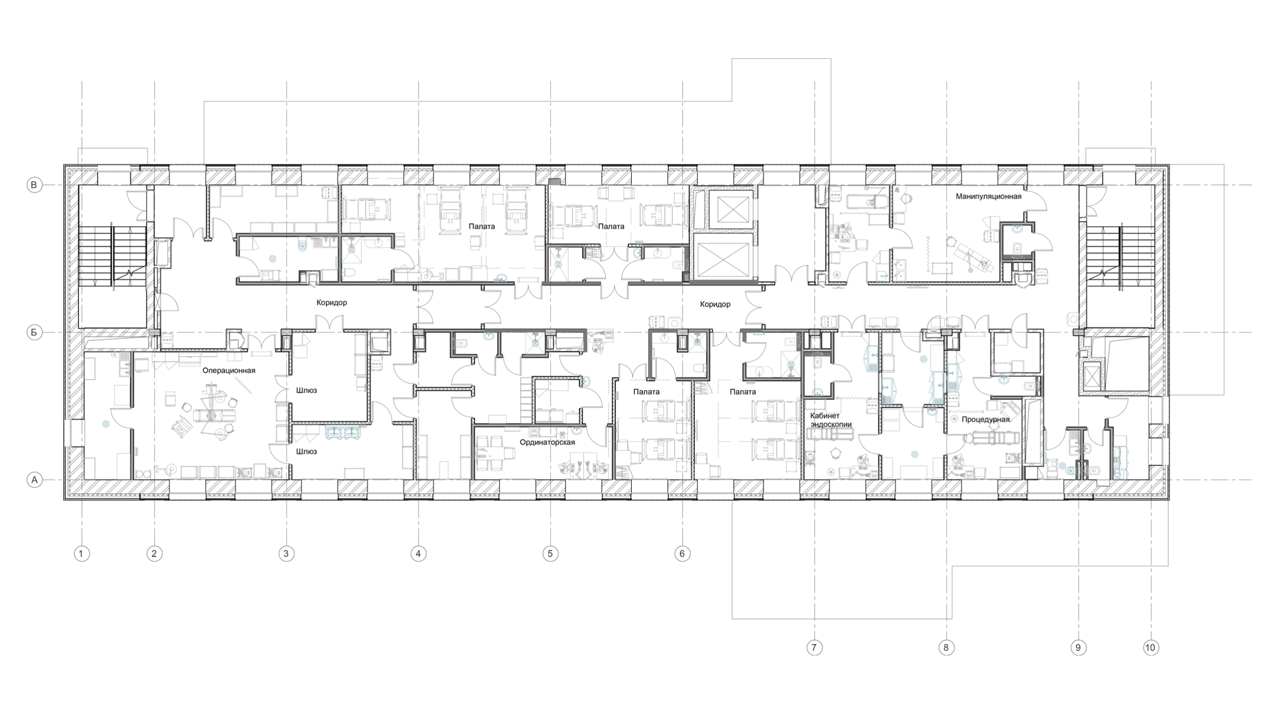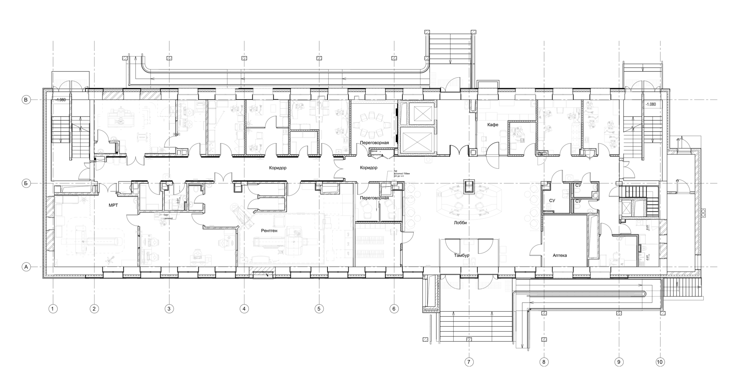 Планировочная структура организована вокруг центрального ресепшн-узла: от него расходятся направления к диагностическому блоку, стационару и отделению превентивной медицины. Такое решение обеспечивает интуитивно понятный маршрут, сводит к минимуму пересечения потоков и создаёт логичный, ориентируемый «скелет» пространства. Внутри формируются ясные перспективы и выразительные визуальные ориентиры, что упрощает ориентацию в большом комплексе.