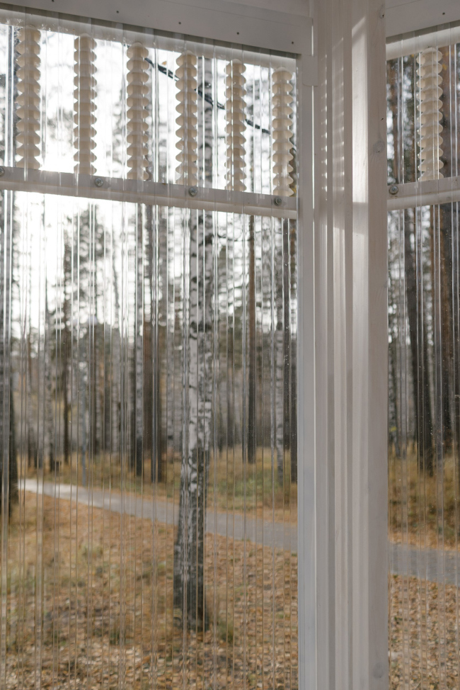 Во время совместных прогулок команда заметила характерную деталь поселка: керамические изоляторы от высоковольтных линий, которые здесь используют как цветочные вазоны. Эти изоляторы стали элементами фриза, опоясывающего ротонду, и одновременно – распорками для стоек: так художественный образ стал частью конструктивного решения.
