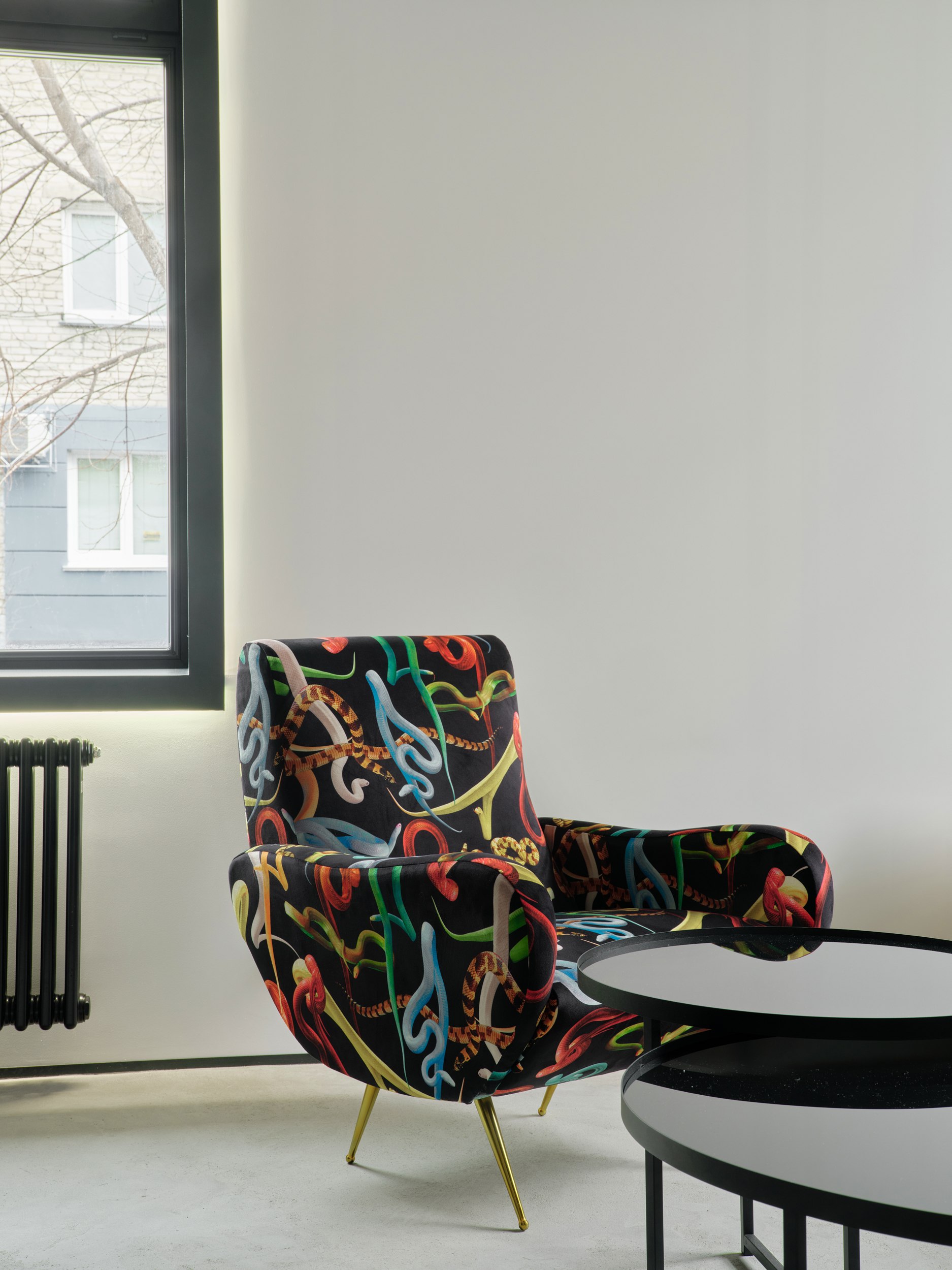 Бунтарский дух поддерживает дерзкий декор от Seletti. Кресло со змеиным принтом встало в пару с диваном, над рисунком которого поработали художники студии. Поверх белой обивки дивана легли самые настоящие граффити.