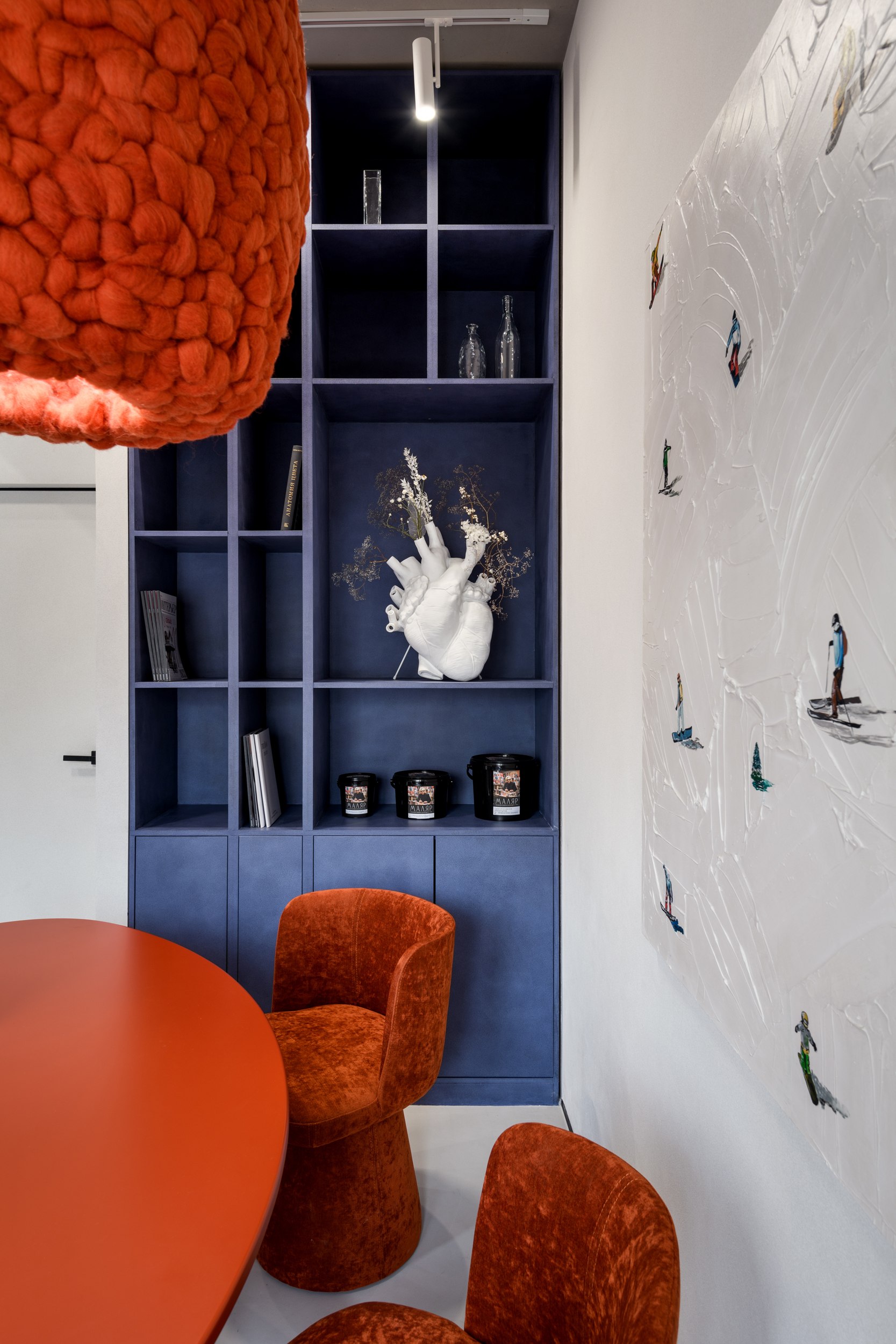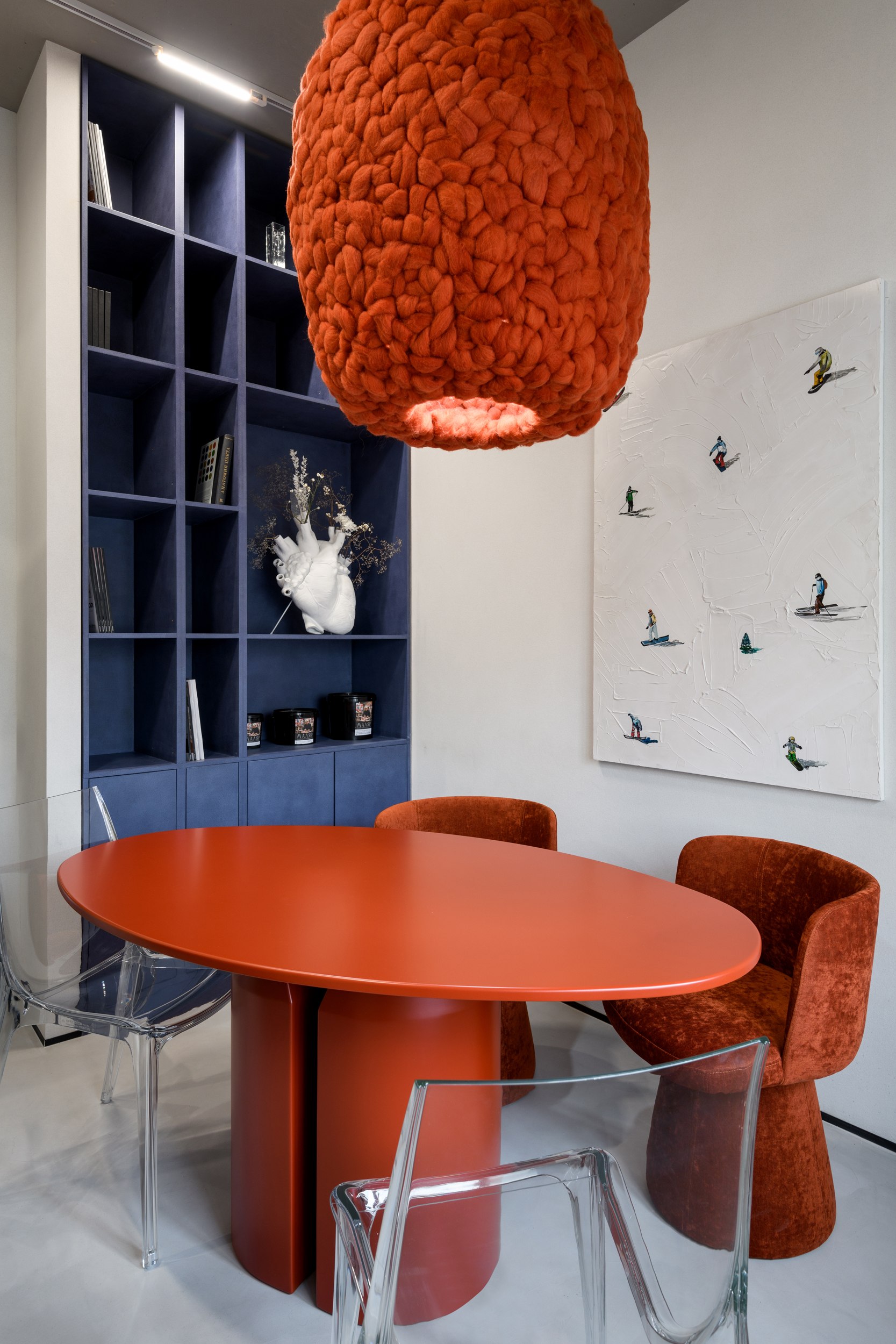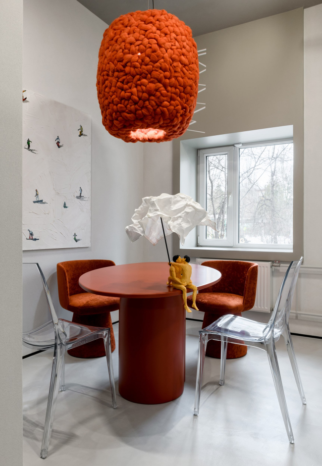 Мягкая шерстяная люстра в ярком оттенке терракоты стала центром притяжения не только этого места. Эта люстра также принимала участие в Алтайском форуме дизайнеров и стала любимчиком посетителей выставки.