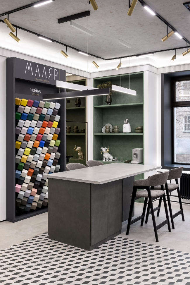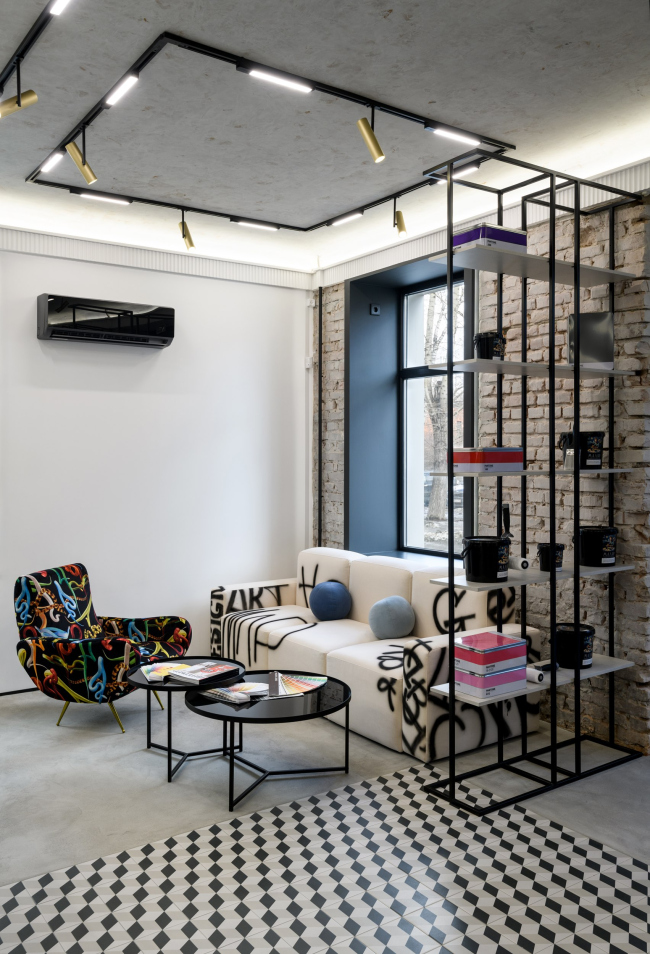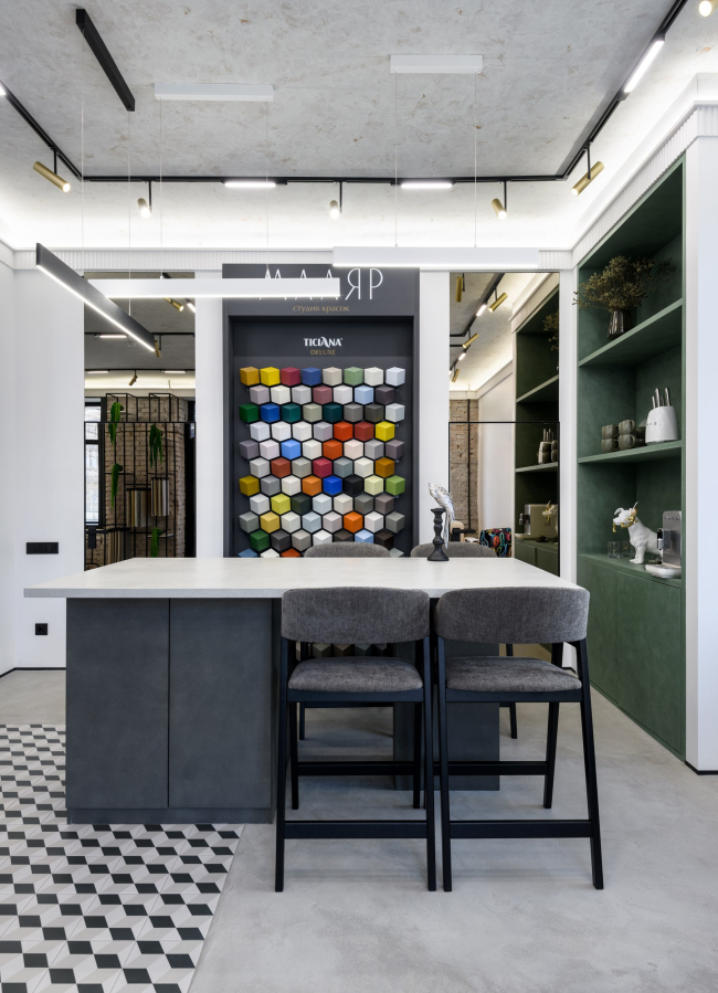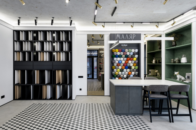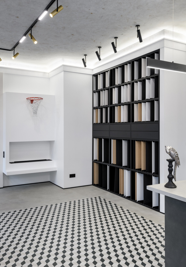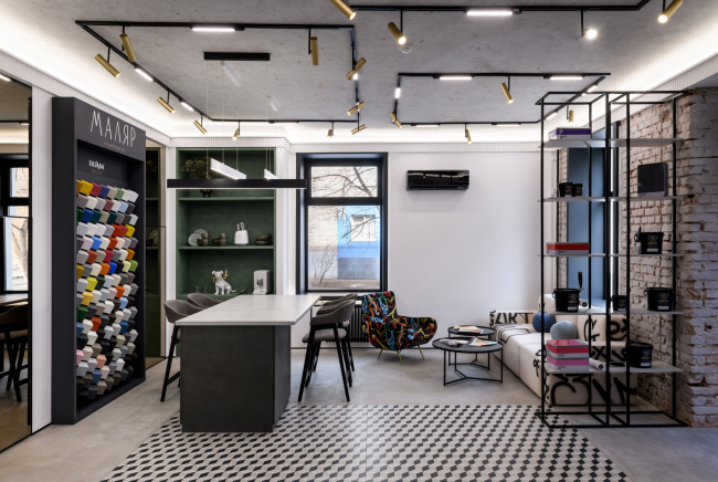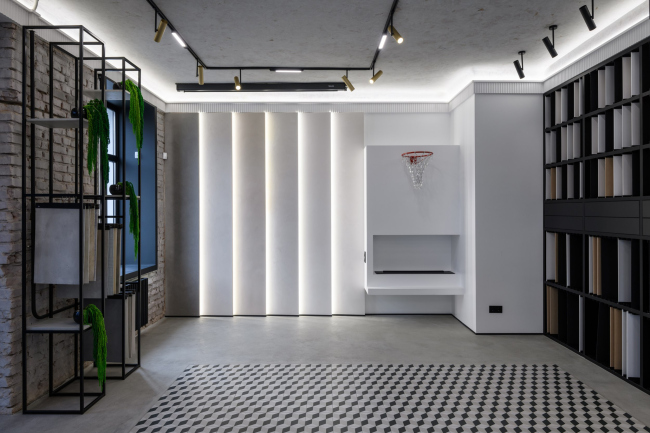 Заказчик пришел с задачей создать место вдохновение для дизайнеров и покупателей. Показать не «красивые стены», а идеи и материалы, которые меняют ощущение от интерьера.