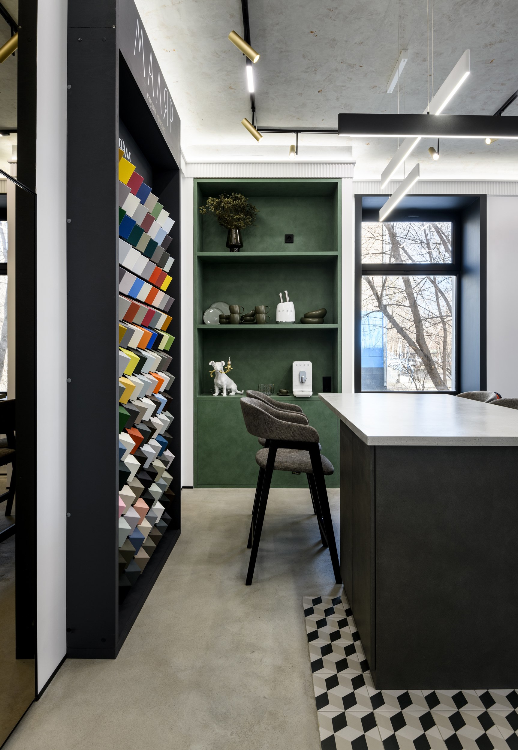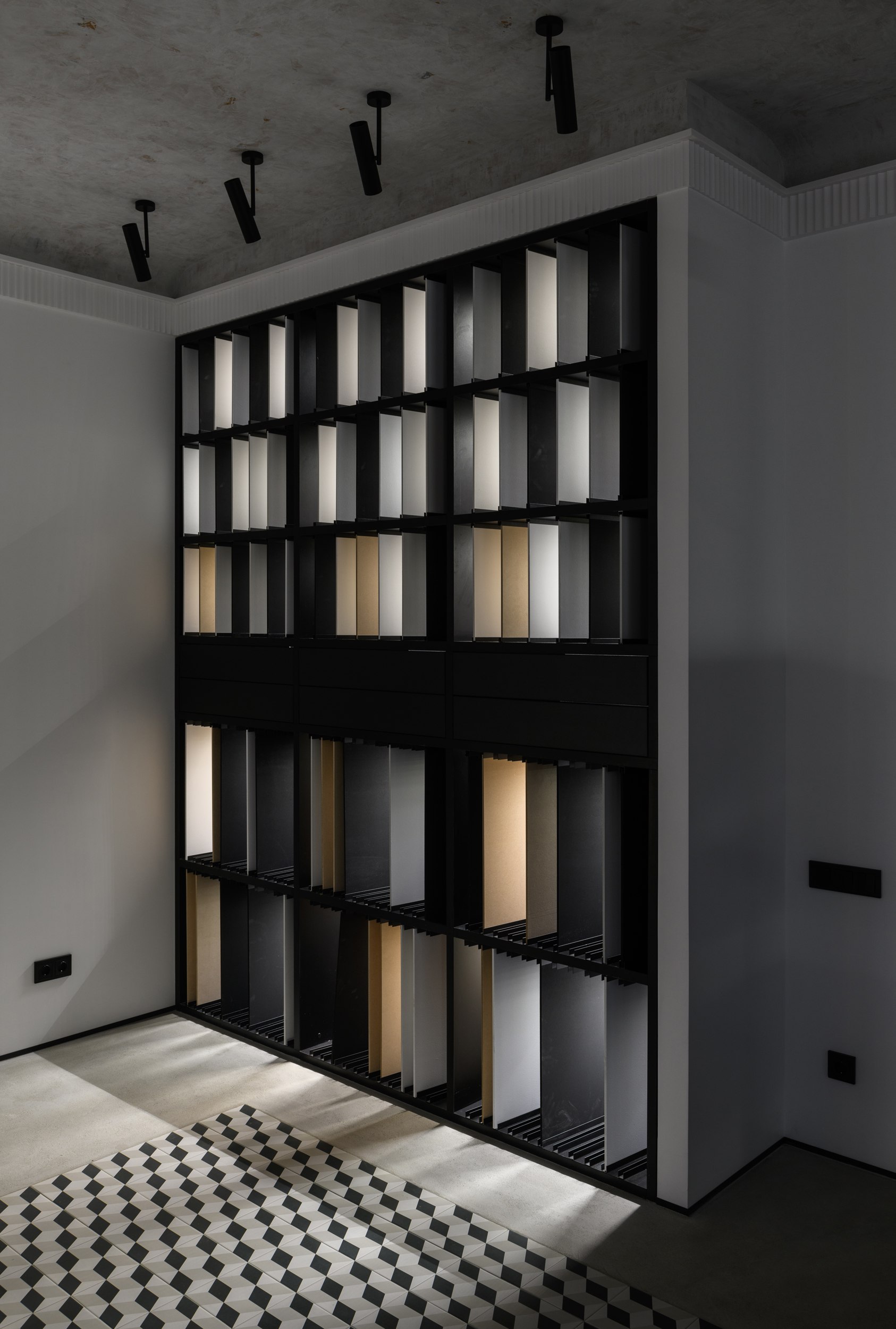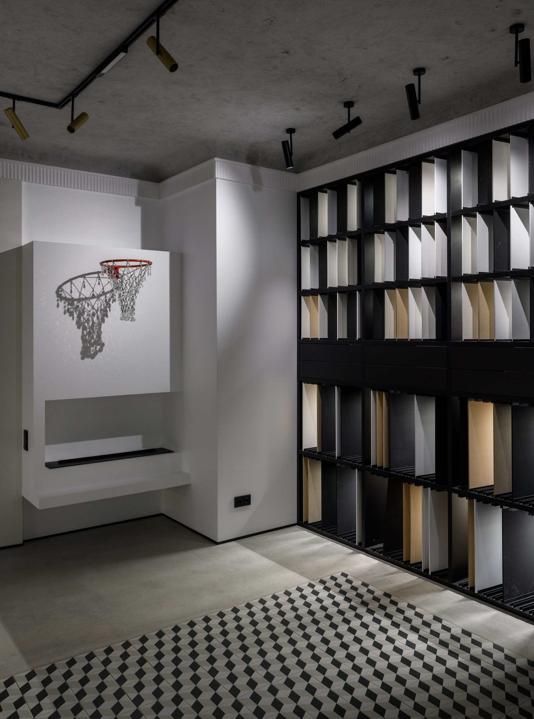 Заказчик пришел с задачей создать место вдохновение для дизайнеров и покупателей. Показать не «красивые стены», а идеи и материалы, которые меняют ощущение от интерьера.