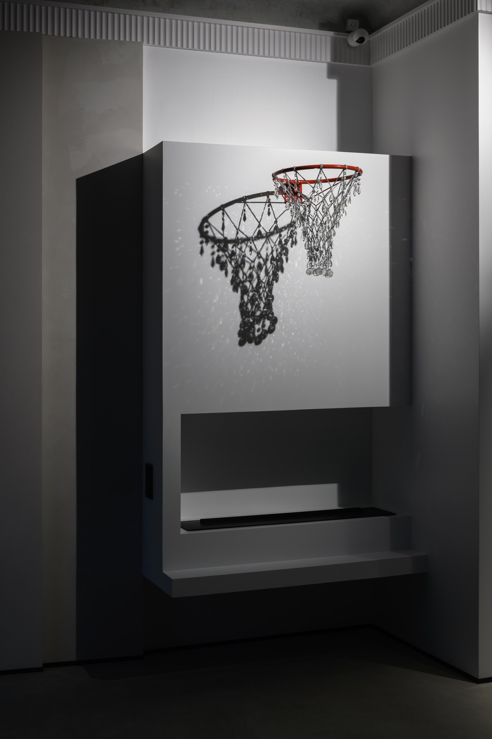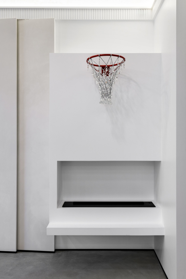 Периметр изящно обрамлен фактурным багетом. Теплый акварельный винтажный, но в то же время современный – это все про потолок. Сложная фактура идеально соединилась с оттенком кирпича. Пол – сочетание фактуры сложного бетона и строго упорядоченного рисунка плитки. Каминную зону венчает декор в виде баскетбольного кольца, инкрустированного кристаллами.