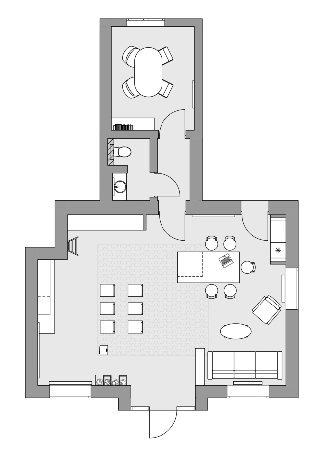В отдельных помещениях находятся кабинет руководителя и техническое помещение для работы с краской и штукатуркой. Кабинет – место уединения. Когда ежедневно имеешь дело с обилием разных цветов и оттенков, хочется вернуться к чистому листу. Кабинет – как раз этот самый чистый лист. База, которая может транформироваться даже исходя из настроения.