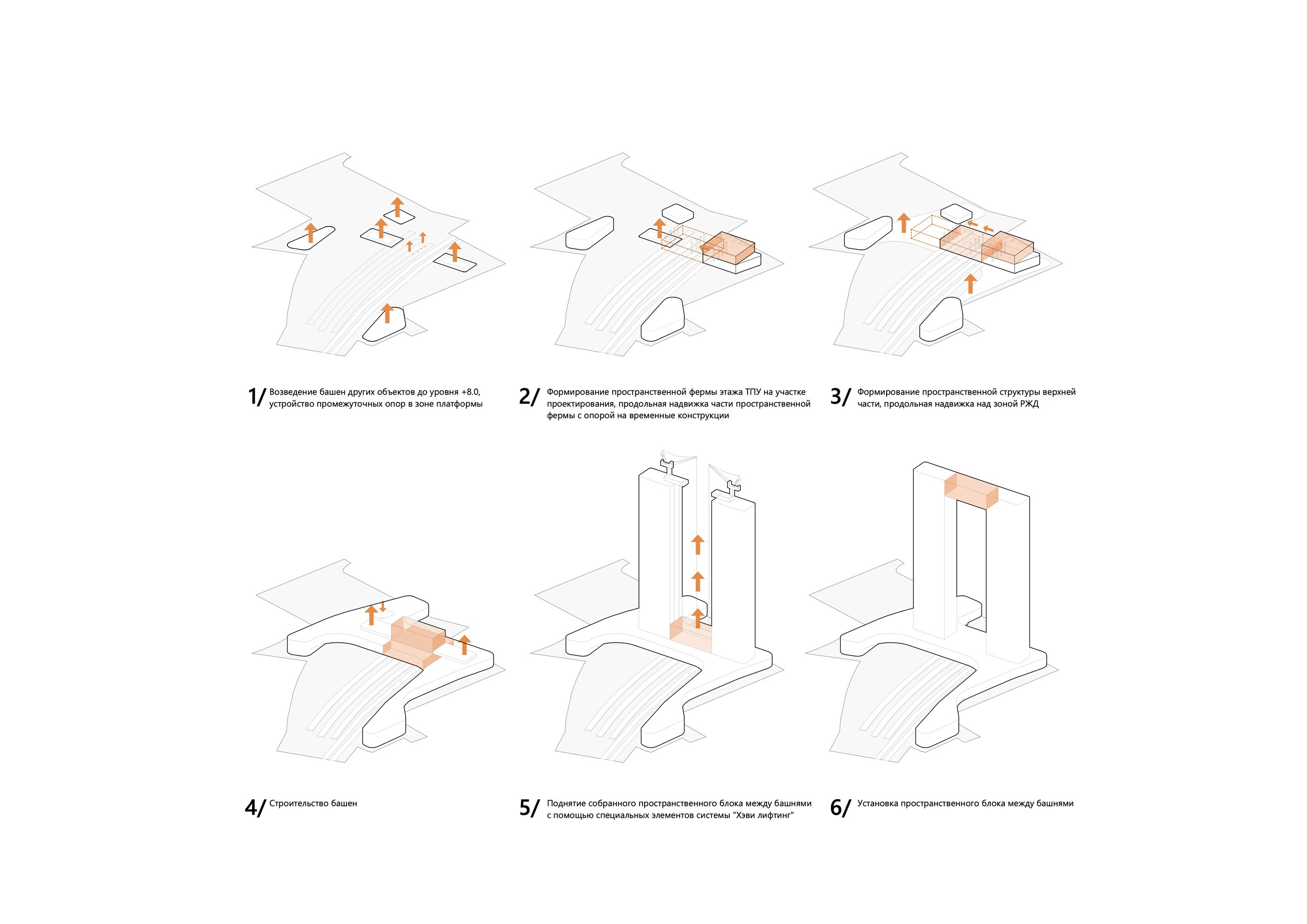 Конструкция здания представляет собой уникальную высокотехнологичную структуру, разработанную нашими инженерами – конструкторами. После строительства двух высотных объемов на свободном участке монтируется многоуровневая структура, которая поднимается кранами на высоту 250 метров без перекрытия движения по проспекту и МЦД. Пространство основного зала ТПУ также монтируется на земле как пространственная ферма, затем методом смещения с двух сторон сдвигается к центру при помощи временных опор на перронах и около шоссе. На кровле здания расположены вертолетные площадки для коммерческих такси и беспилотников, таким образом в будущем дорога от аэропорта до «окна» и Сити будет занимать несколько минут.