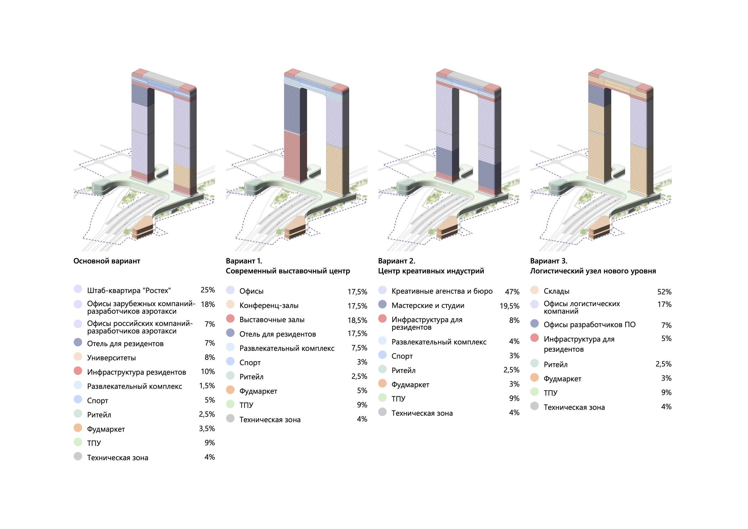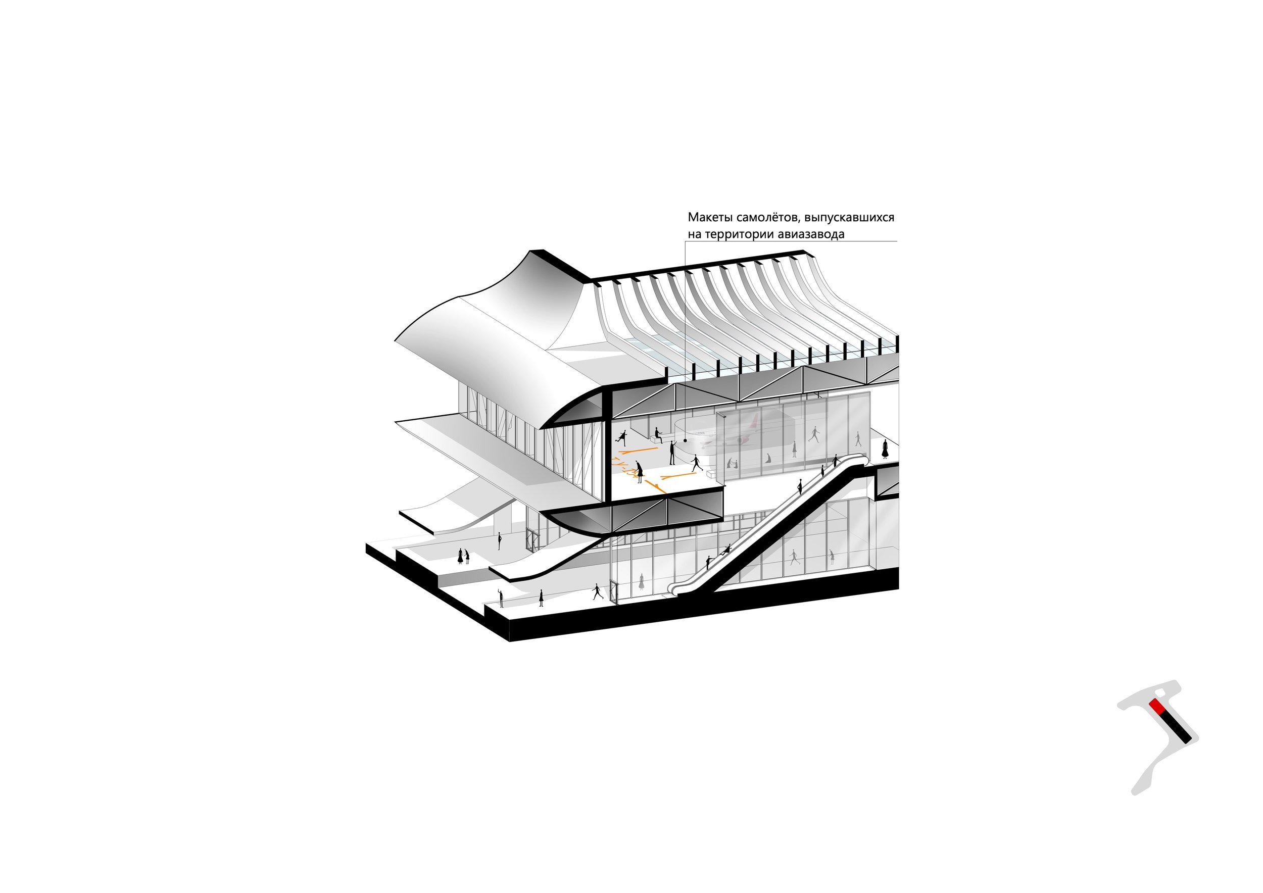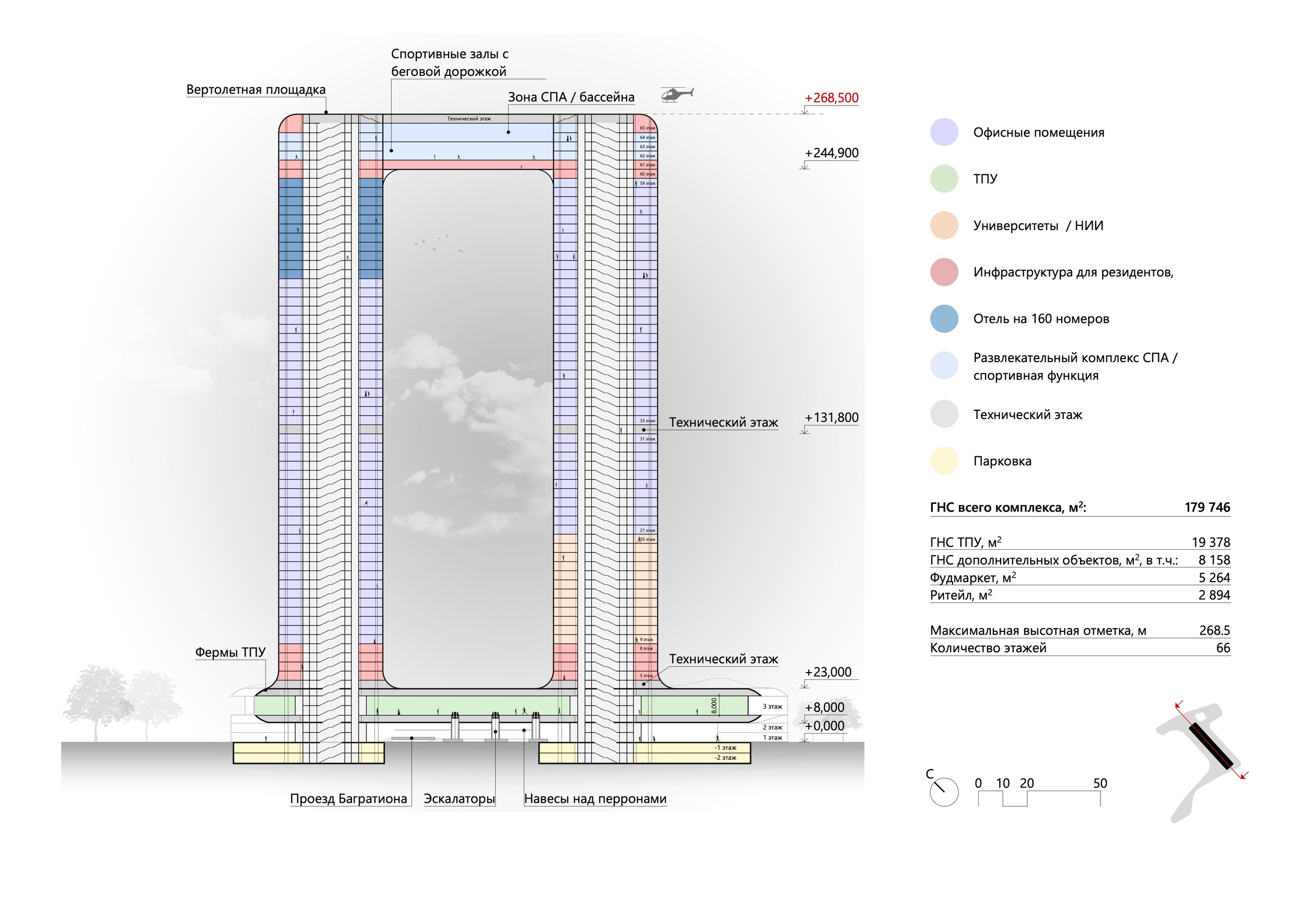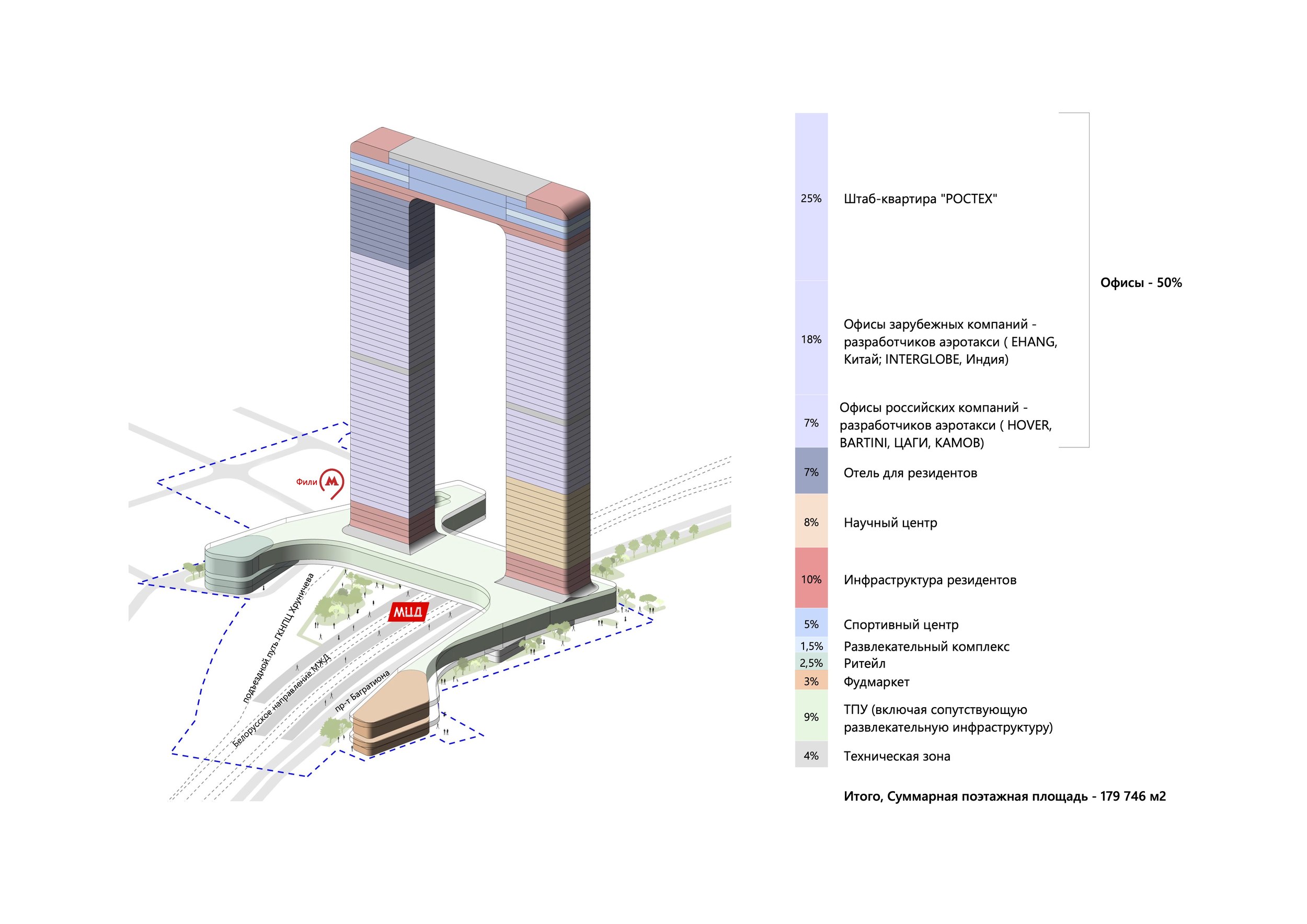 Концепция, разработанная большой сплоченнои командои специалистов разных направлении, воплощает яркии образ «дома – окна», состоящего из двух высоток и соединяющих их консольных уровнеи. При движении в центр города по проспекту Багратиона появляется знаковыи объект, в «раме» которого мы видим небоскребы Москва–Сити. В стилобатнои части расположено свободное от опор пространство транспортно–пересадочного узла, соединяющее станцию метро, линию МЦД, автобусныи терминал и пешеходные переходы через железнодорожные пути и проспект. Объем основного холла трактуется как современная интерпретация вокзалов начала XX века. Это потрясающее большепролетное сооружение, выполняющее не только утилитарную, но и эстетическую функцию, поражающее воображение посетителеи. Современныи «дворец» включает в себя экспозицию с моделями самолетов, производившихся на авиазаводе на этом месте, кафе и зоны отдыха. Кроме того, часть общественнои зоны, включающая спортивныи и развлекательныи центры, расположена на верхних этажах, пространства с уникальными видовыми раскрытиями на город и Москва–Сити станут доступны всем горожанам. В башнях представлены самые различные функции, предложенные нашими специалистами в результате функционального исследования окружающеи застроики.